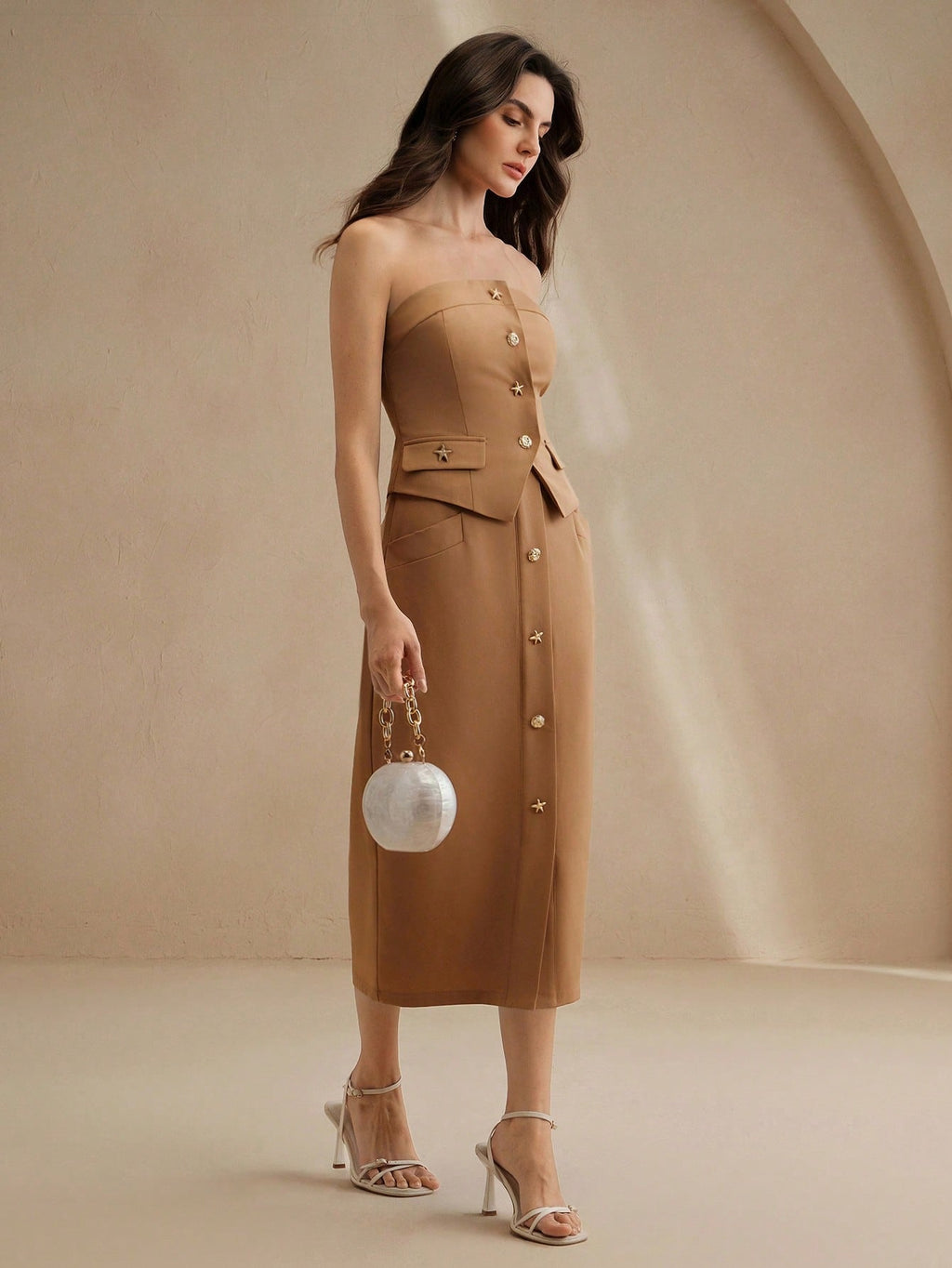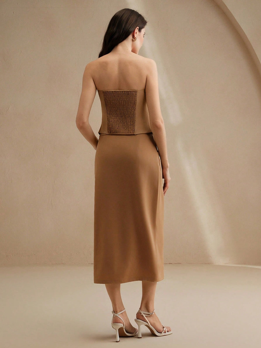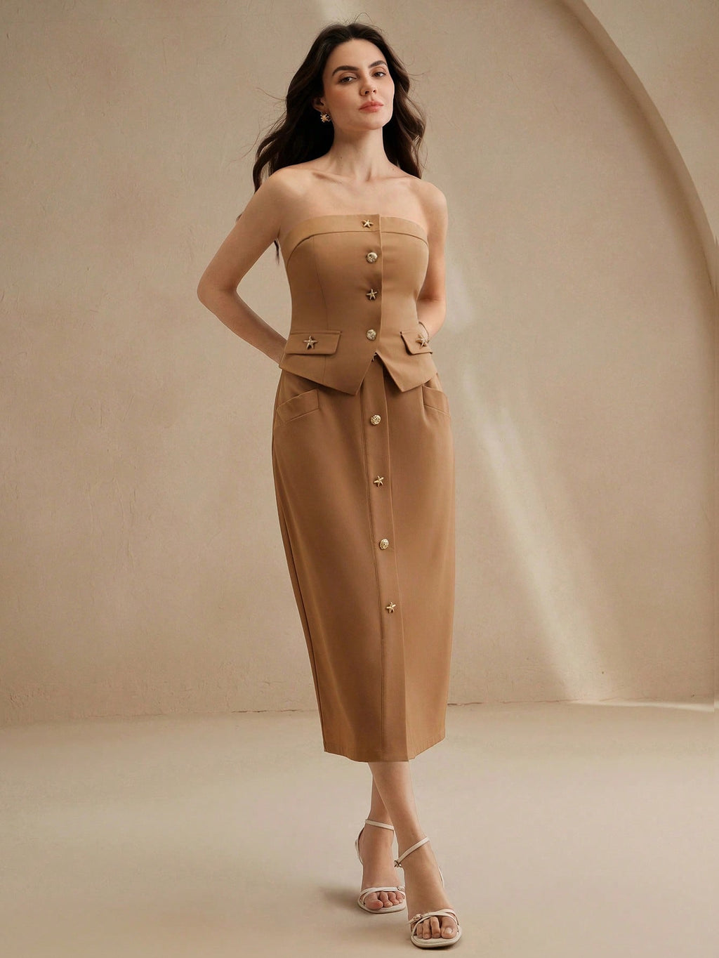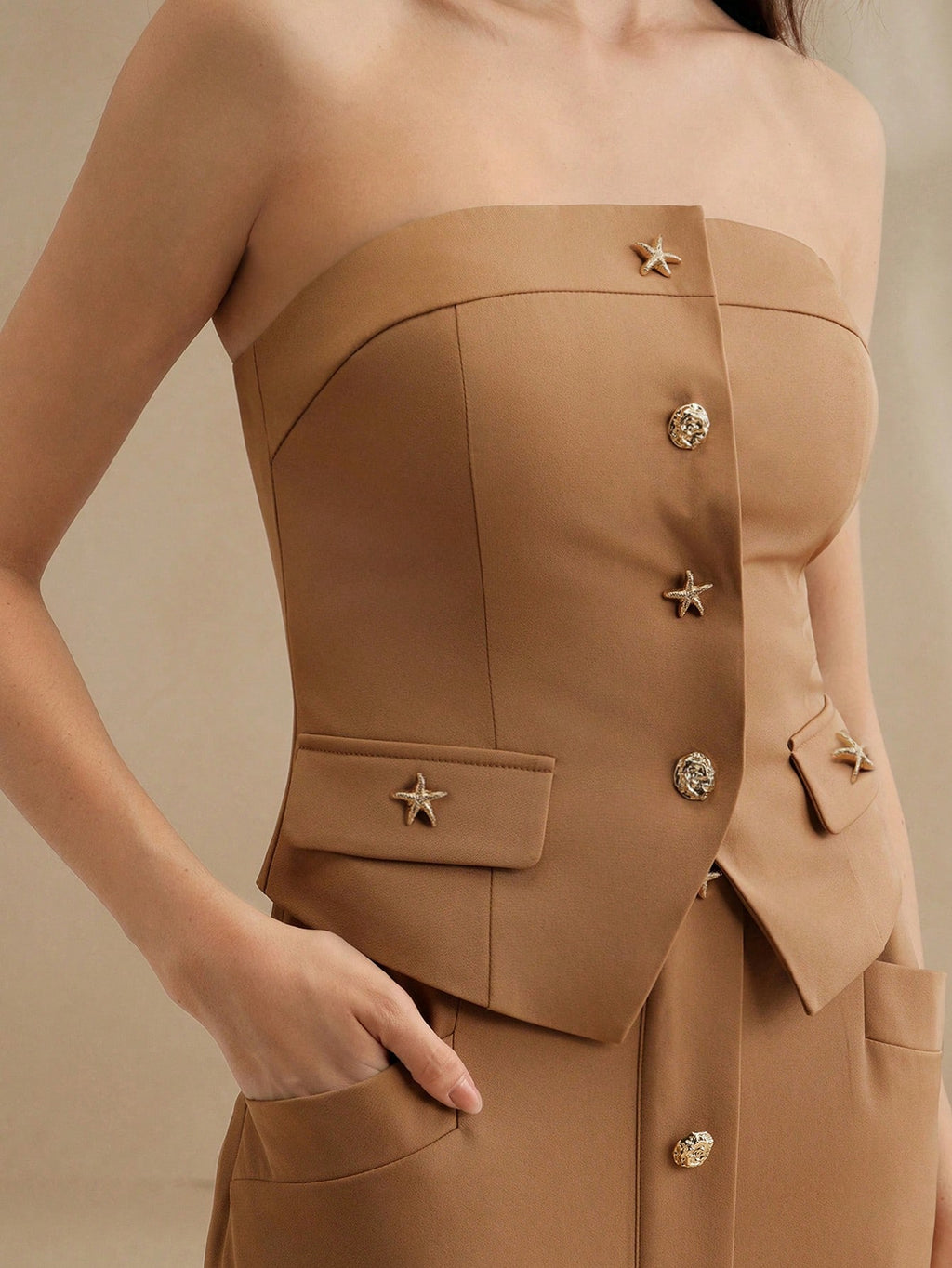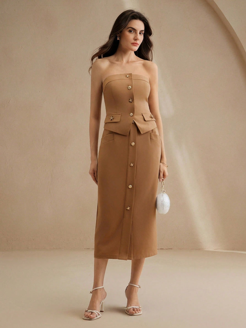 MIU 2pcs Set: Modern Brown Bandeau Top Metal Buckle Skirt For Women