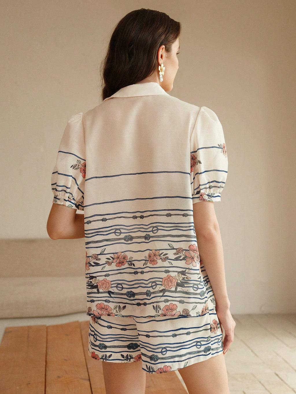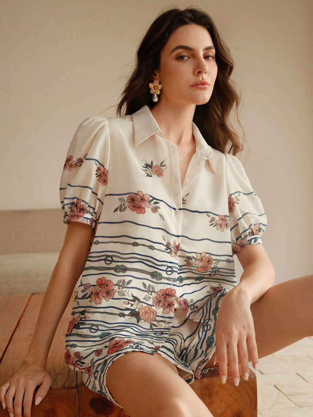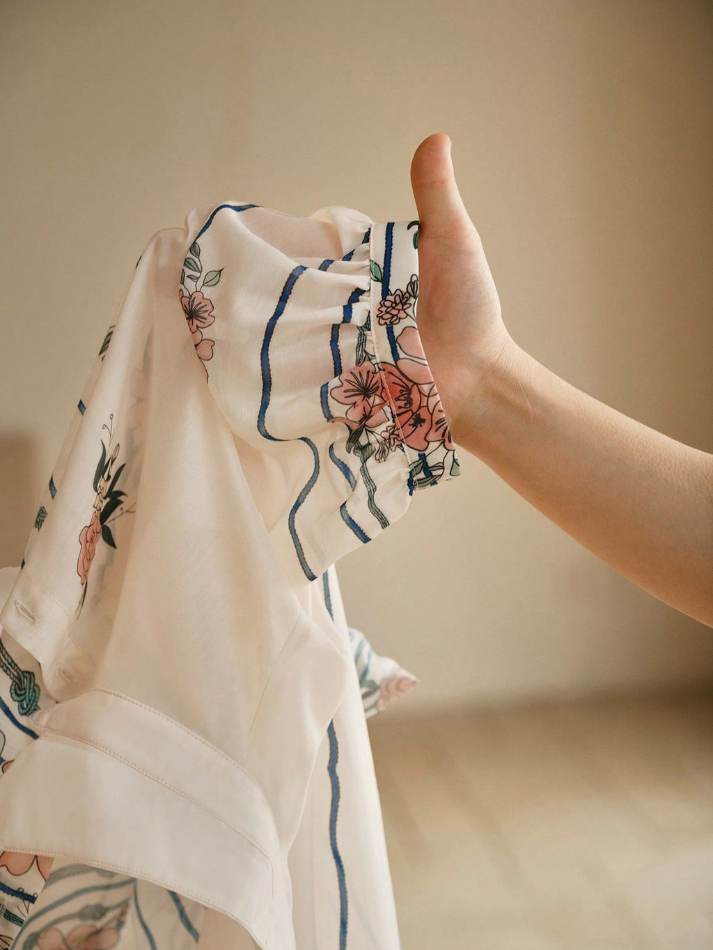 MIU 2pcs/Set Plant Floral Puff Sleeve Shirt