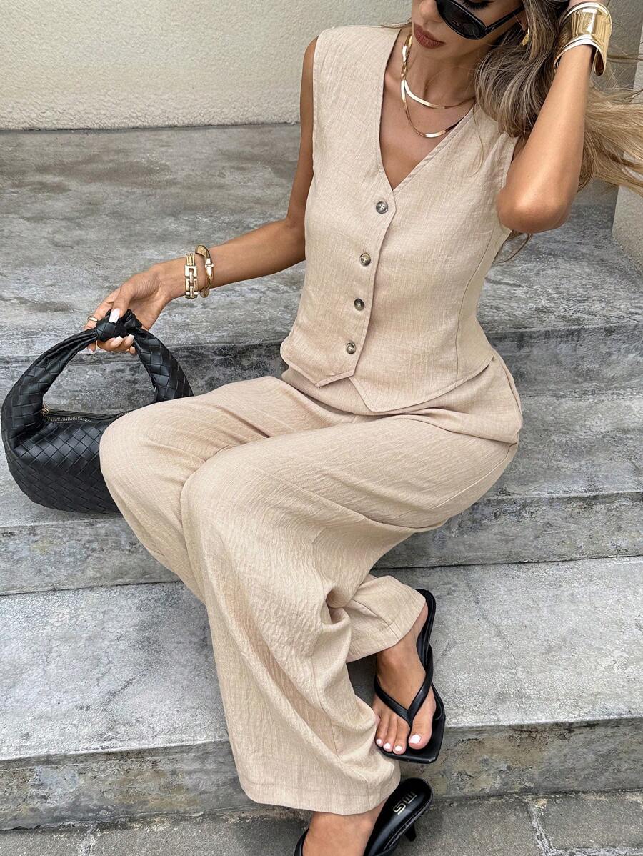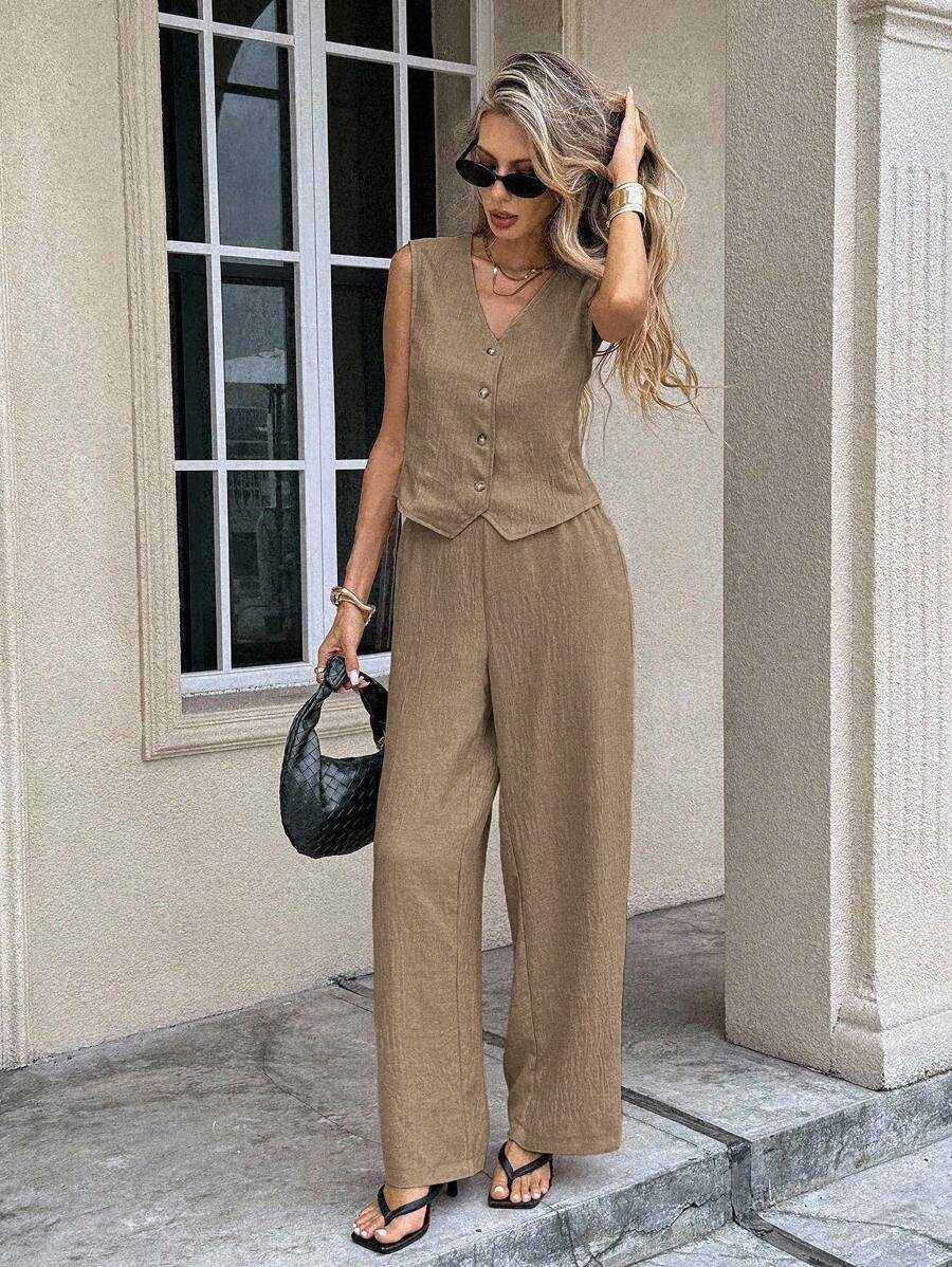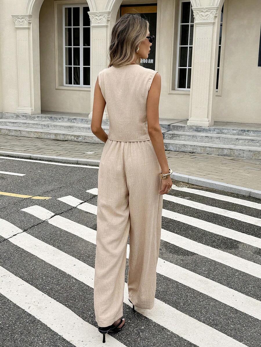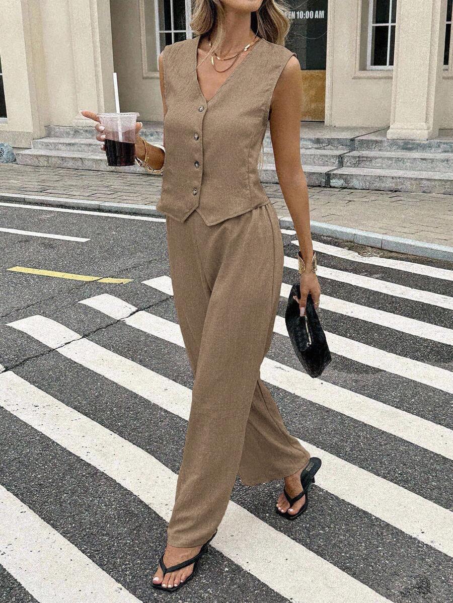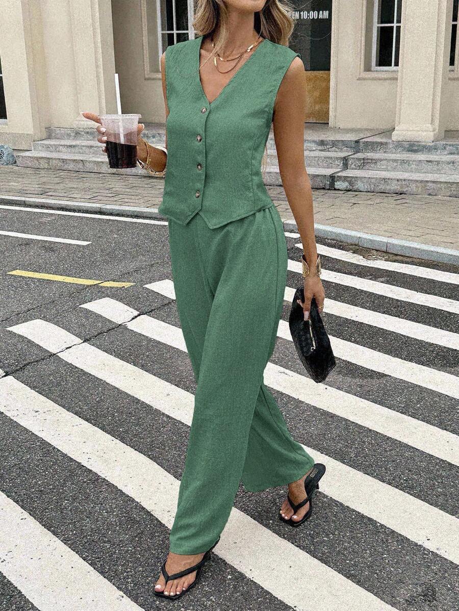 MIU 2pcs/Set Women Solid Linen Texture Front Button Sleeveless Top And Long Pants Set, Simple Vest Set,Office Commuting Horse Jacket Set,Summer Sets,For Daily Wear,French Holiday Outfits