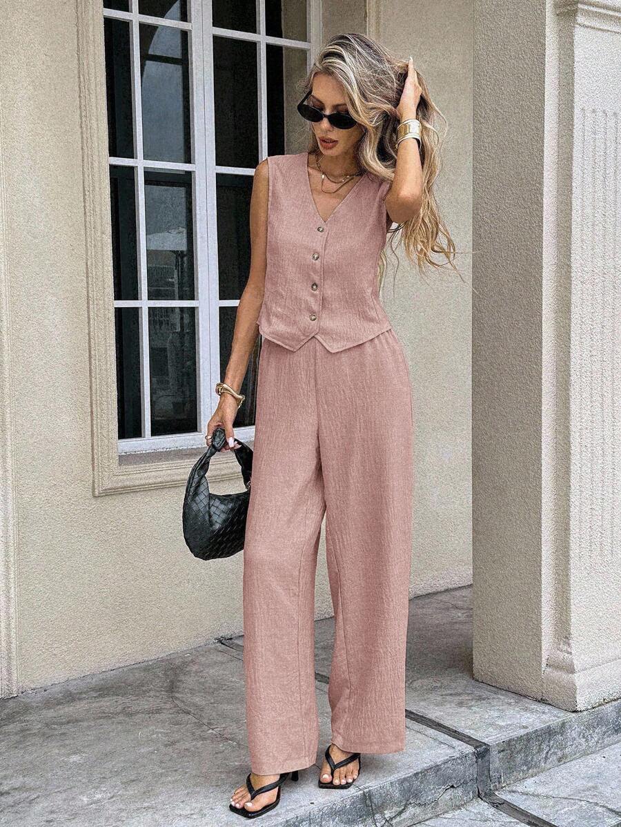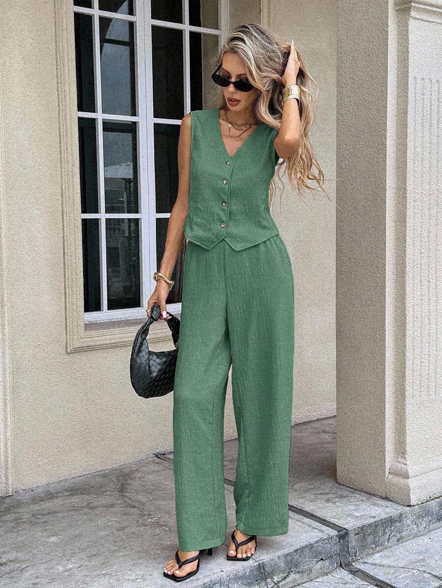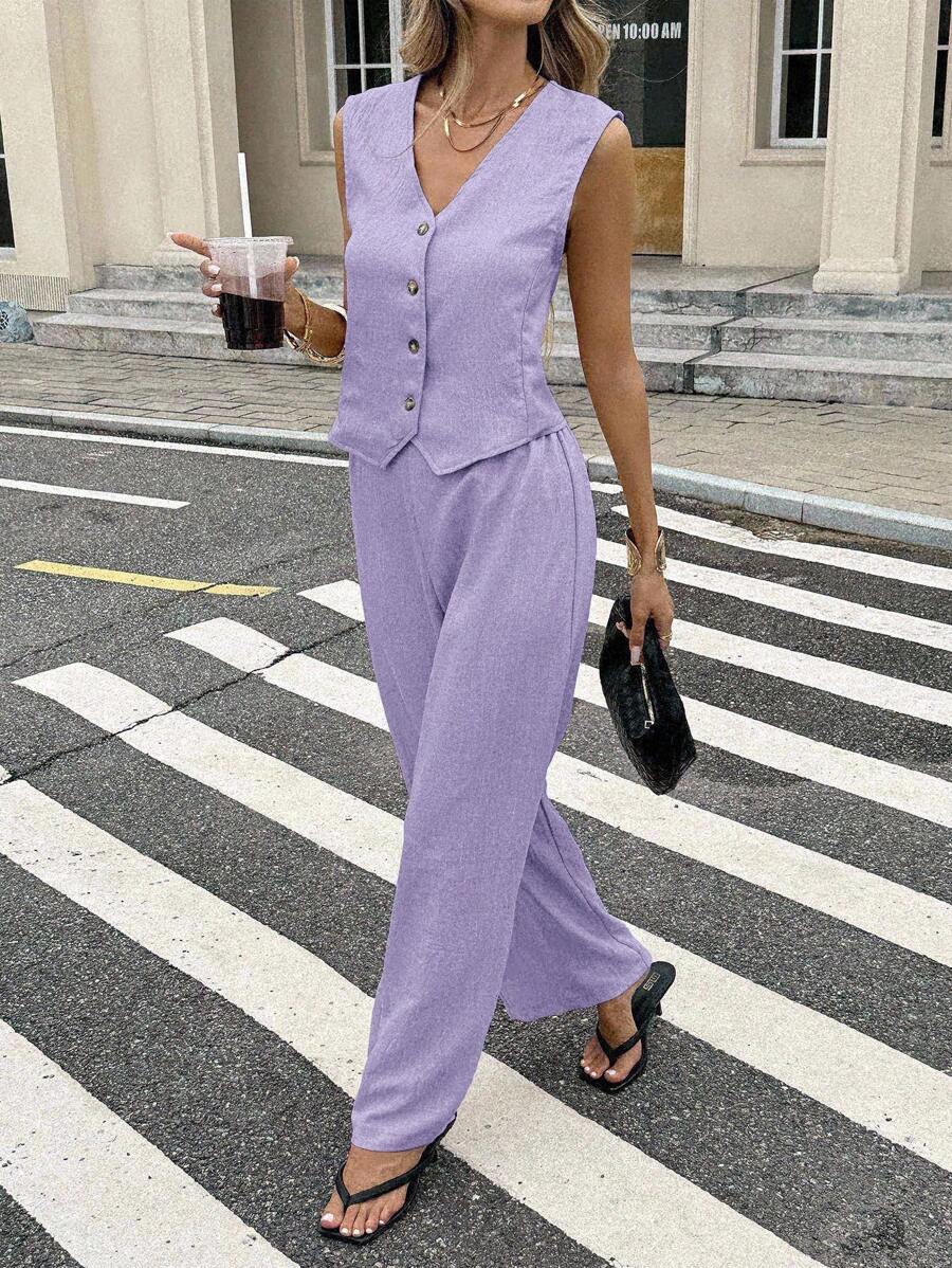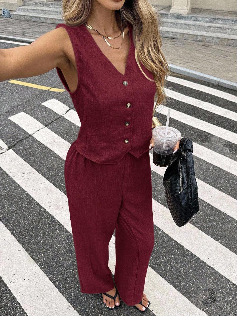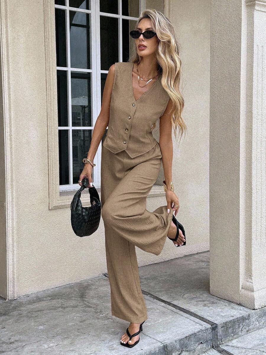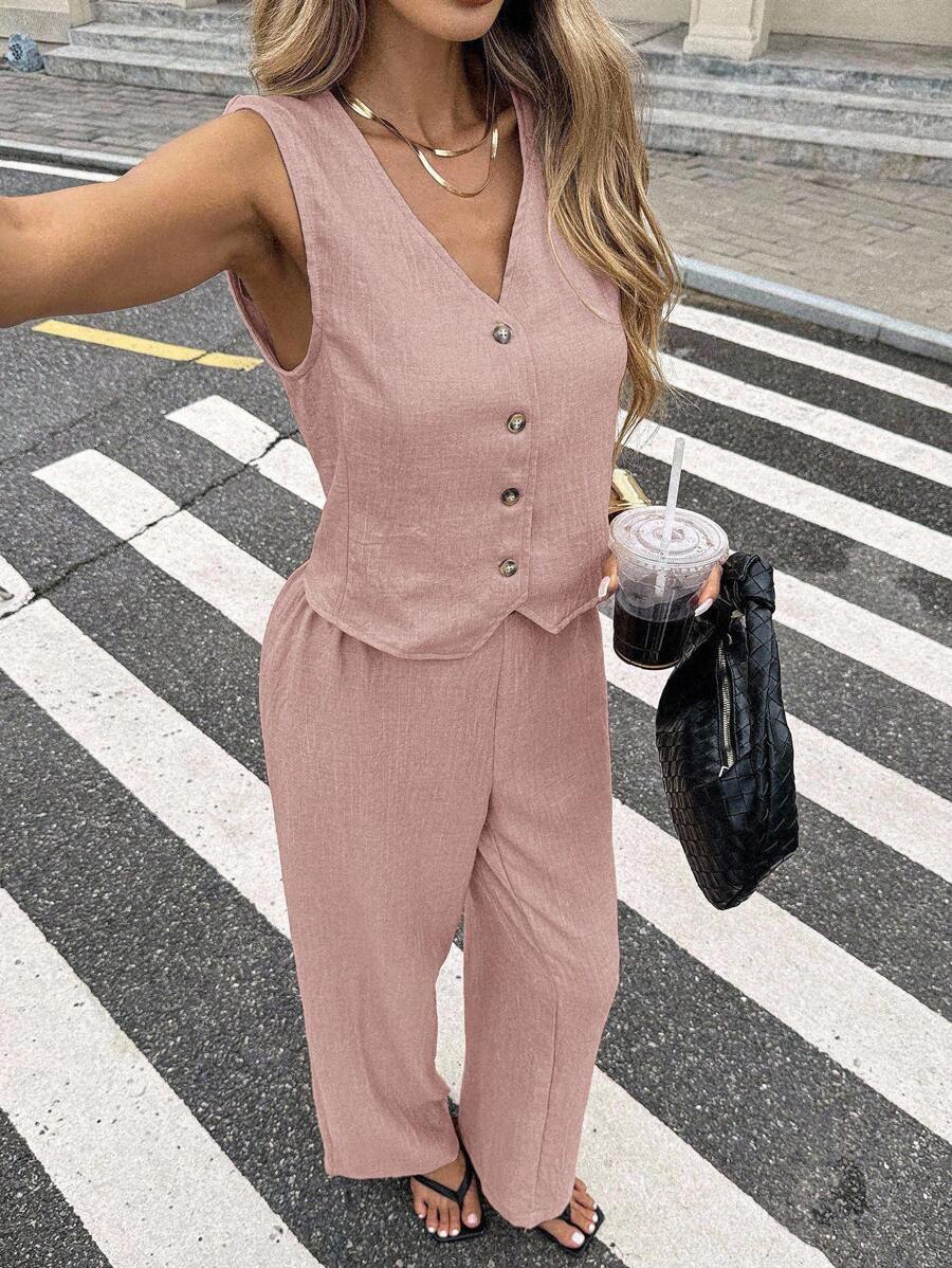 MIU 2pcs/Set Women Solid Linen Texture Front Button Sleeveless Top And Long Pants Set, Simple Vest Set,Office Commuting Horse Jacket Set,Summer Sets,For Daily Wear,French Holiday Outfits