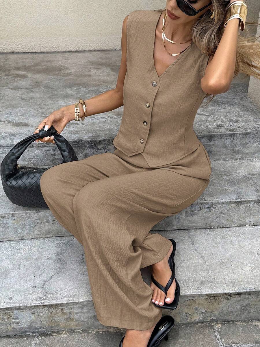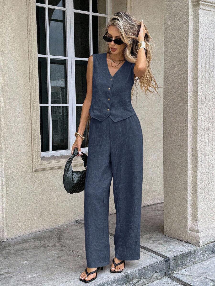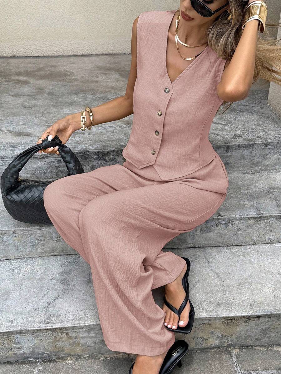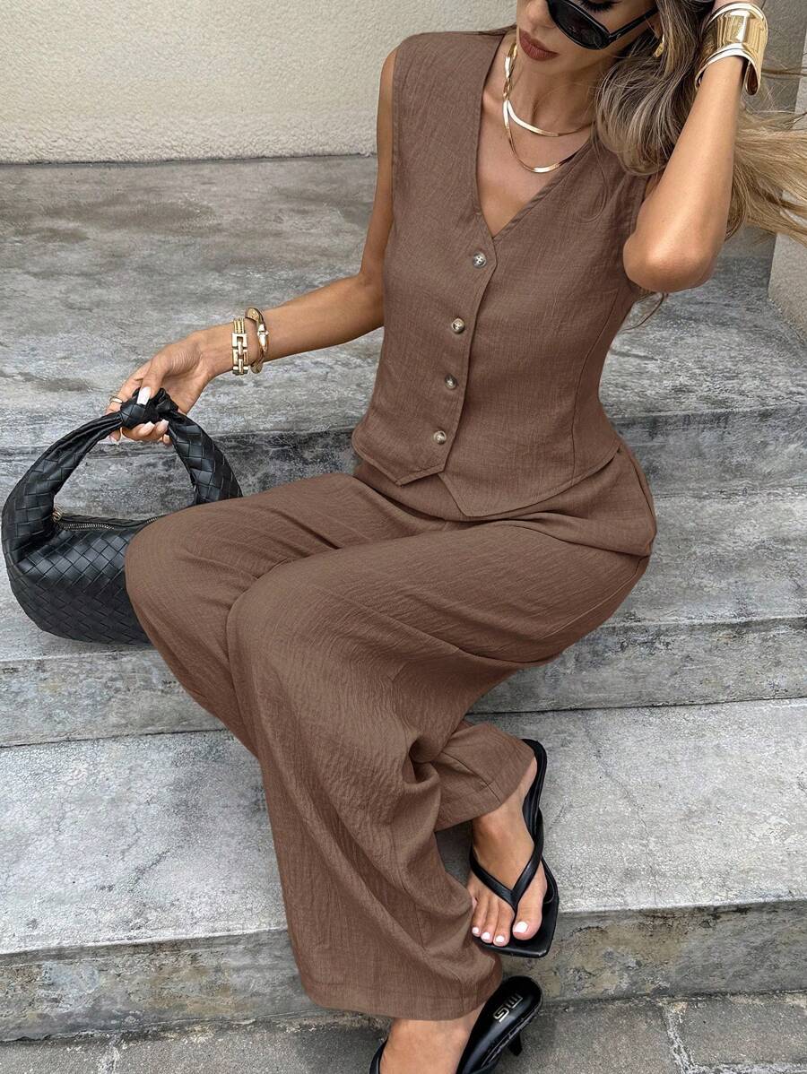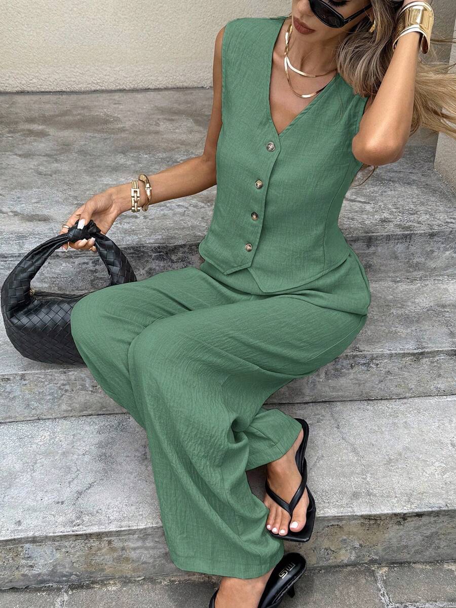 MIU 2pcs/Set Women Solid Linen Texture Front Button Sleeveless Top And Long Pants Set, Simple Vest Set,Office Commuting Horse Jacket Set,Summer Sets,For Daily Wear,French Holiday Outfits