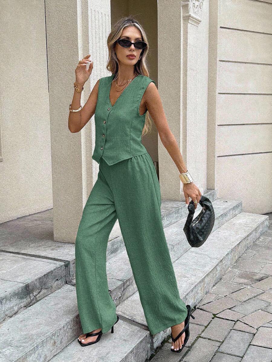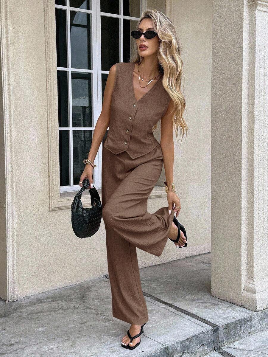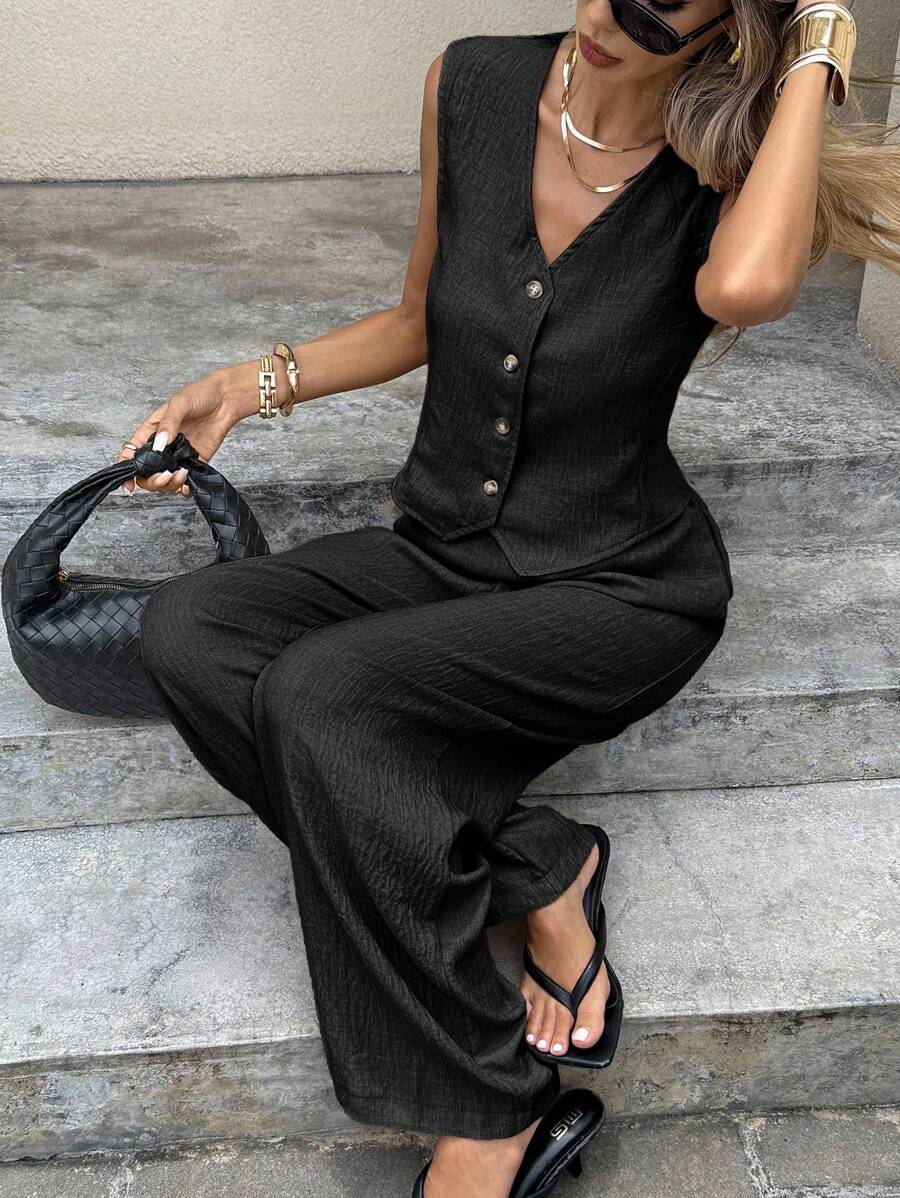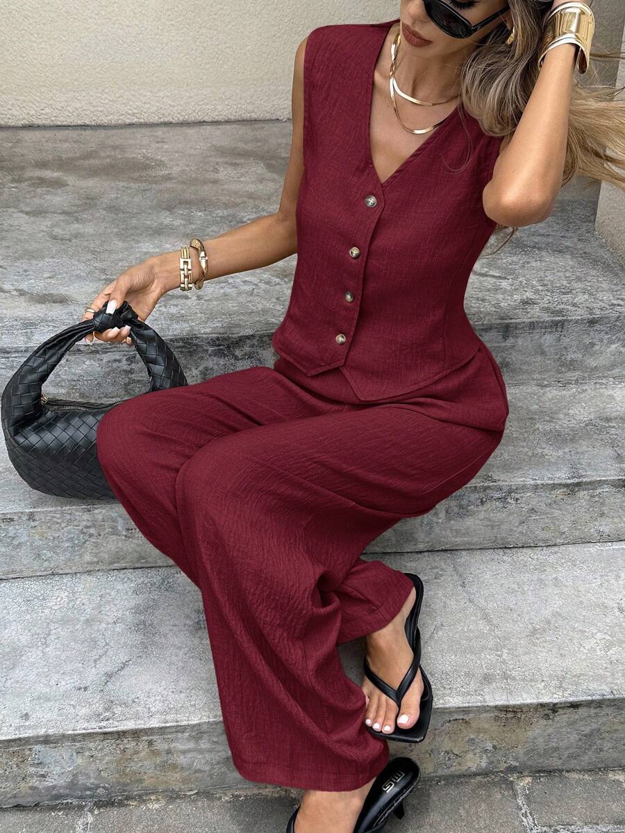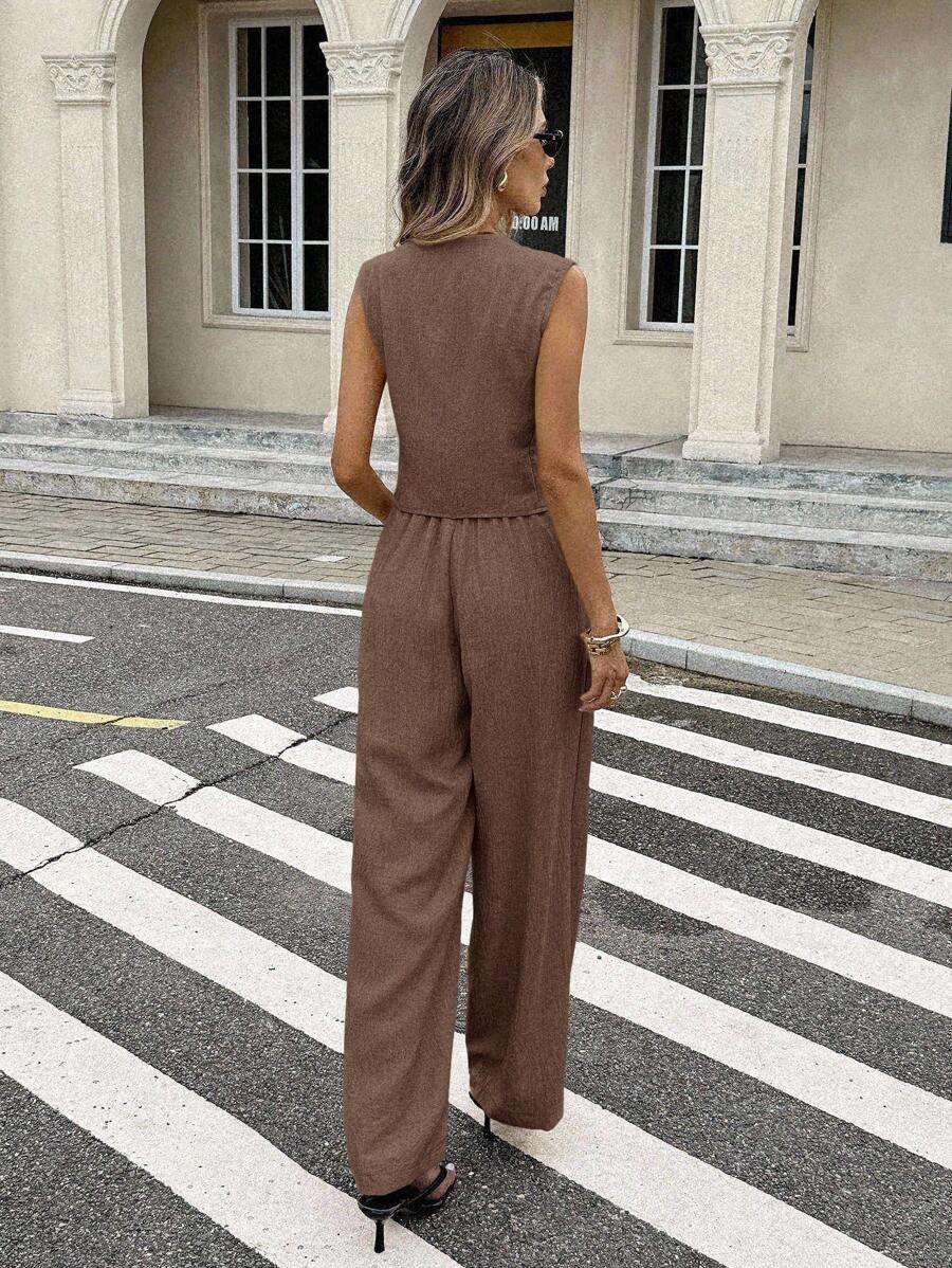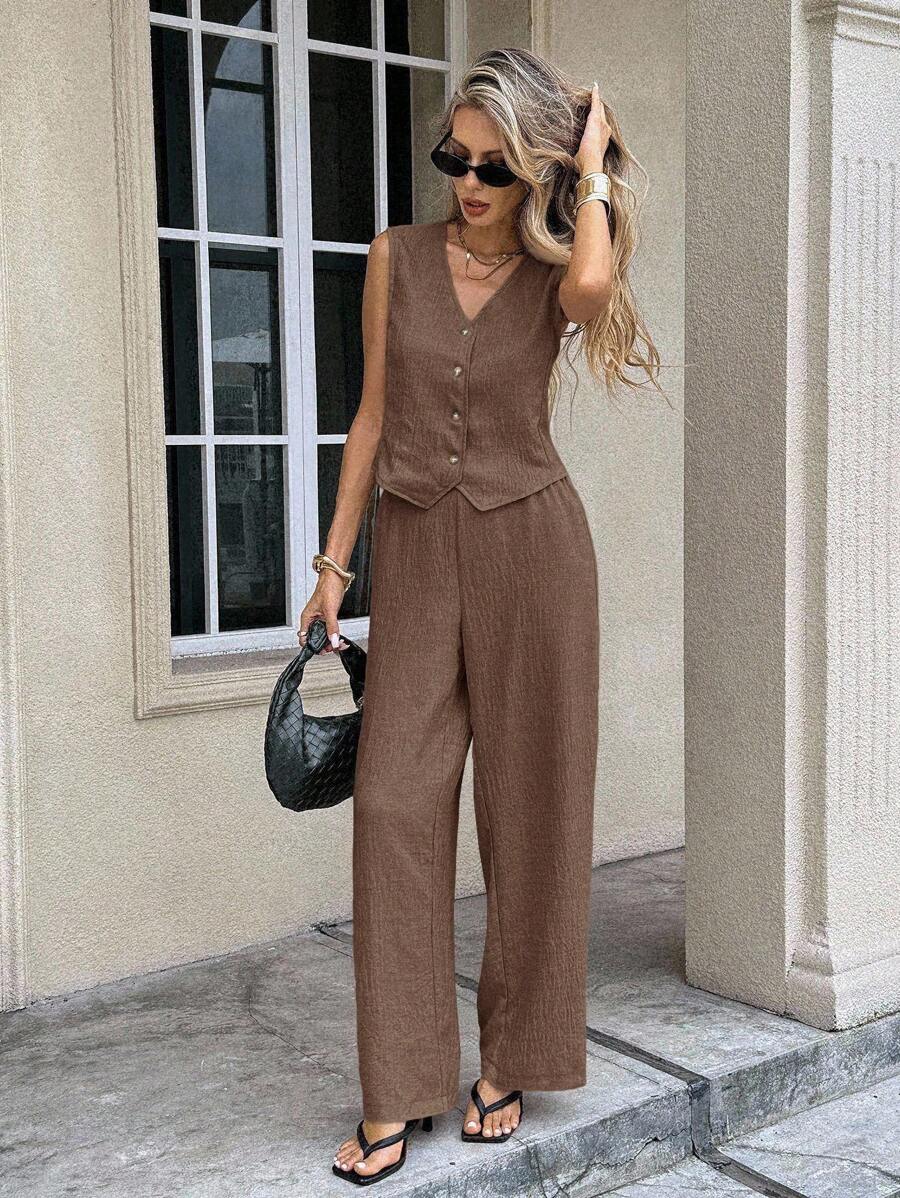 MIU 2pcs/Set Women Solid Linen Texture Front Button Sleeveless Top And Long Pants Set, Simple Vest Set,Office Commuting Horse Jacket Set,Summer Sets,For Daily Wear,French Holiday Outfits
