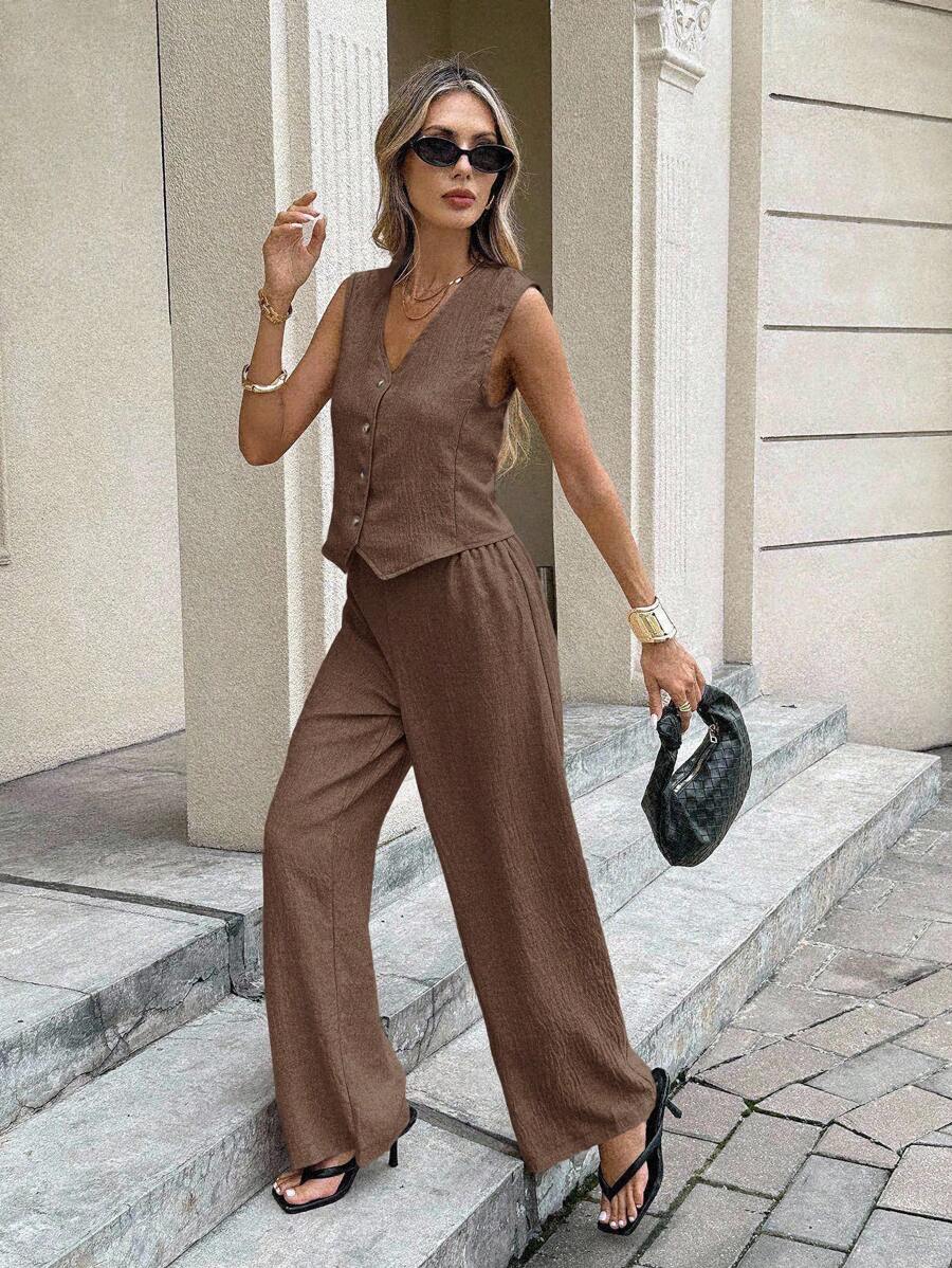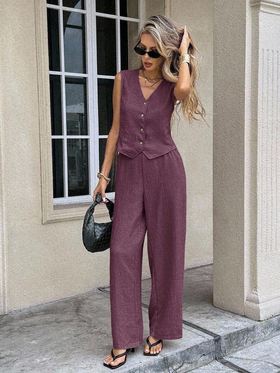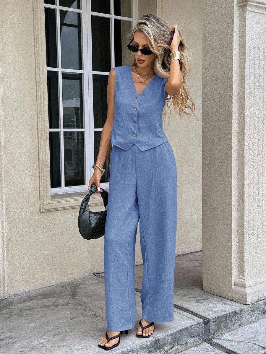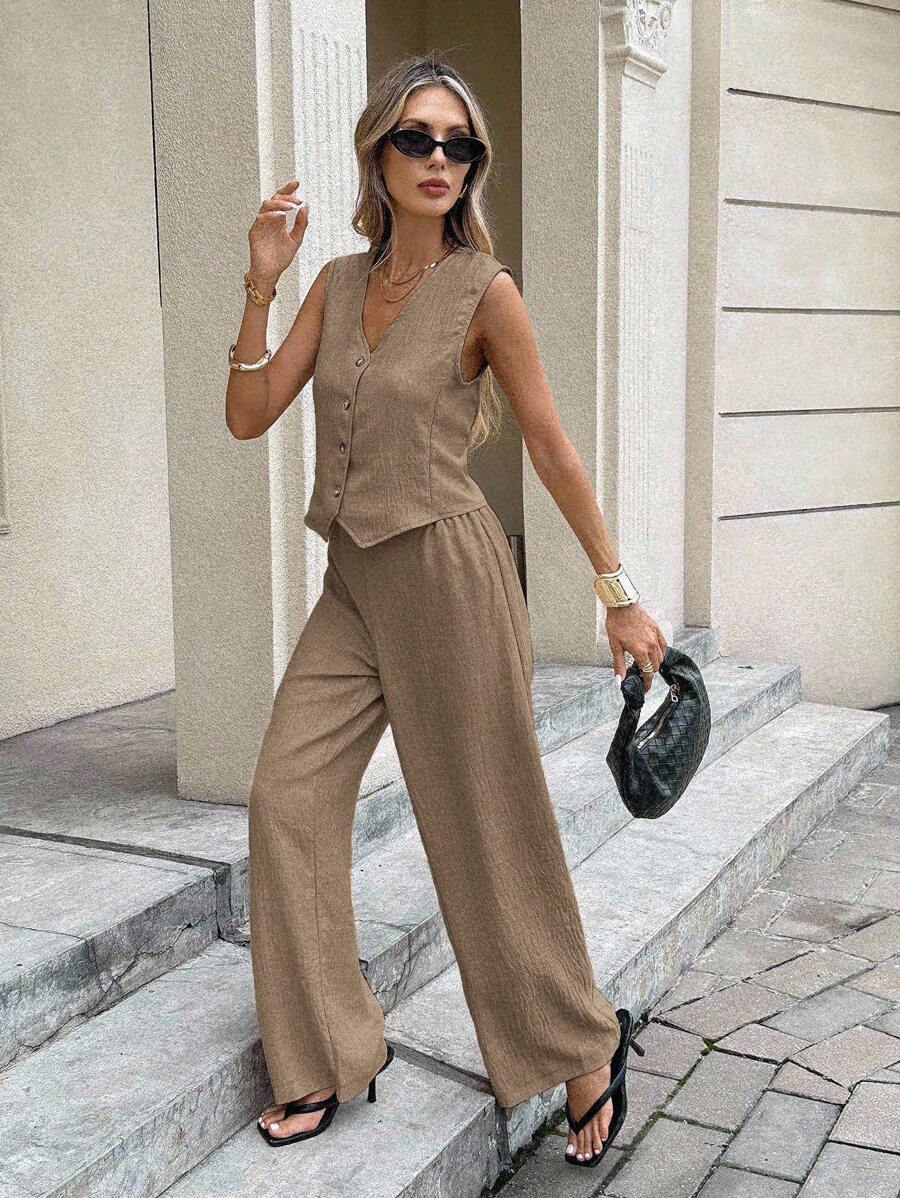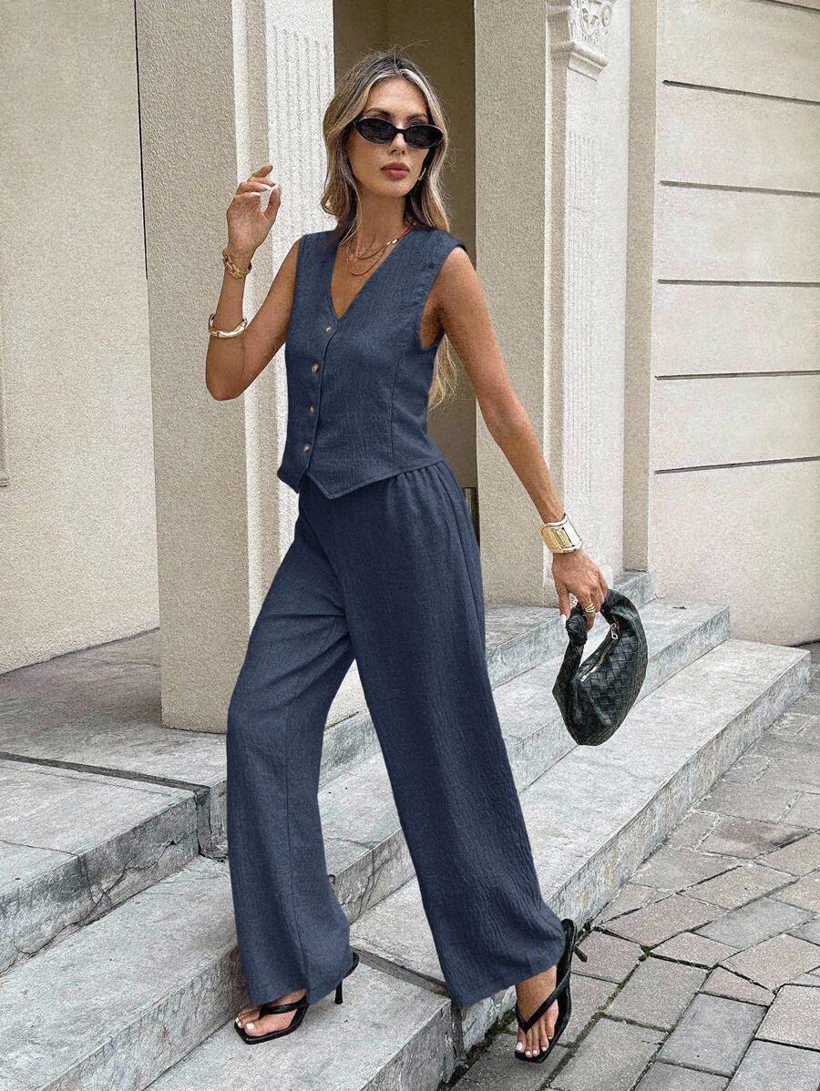 MIU 2pcs/Set Women Solid Linen Texture Front Button Sleeveless Top And Long Pants Set, Simple Vest Set,Office Commuting Horse Jacket Set,Summer Sets,For Daily Wear,French Holiday Outfits