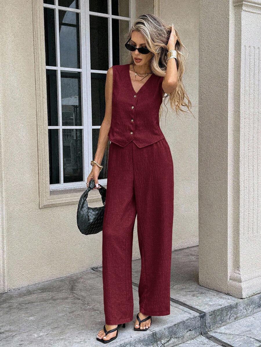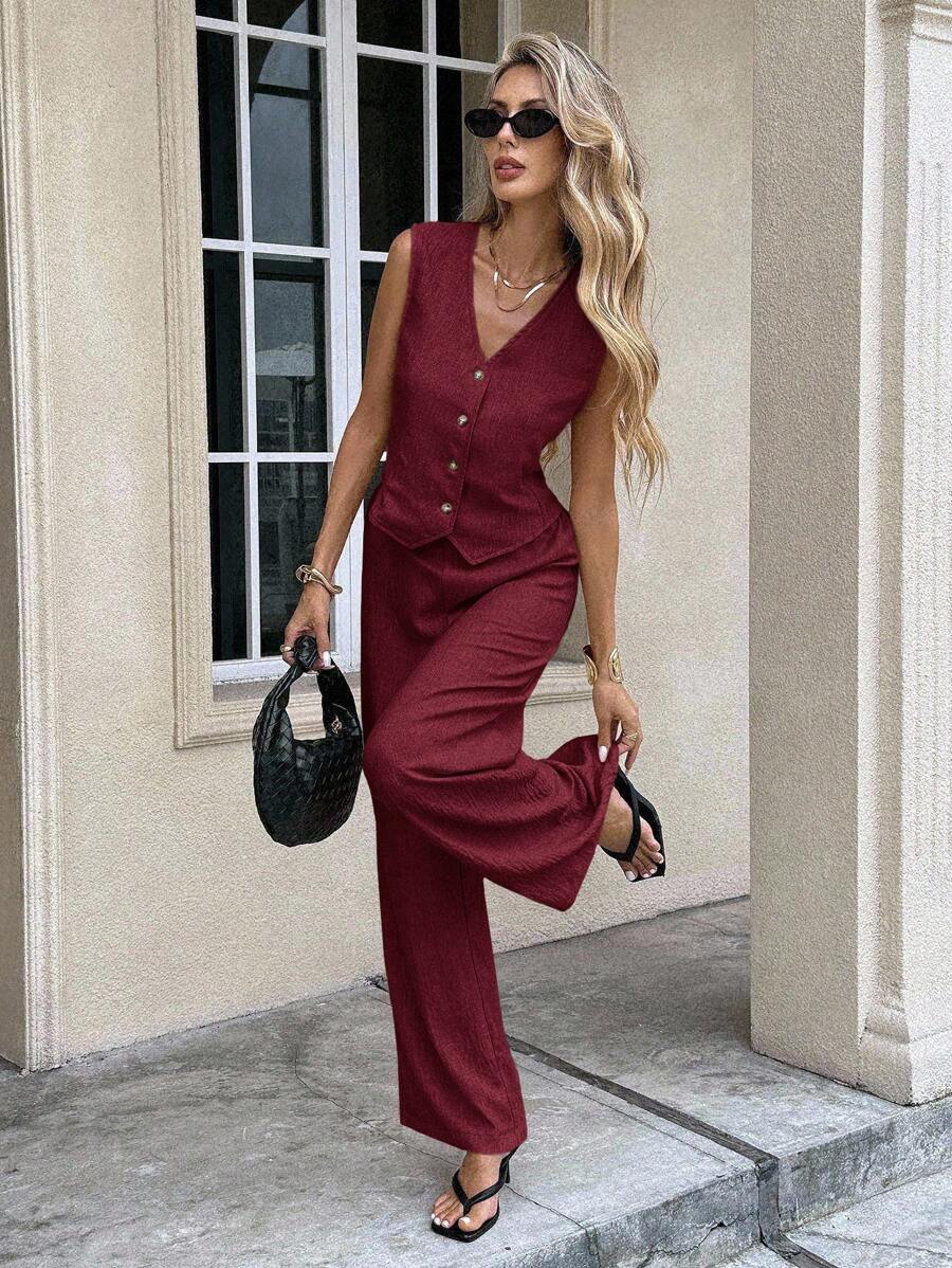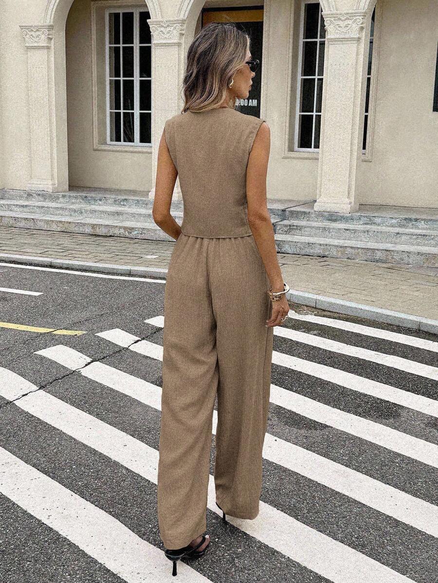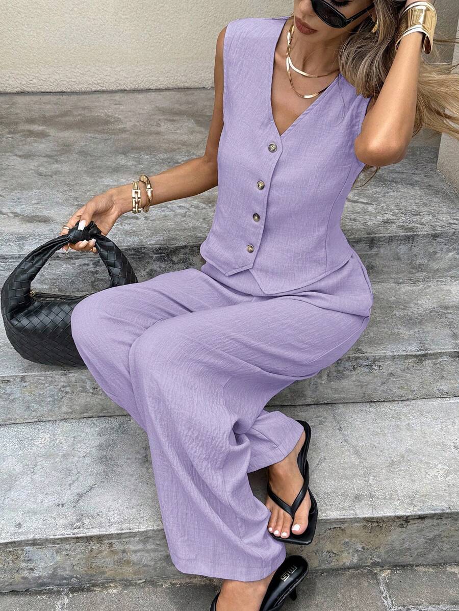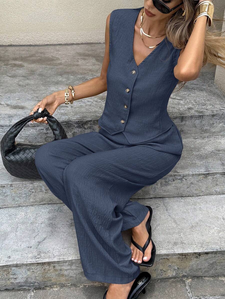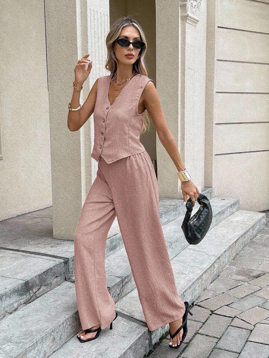 MIU 2pcs/Set Women Solid Linen Texture Front Button Sleeveless Top And Long Pants Set, Simple Vest Set,Office Commuting Horse Jacket Set,Summer Sets,For Daily Wear,French Holiday Outfits