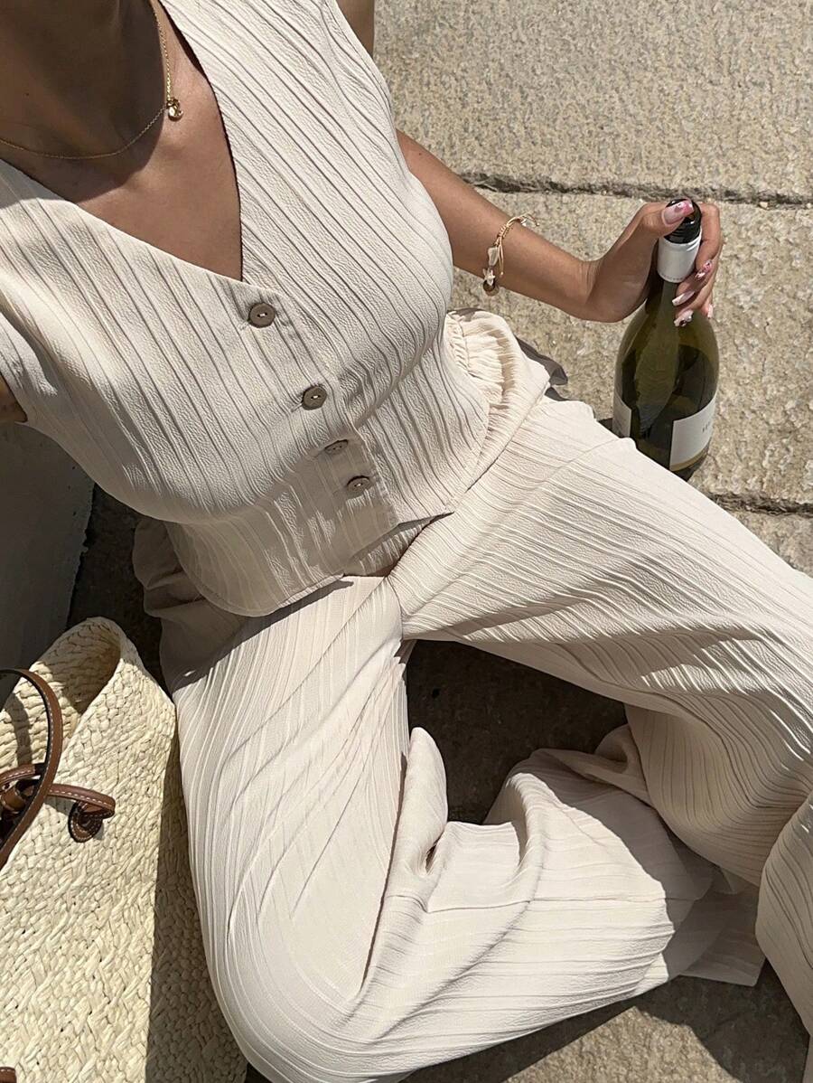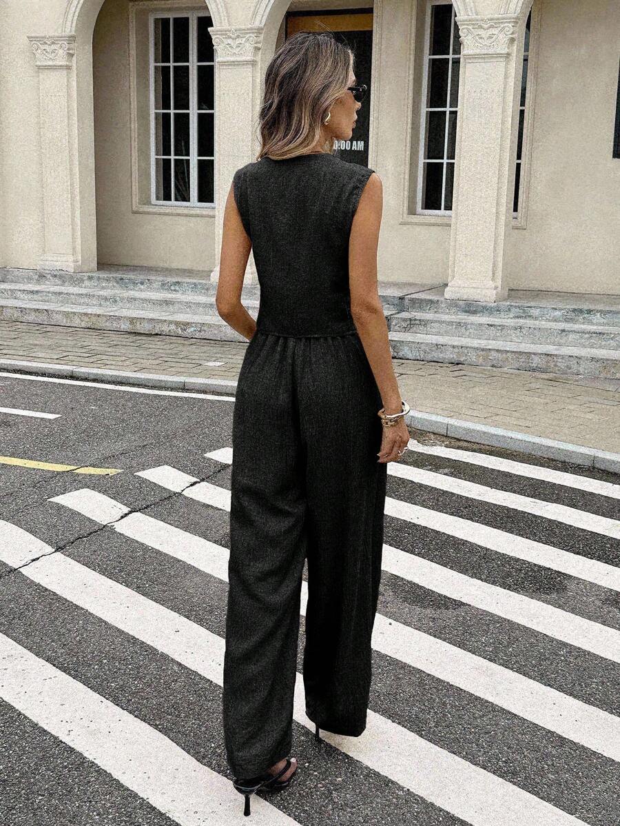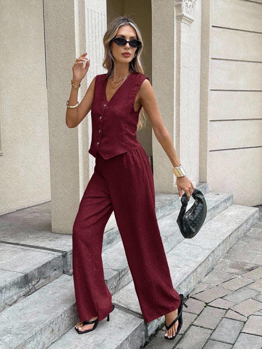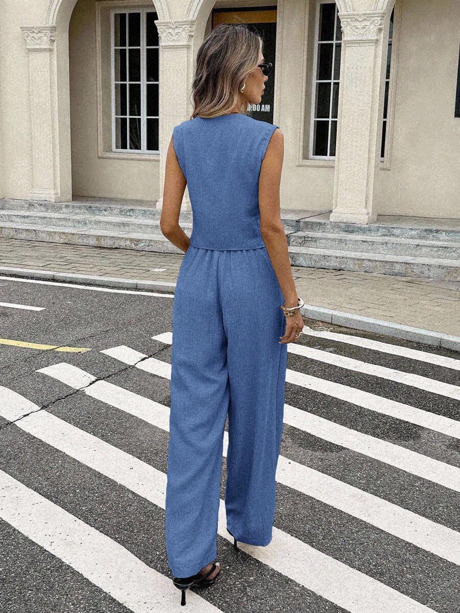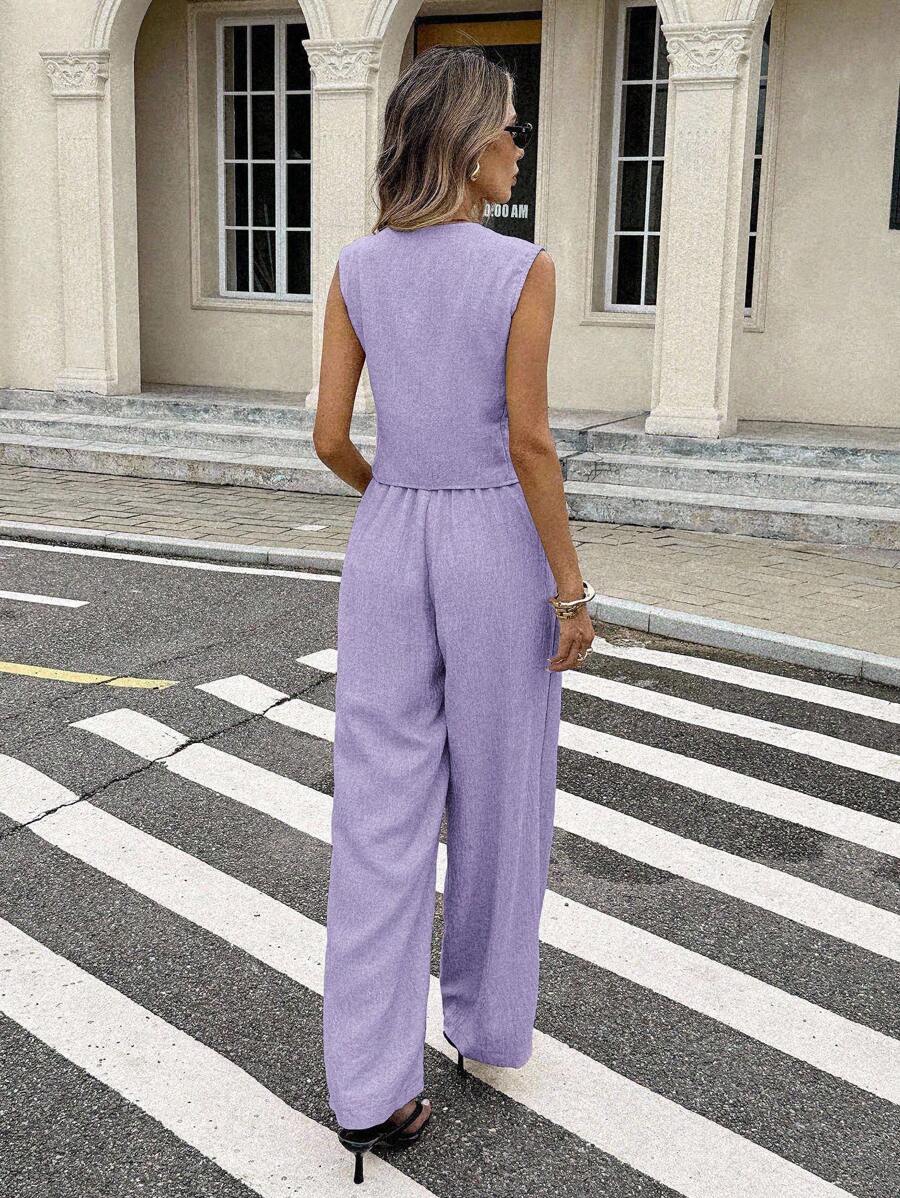 MIU 2pcs/Set Women Solid Linen Texture Front Button Sleeveless Top And Long Pants Set, Simple Vest Set,Office Commuting Horse Jacket Set,Summer Sets,For Daily Wear,French Holiday Outfits