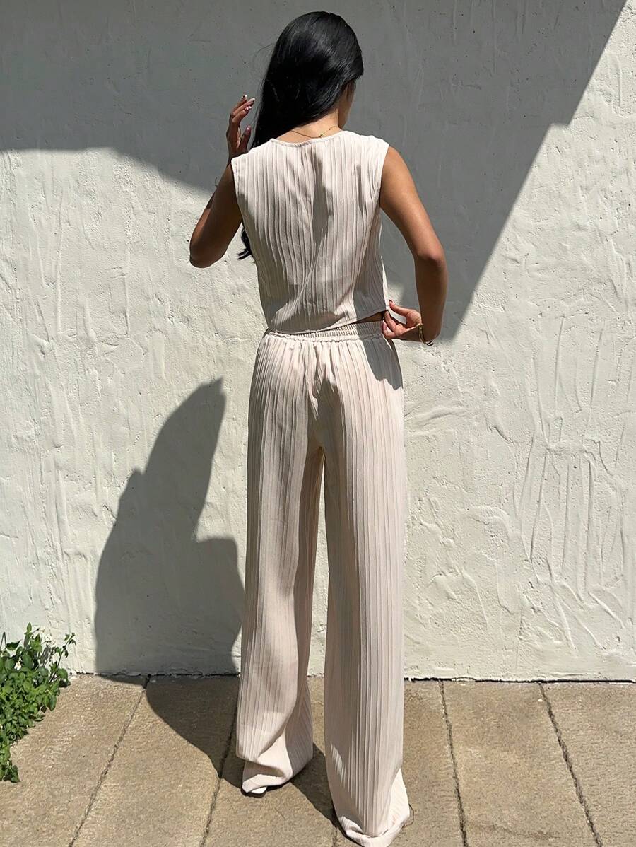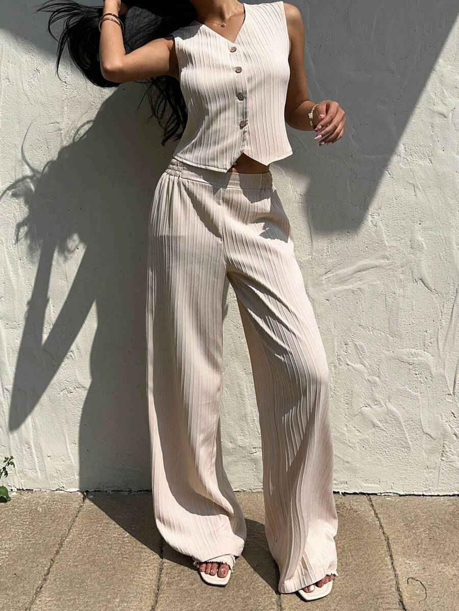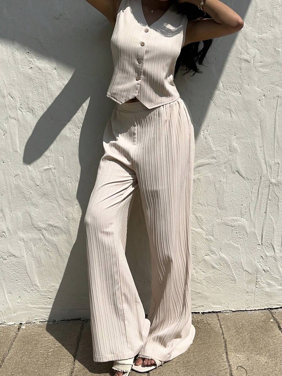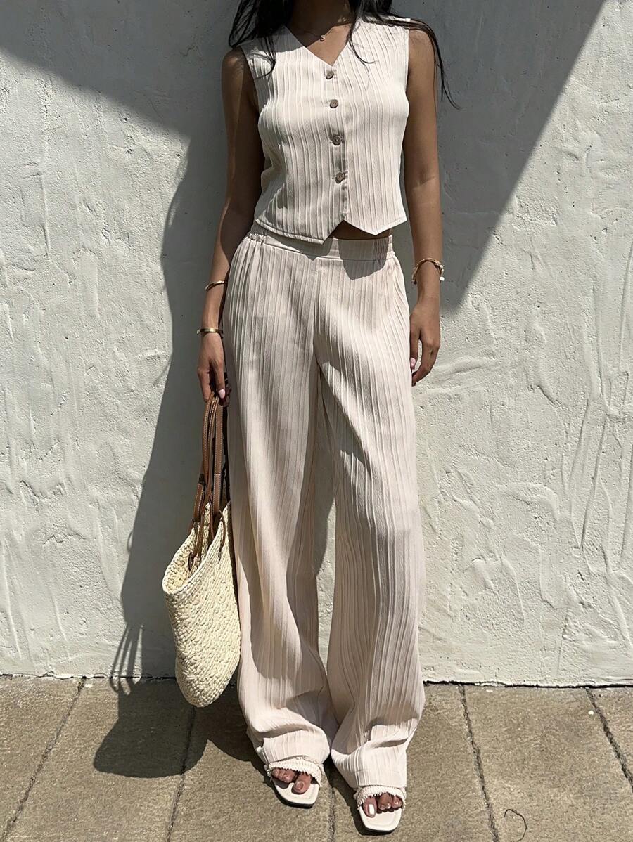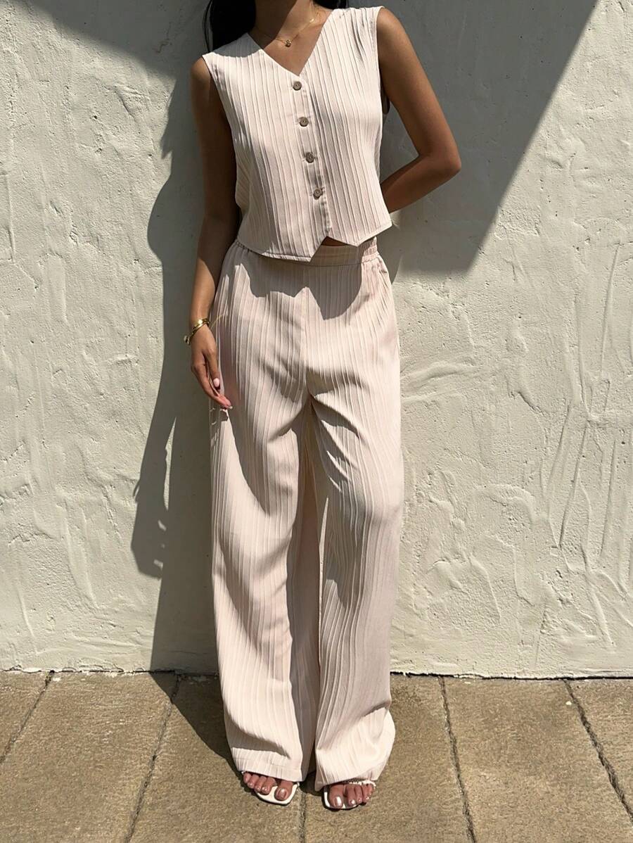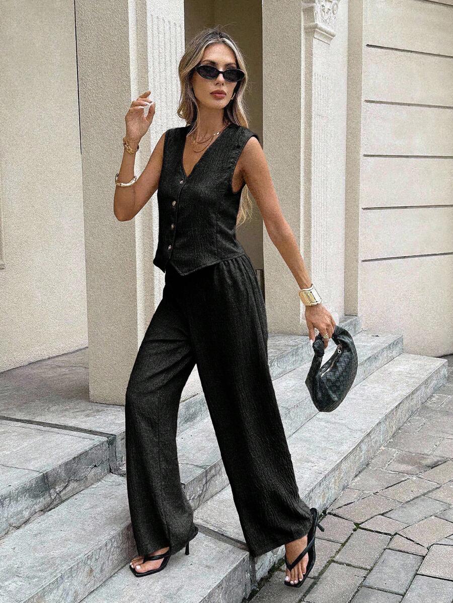 MIU 2pcs/Set Women Solid Linen Texture Front Button Sleeveless Top And Long Pants Set, Simple Vest Set,Office Commuting Horse Jacket Set,Summer Sets,For Daily Wear,French Holiday Outfits
