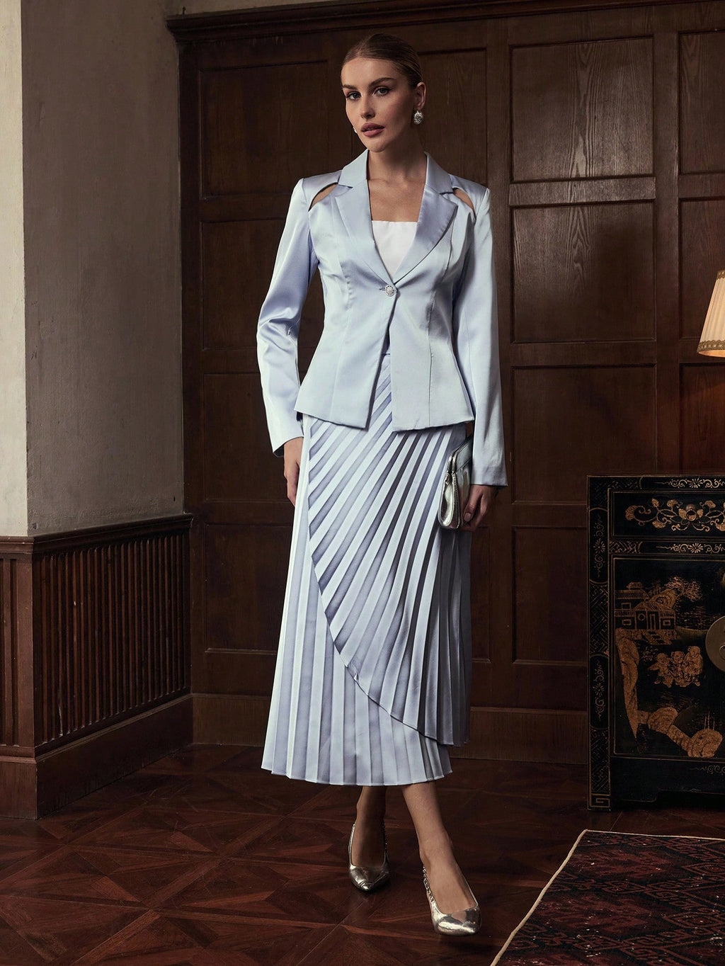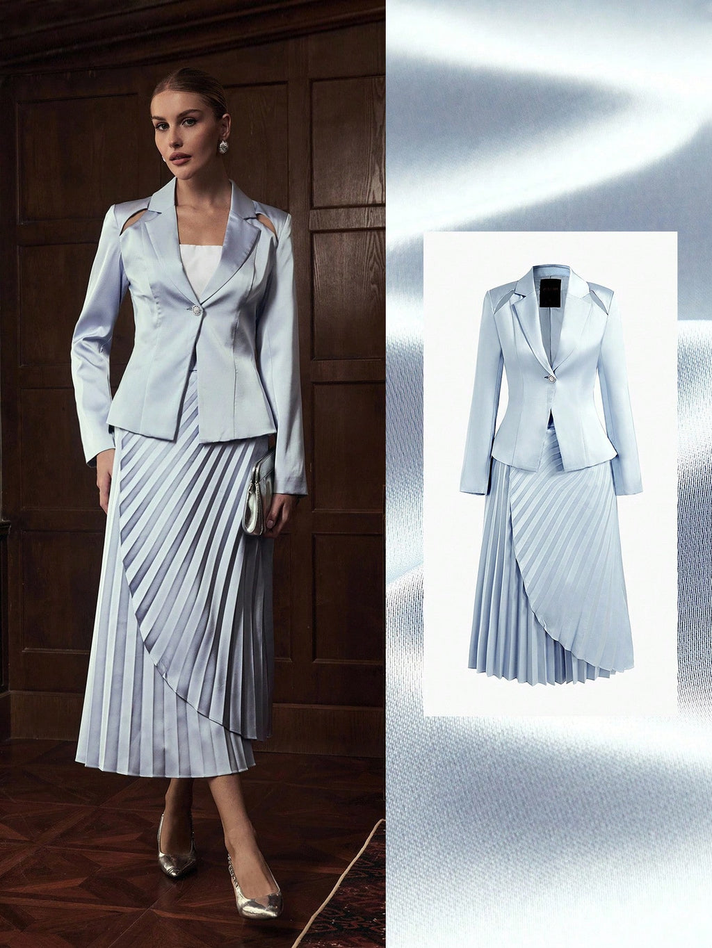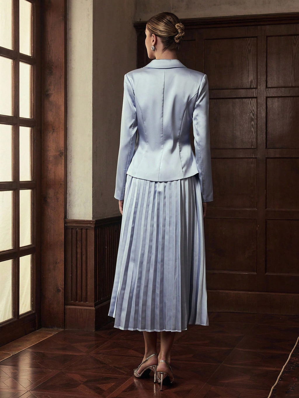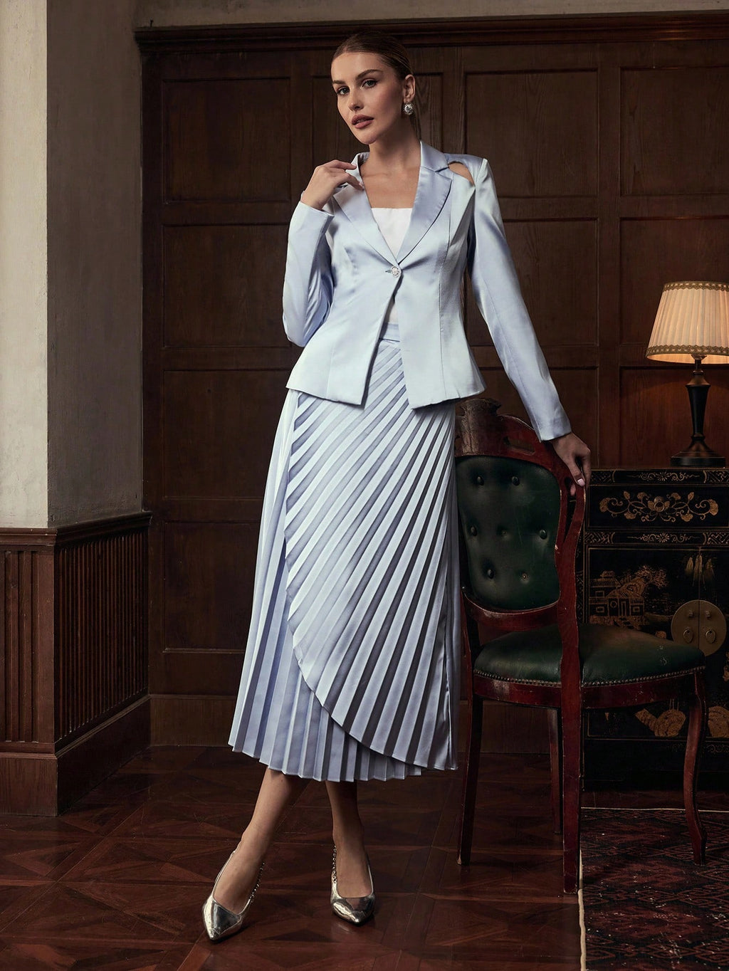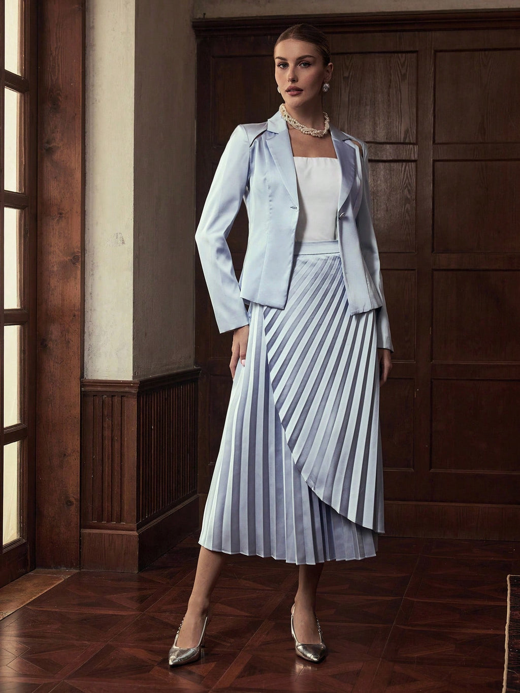 MIU 2pcs Women Business Casual Single Button Blazer Jacket And Pleated Skirt Set