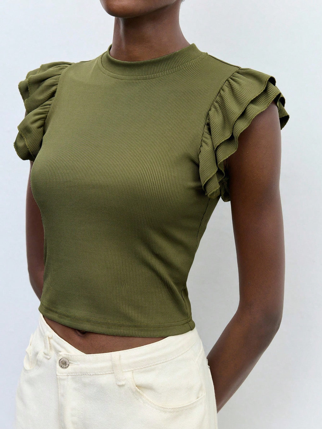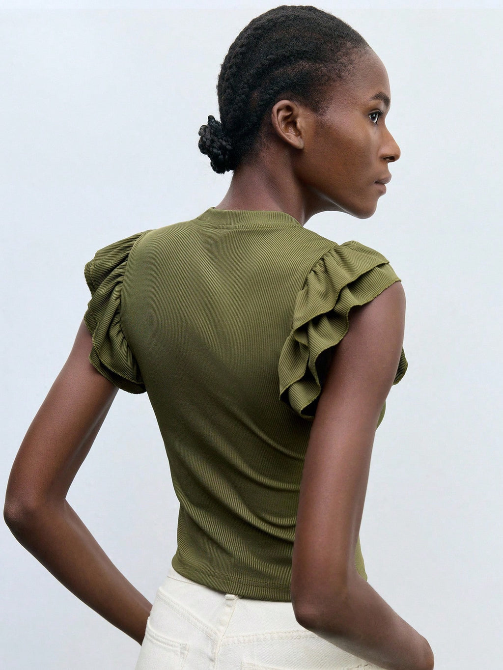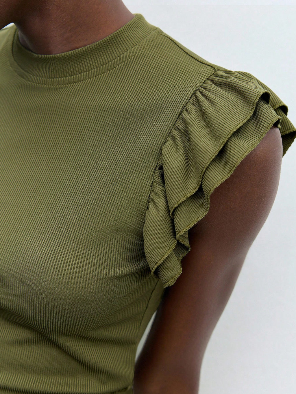 MIU Army Green Ribbed Panel Trim Slim Fit Short Sleeve T-Shirt, Casual Urban Summer Tee, Multipurpose