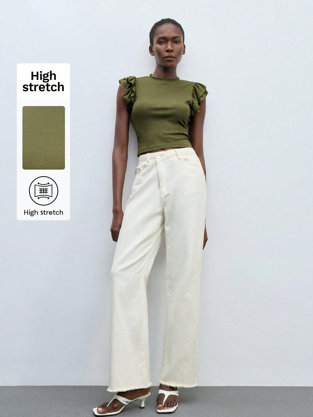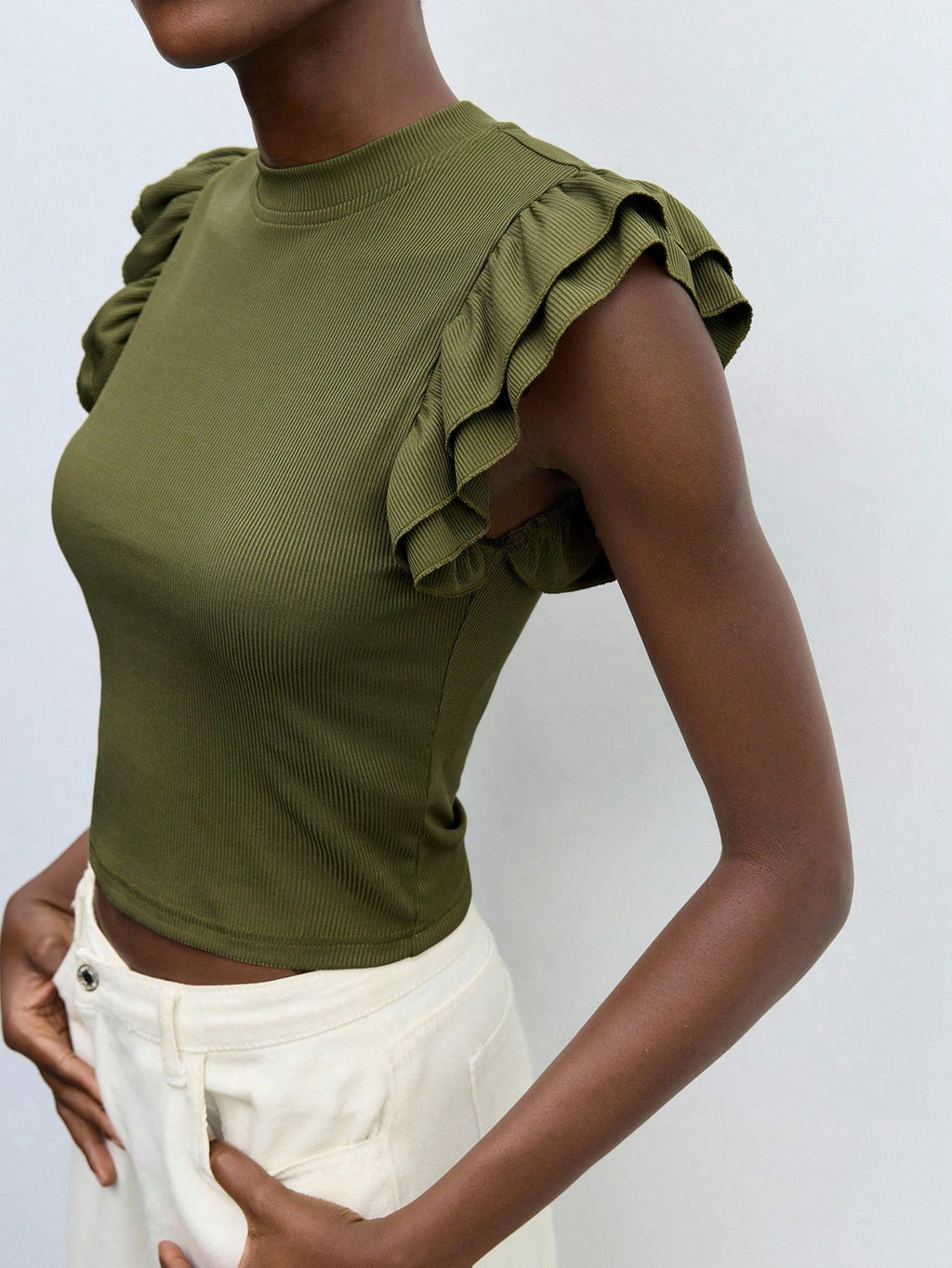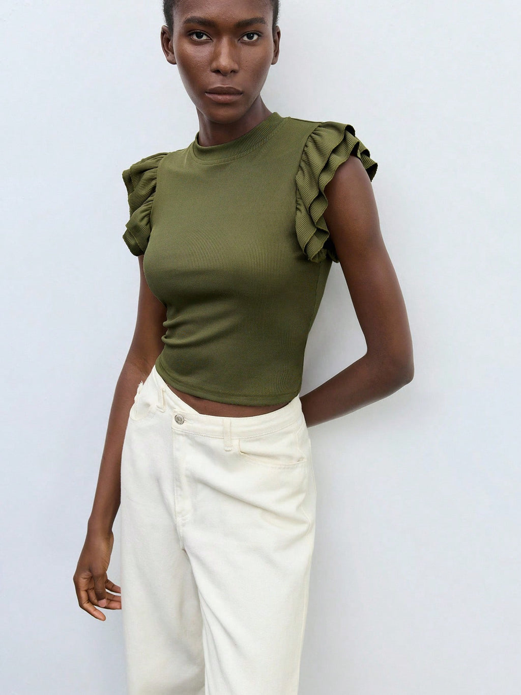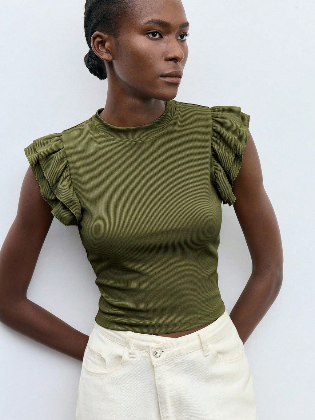 MIU Army Green Ribbed Panel Trim Slim Fit Short Sleeve T-Shirt, Casual Urban Summer Tee, Multipurpose
