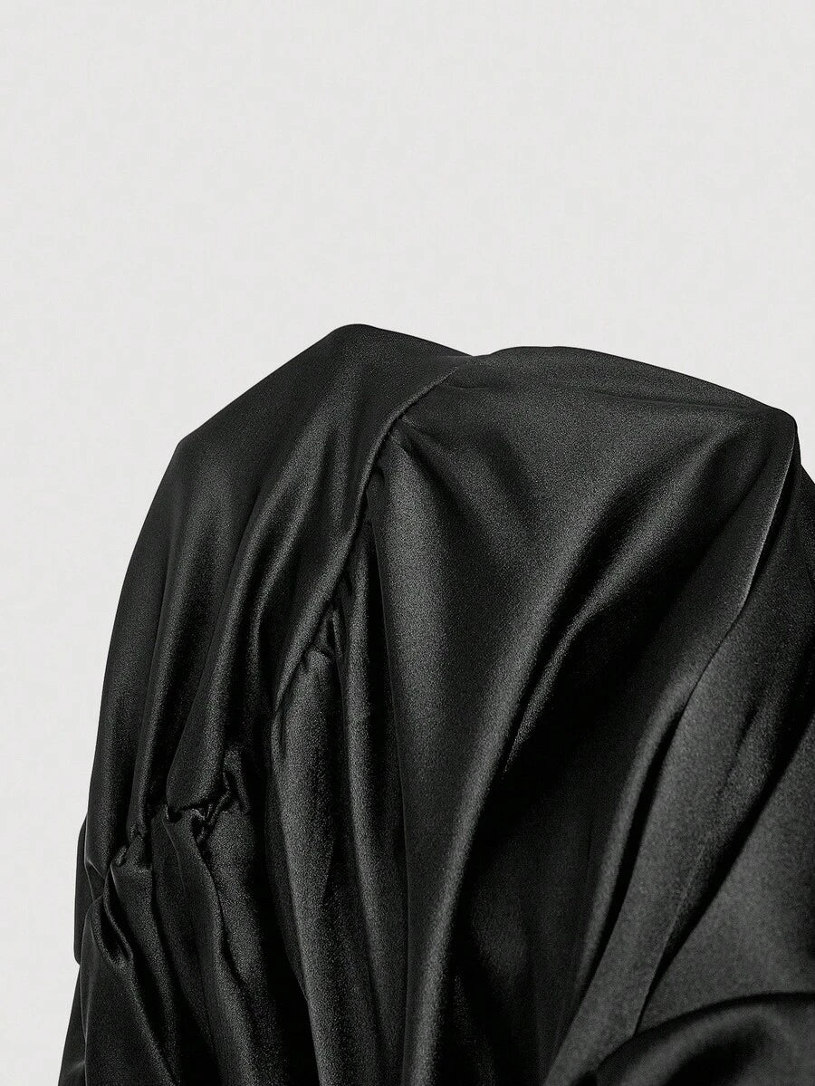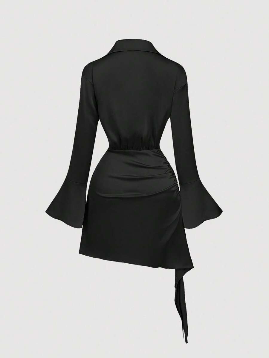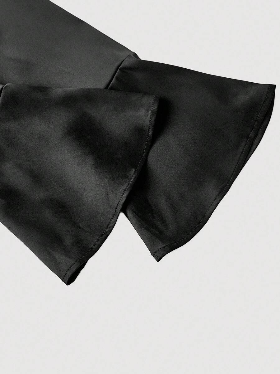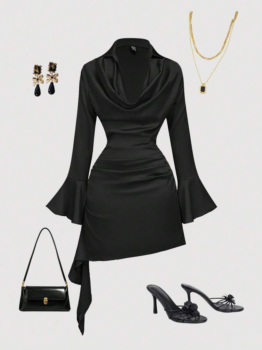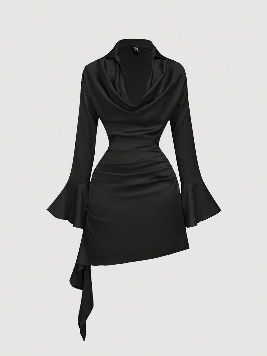 MIU AZRA Ženska Crna Crep Haljina sa Nabranom Ovratnikom i Rukavima u Zvonu