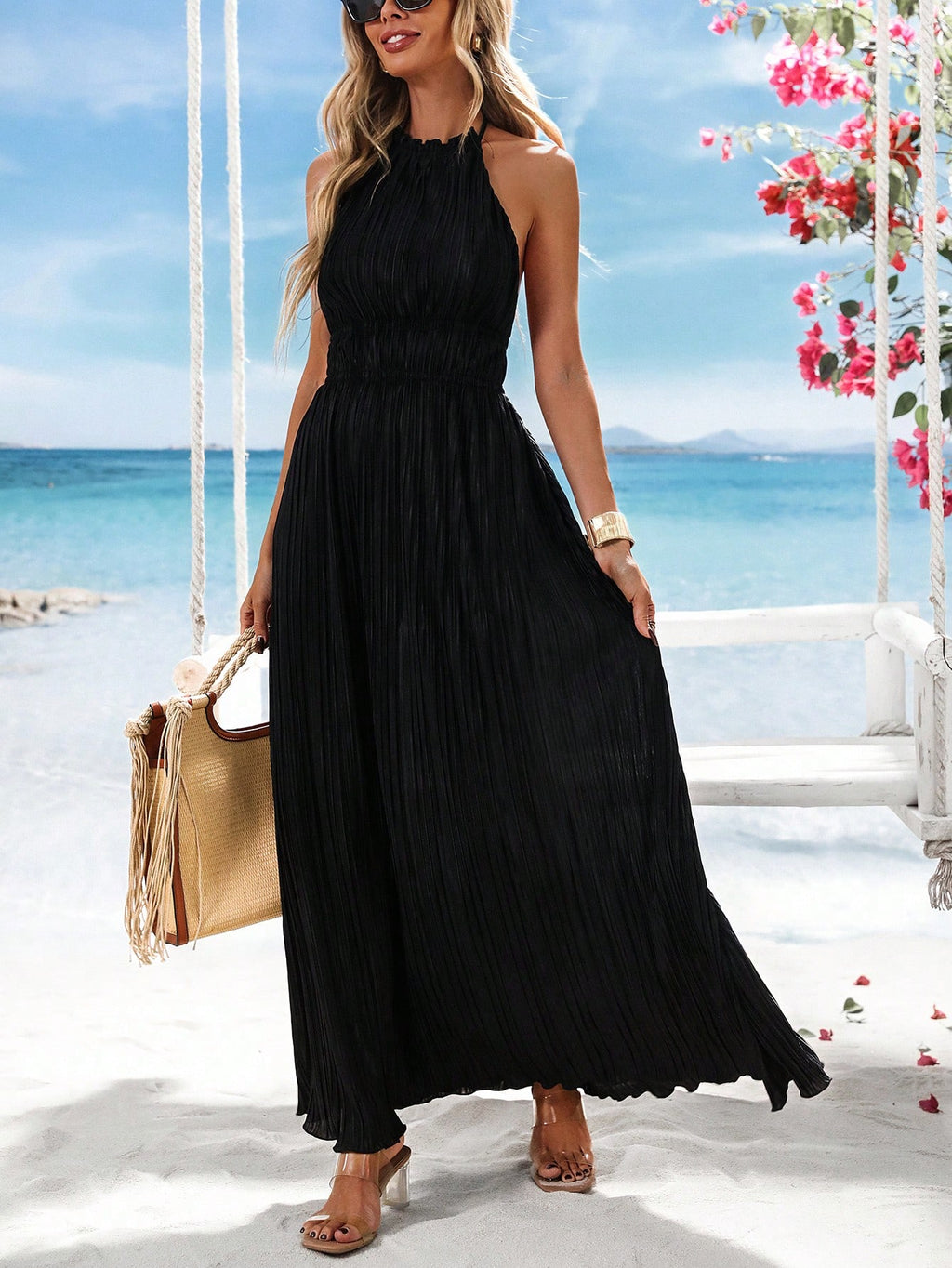 MIU Beach Vacation Casual Black Halter Neck Pleated Open Back Dress, Spring