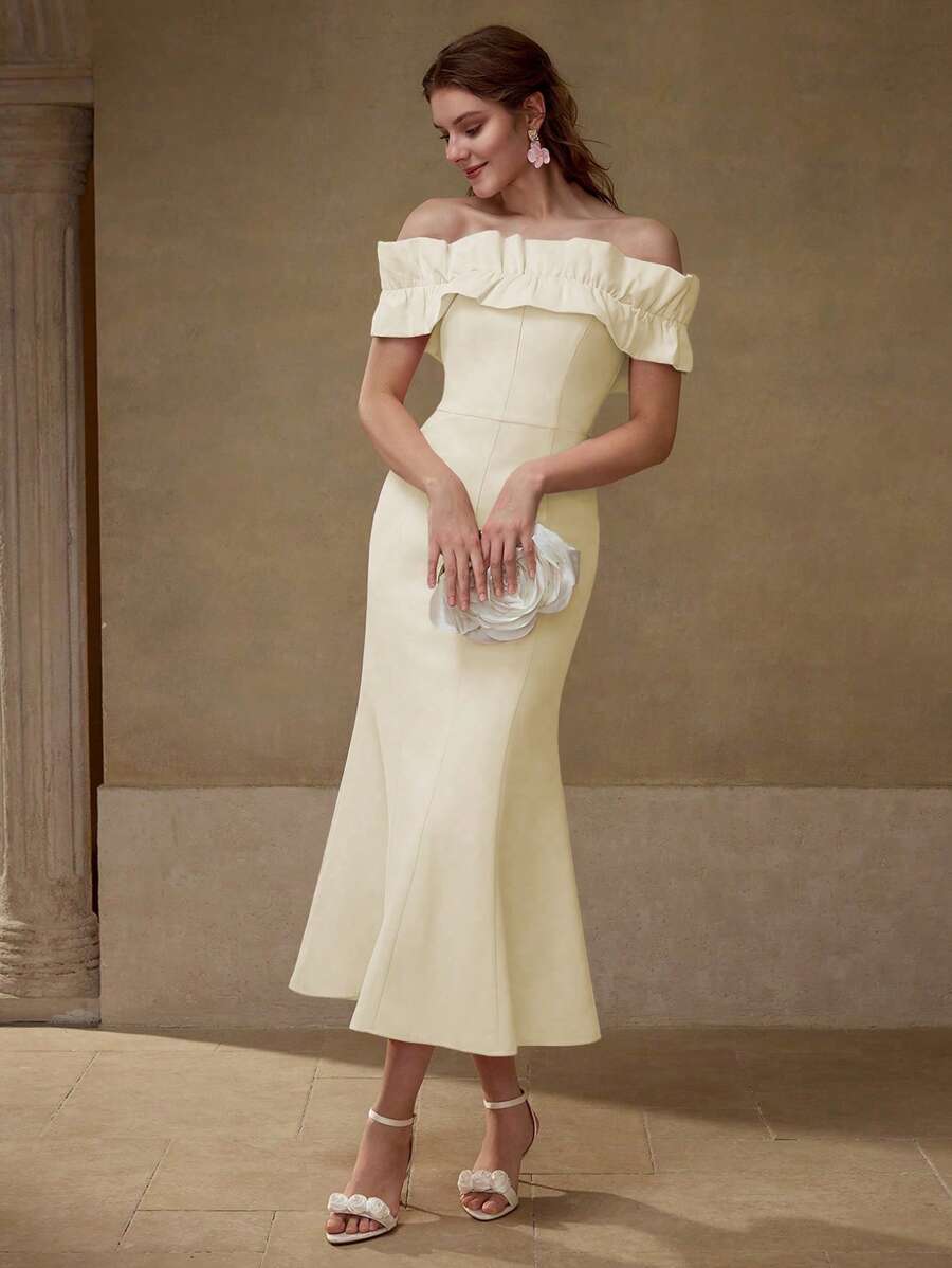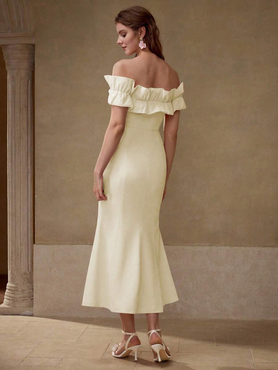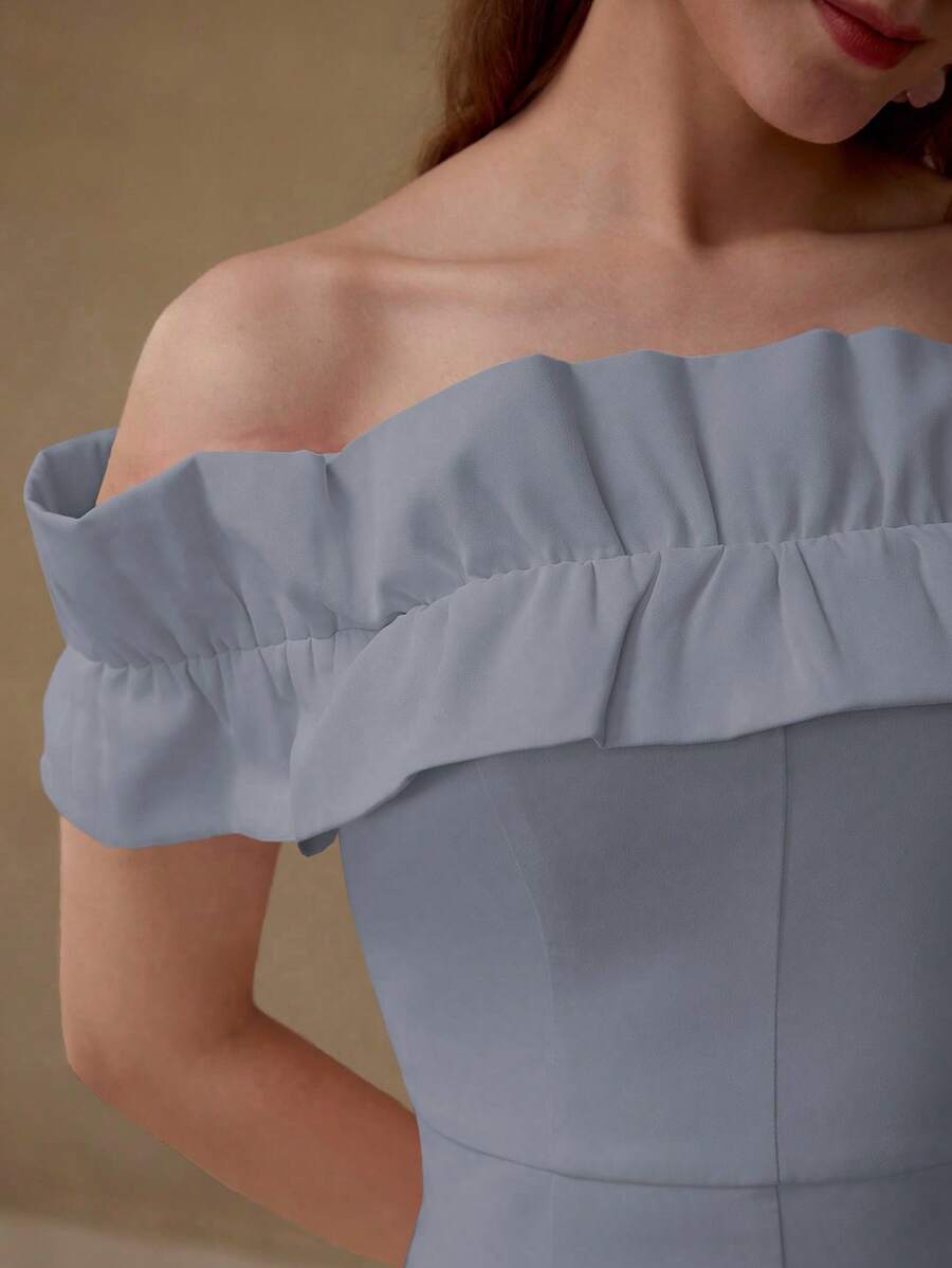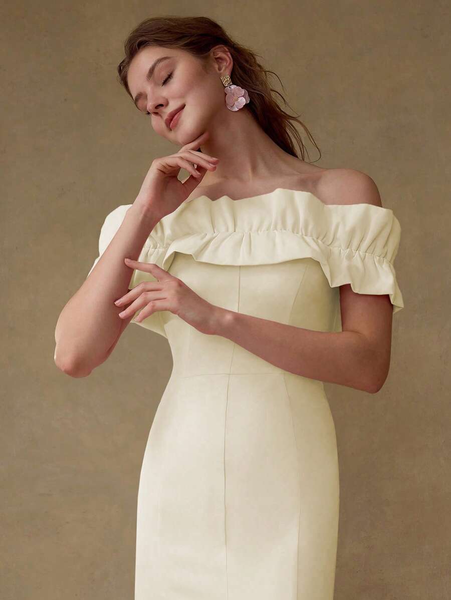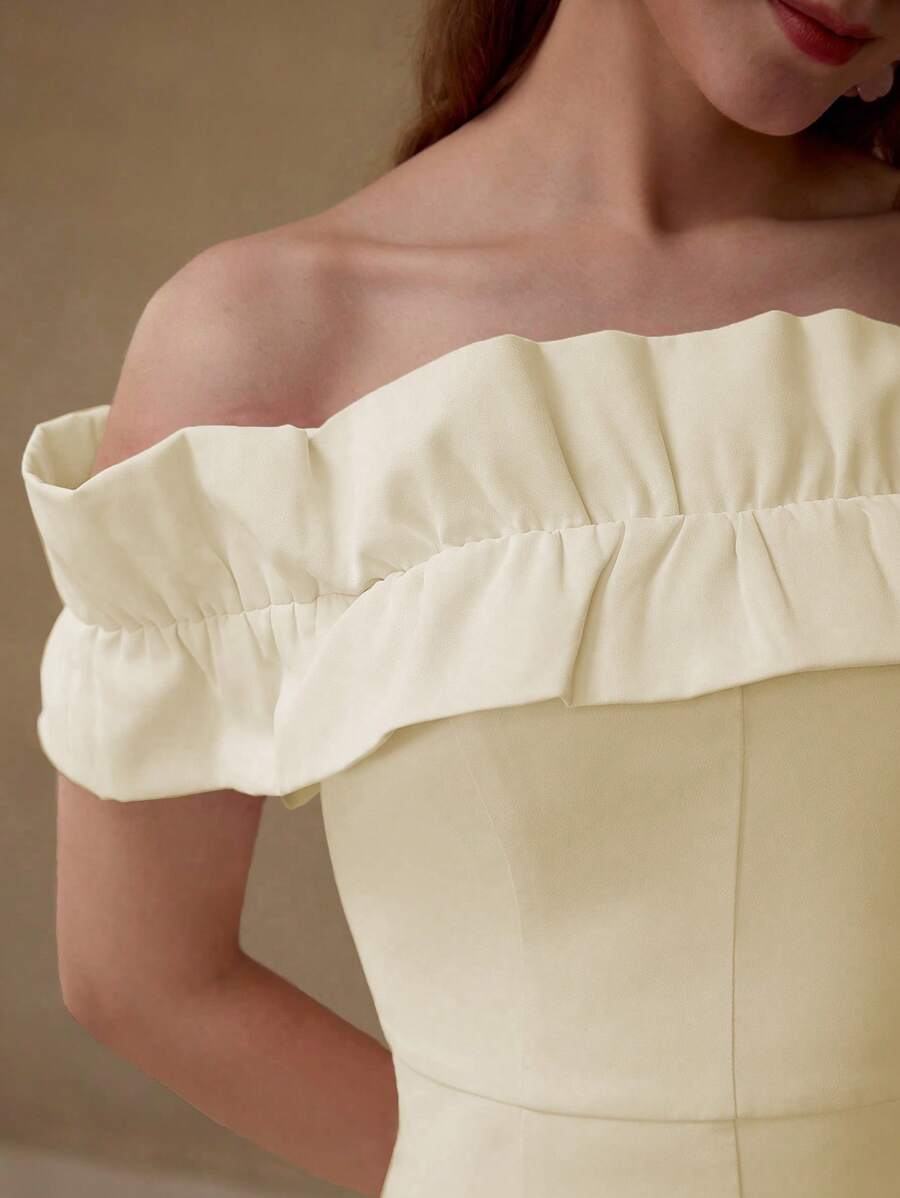 MIU BIAS CUT RUFFLE OFF SHOULDER DRESS