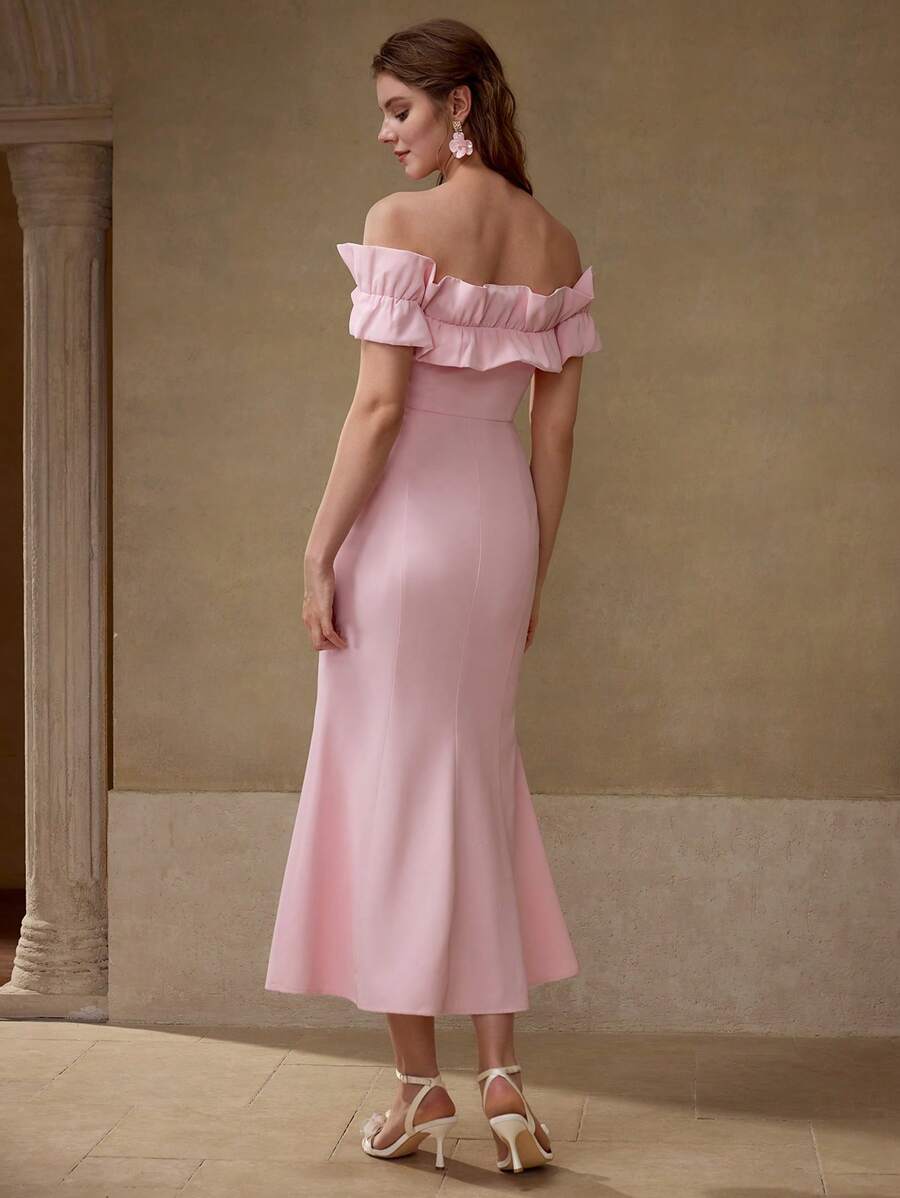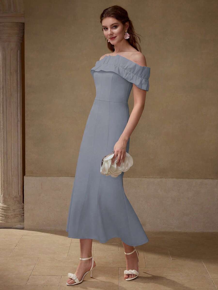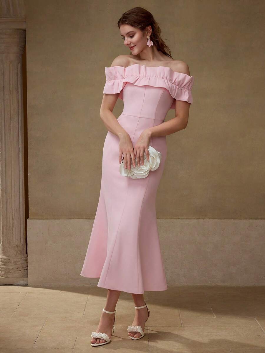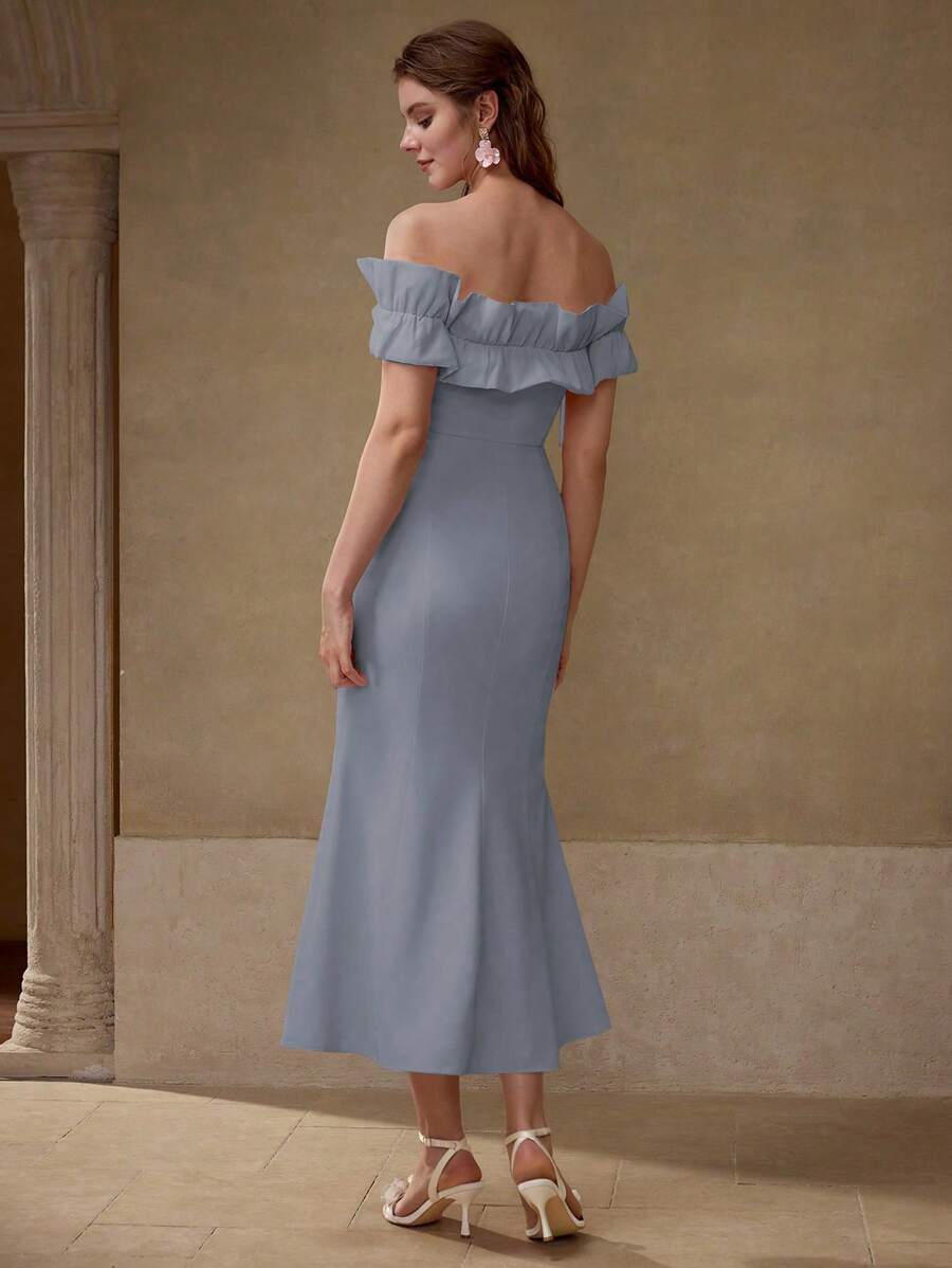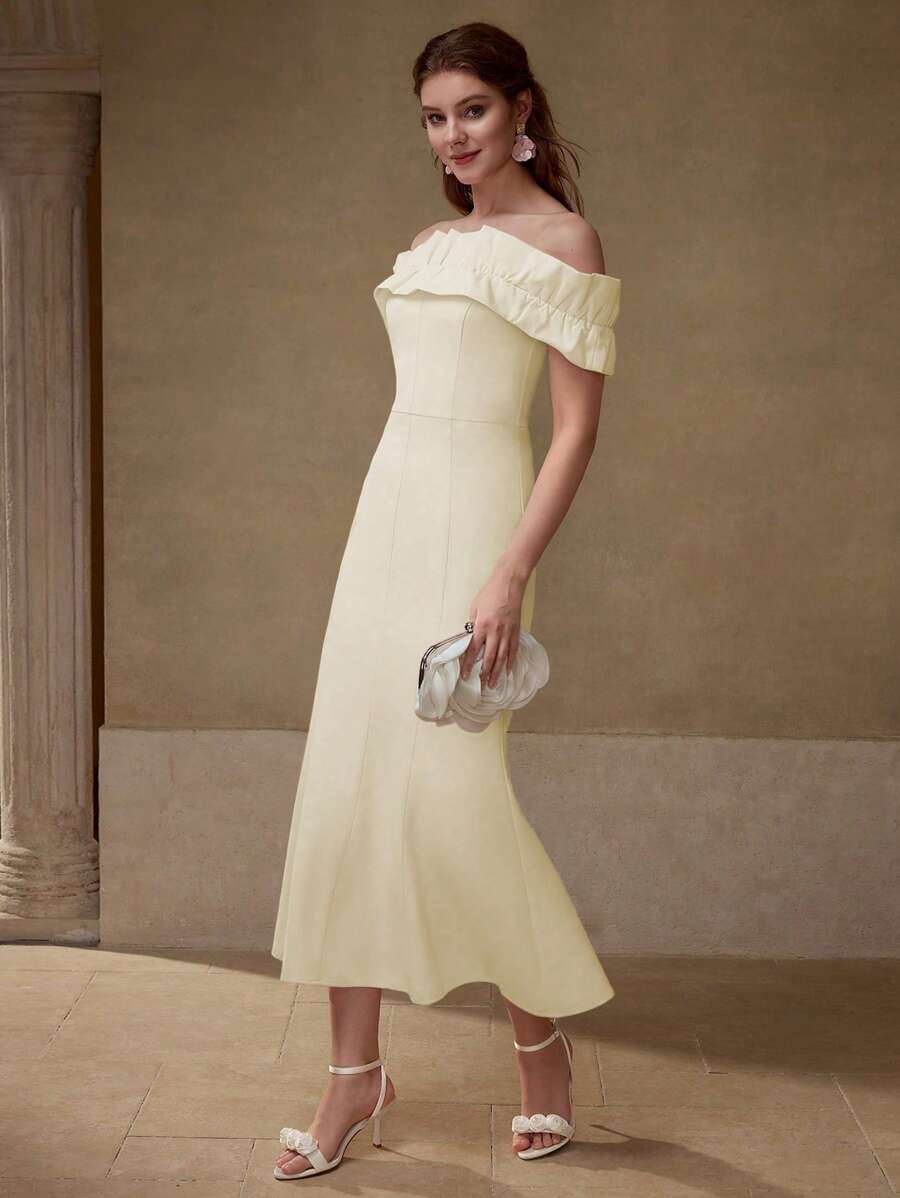MIU BIAS CUT RUFFLE OFF SHOULDER DRESS
