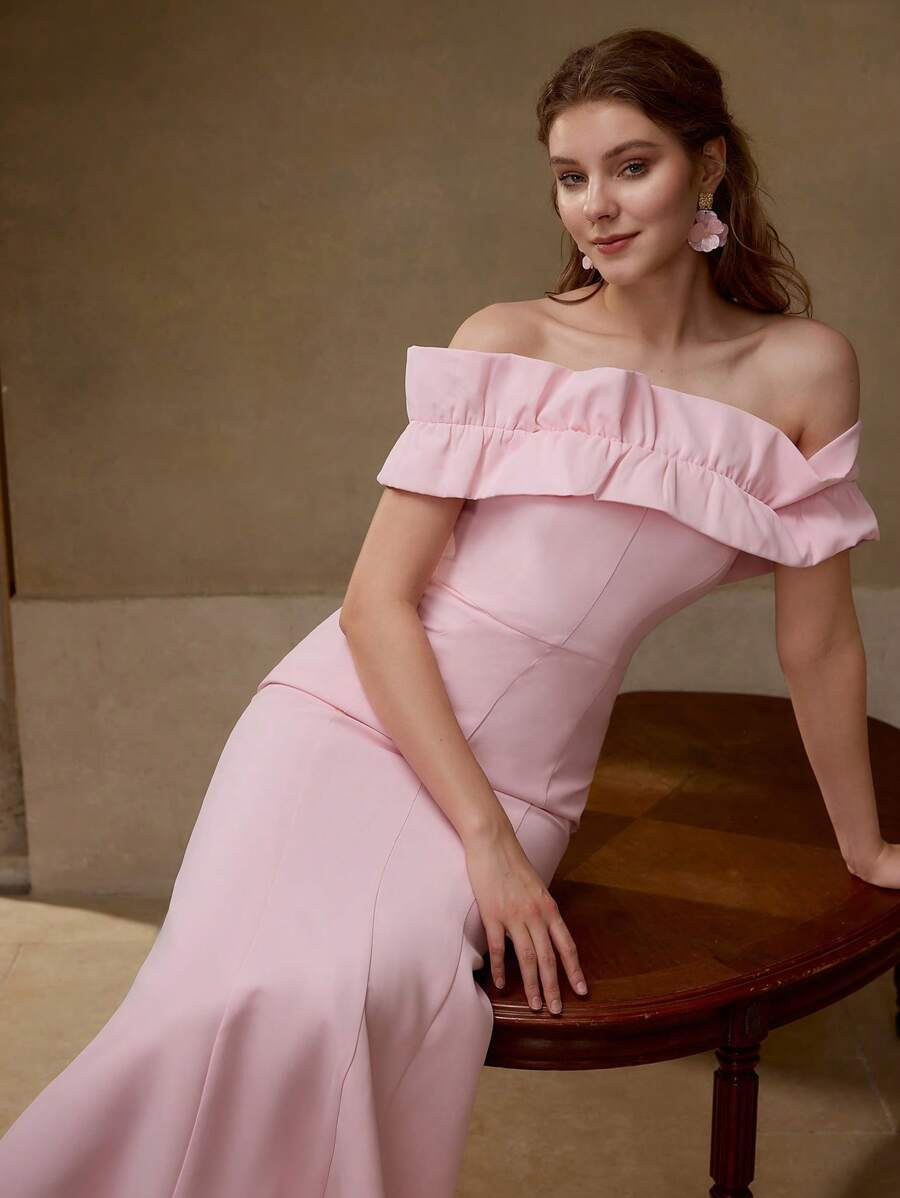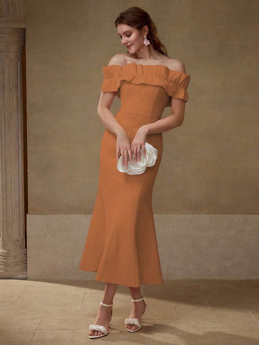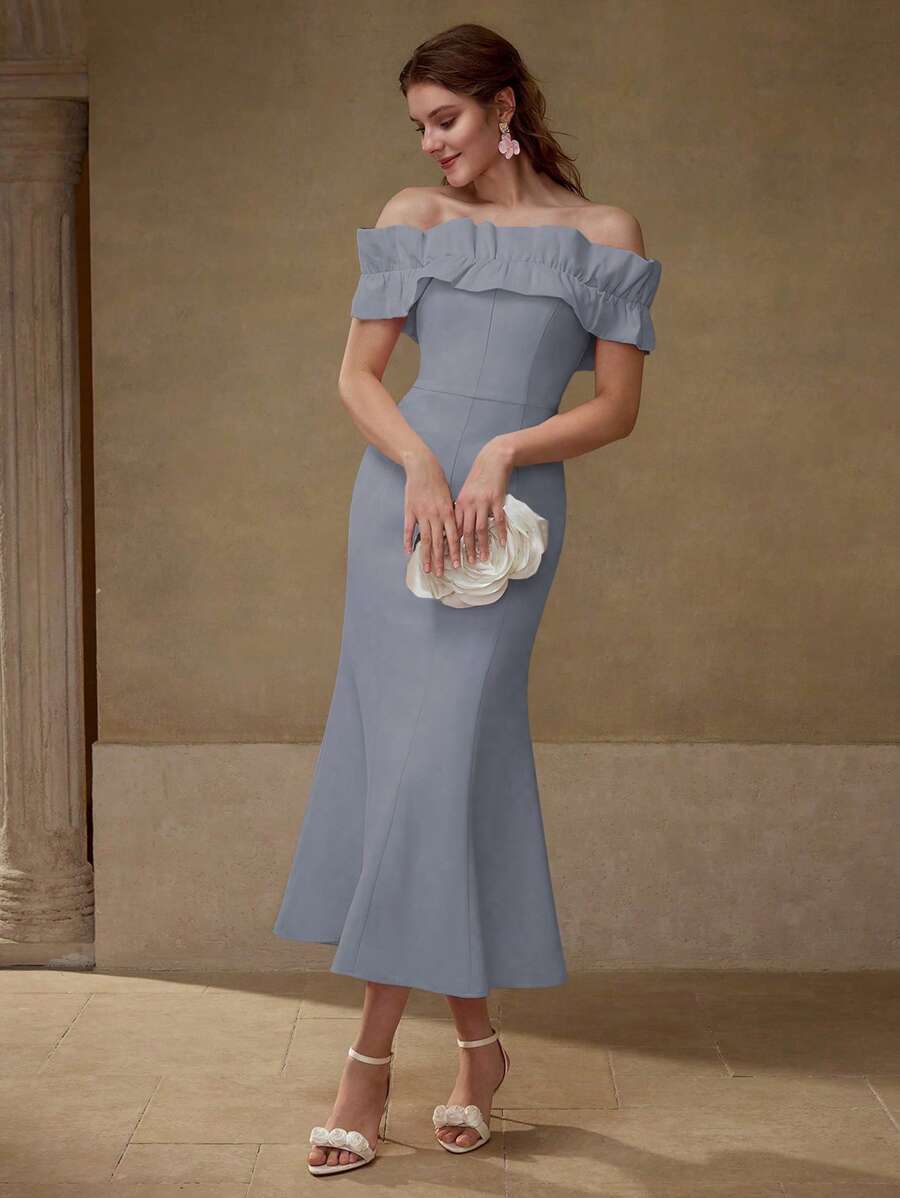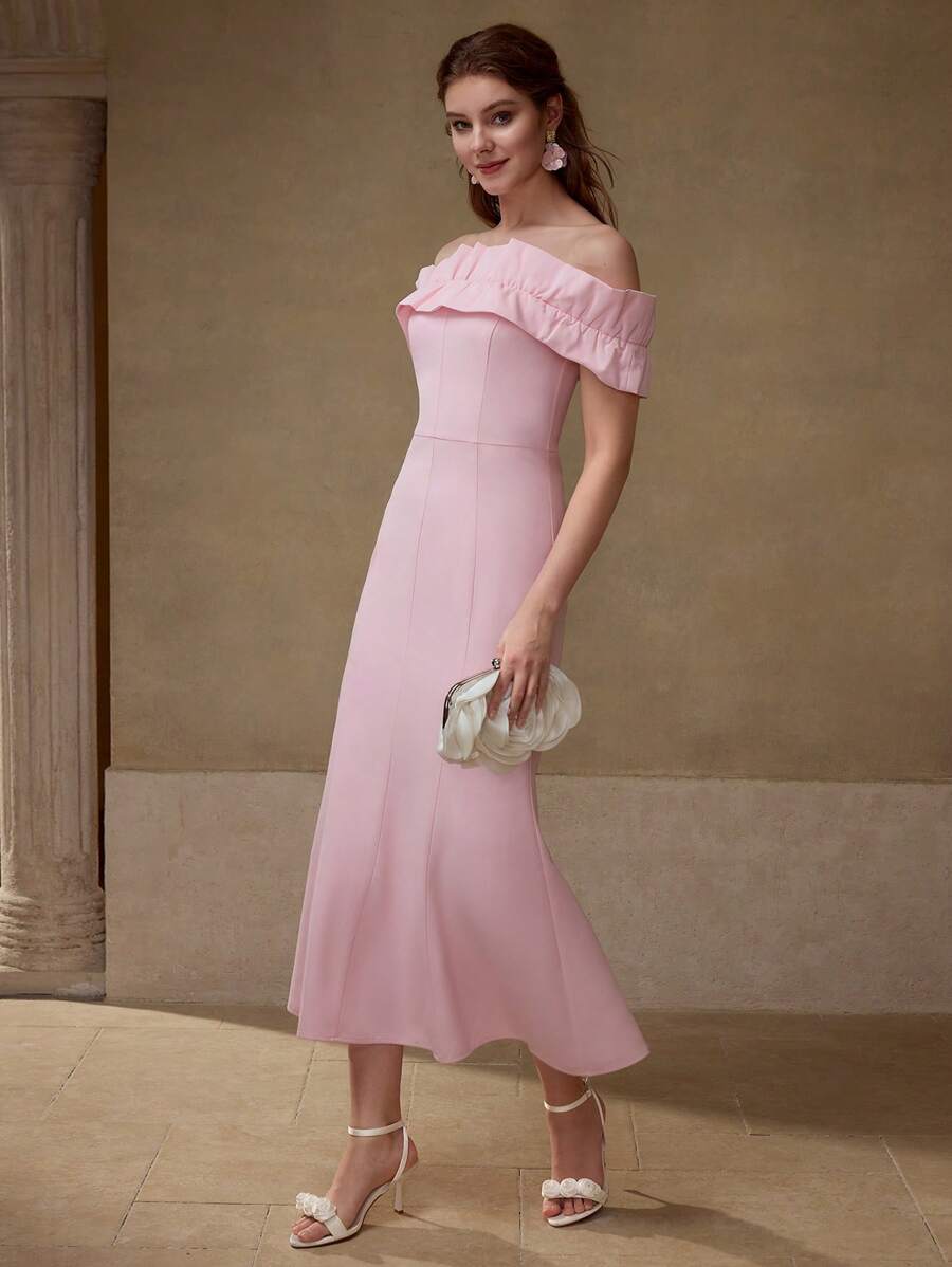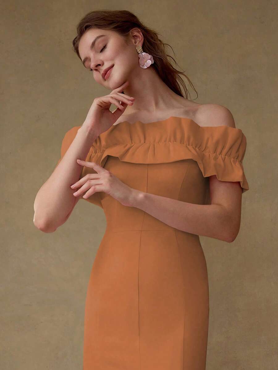 MIU BIAS CUT RUFFLE OFF SHOULDER DRESS