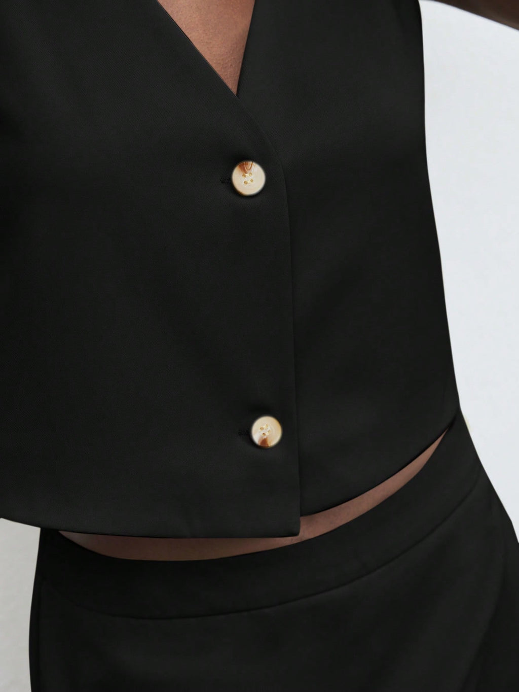 MIU Black Sleeveless Single-Breasted V-Neck Vest Top, Basic Versatile Minimalist Skort, Summer Fashion High-End Modern Urban Style Women's 2 Pieces Set, Suitable For Wedding Guests, Elegant Business Casual