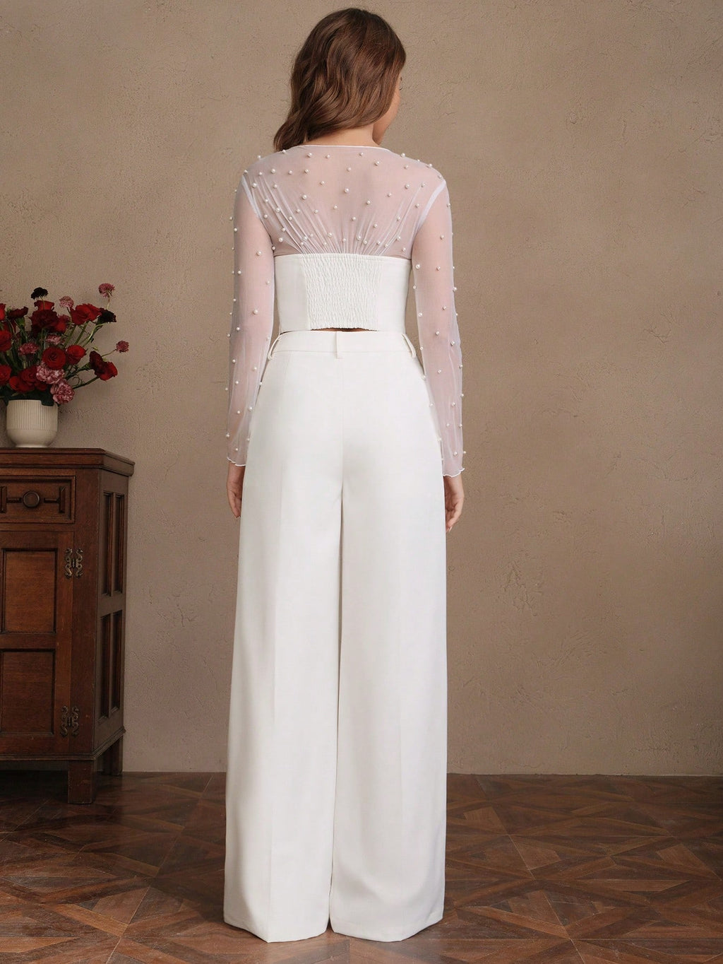 MIU Classic Spring/Summer Formal Date Party Birthday Pearl Decor V-Neck Sheer Top Pants 2 Pieces Set For Business Casual Office Wear