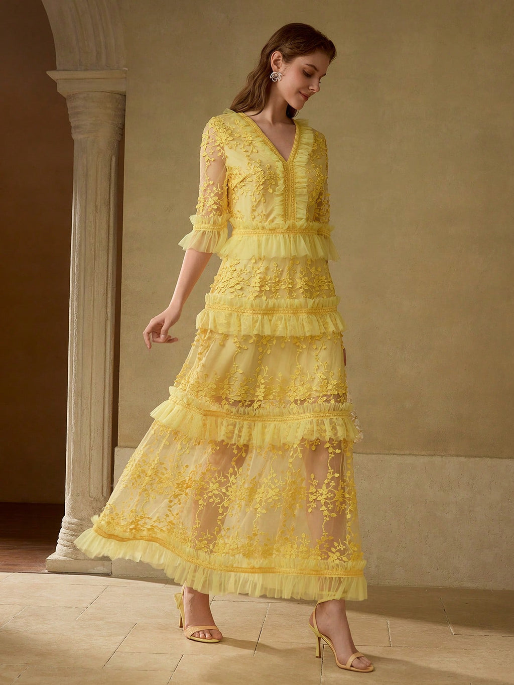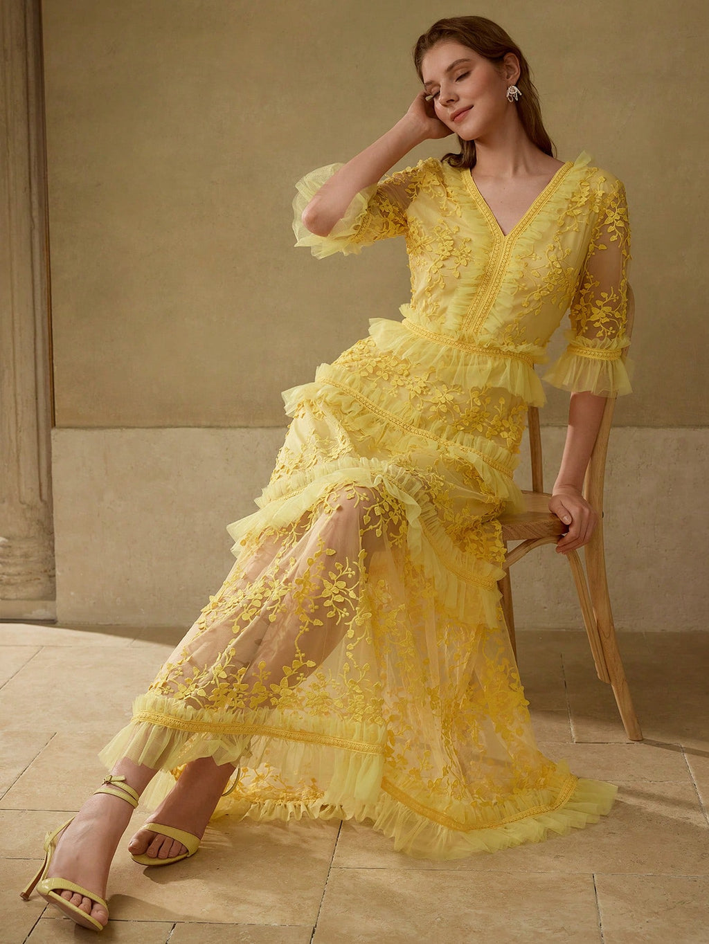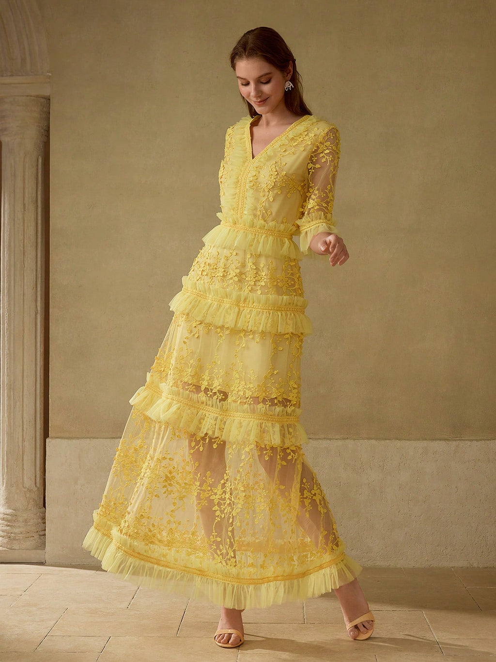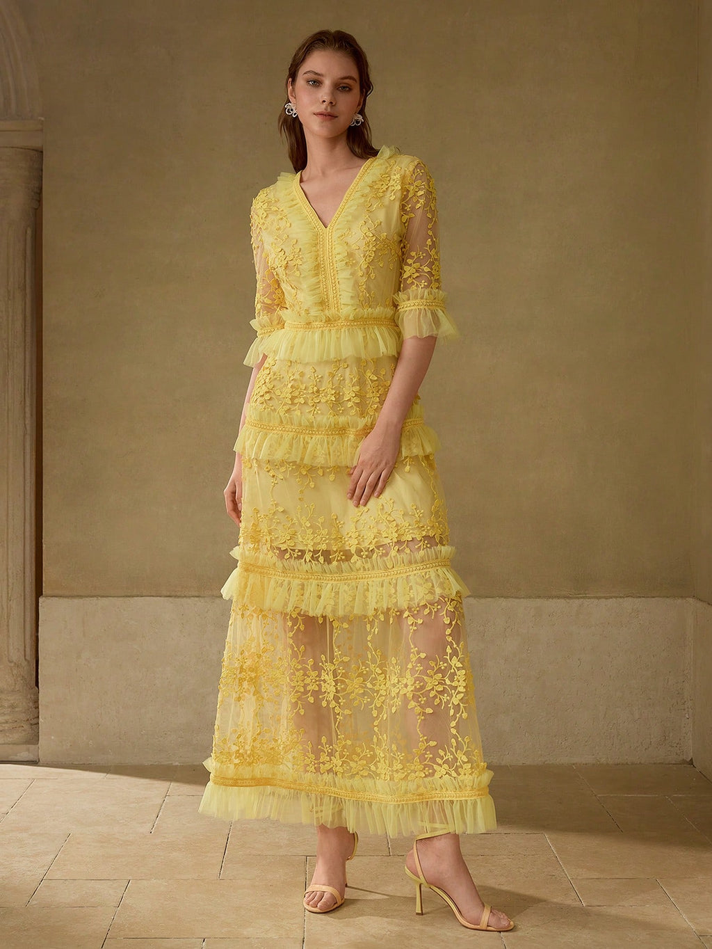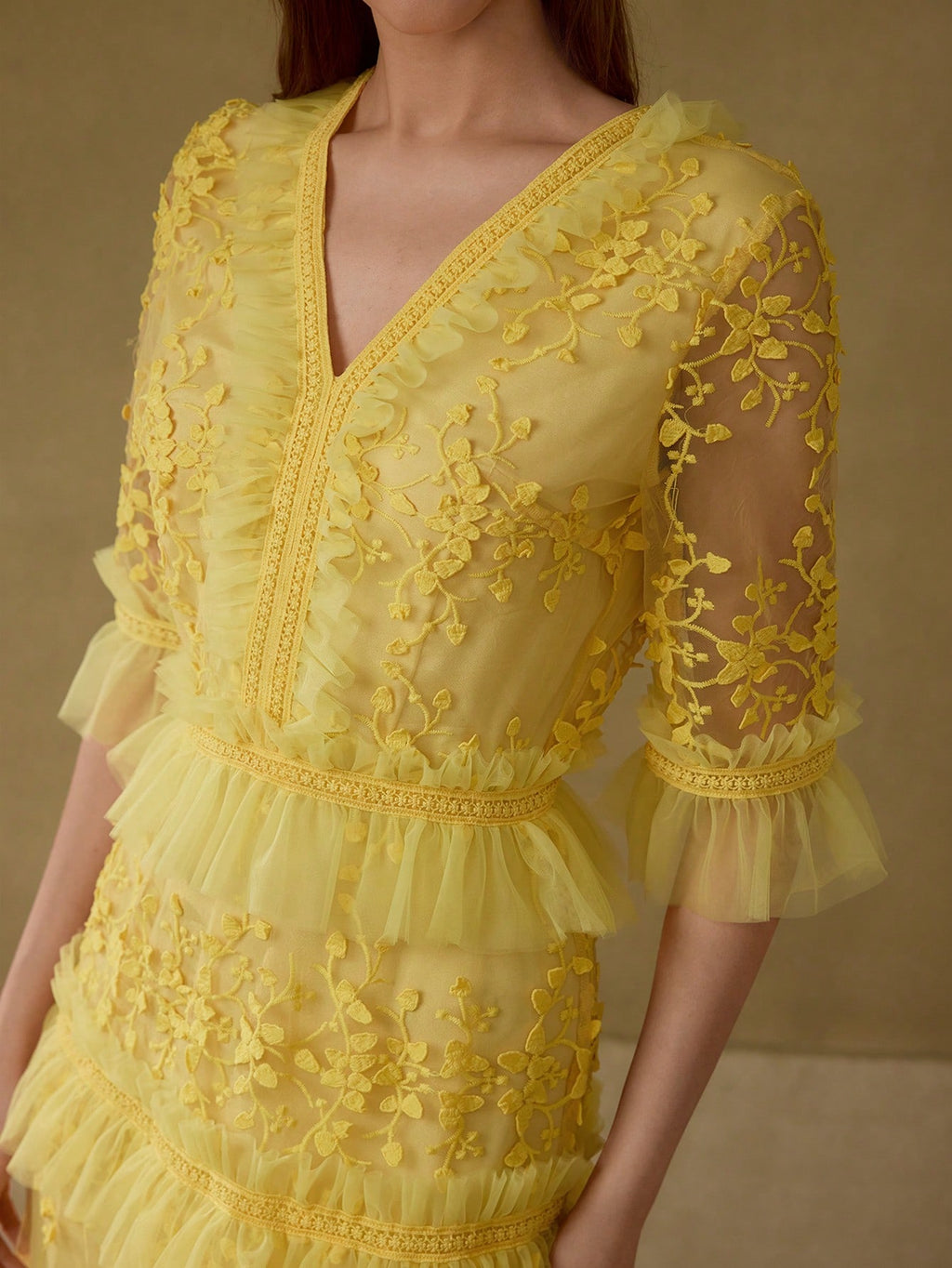 MIU CONTRAST LACE EMBROIDERED RUFFLE HEM DRESS