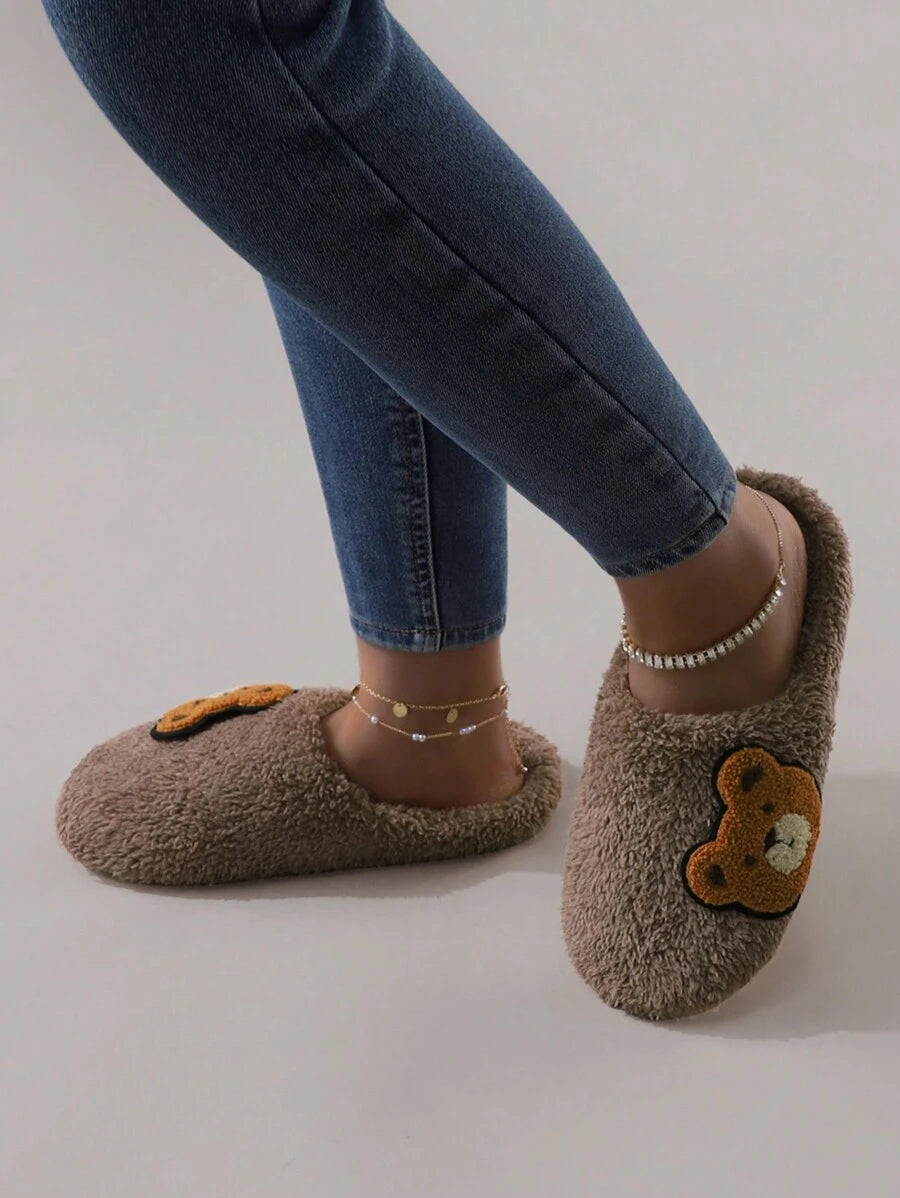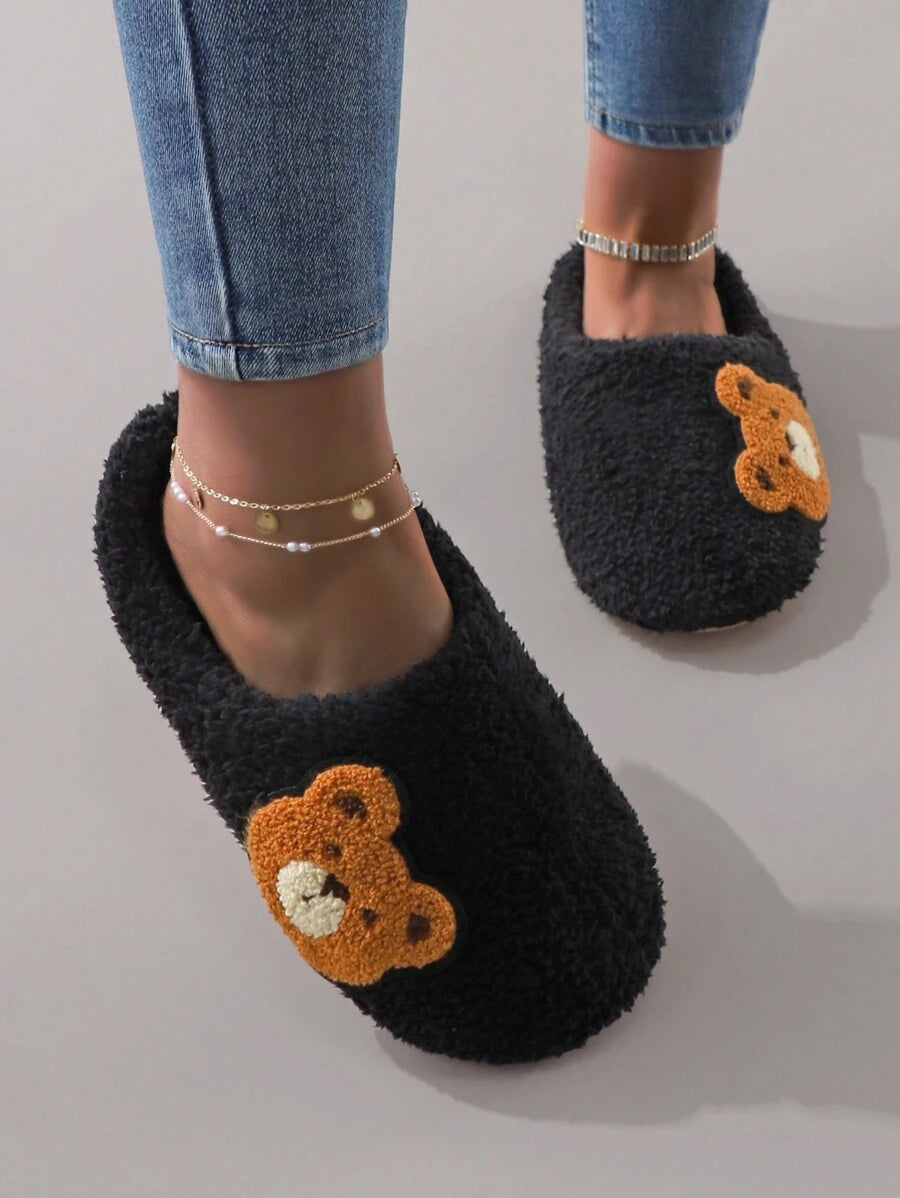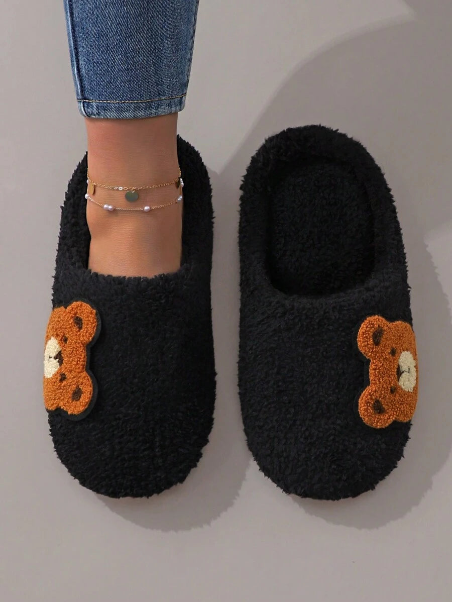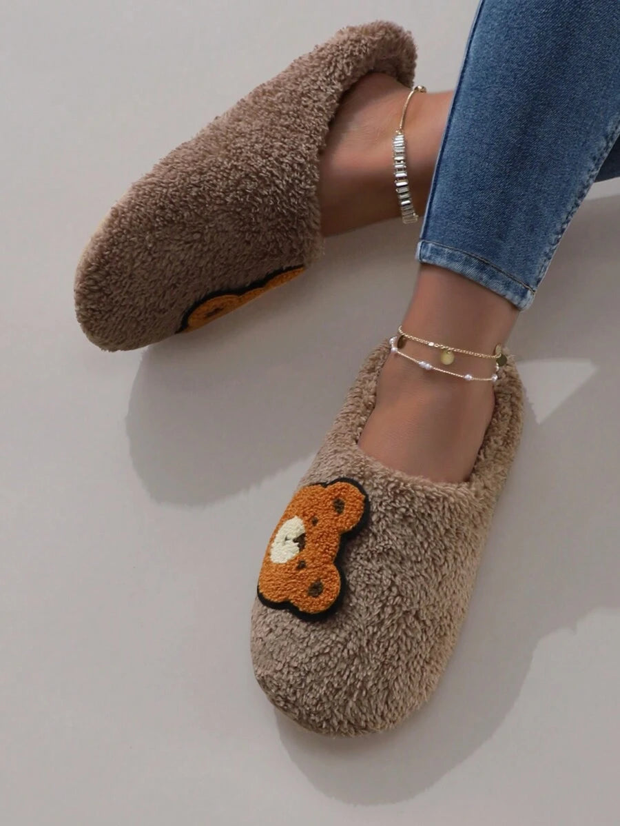 MIU Cute Cartoon Embroidered Bear Plush Silent Soft Bottom Slippers, Women Indoor Floor Slipper Socks