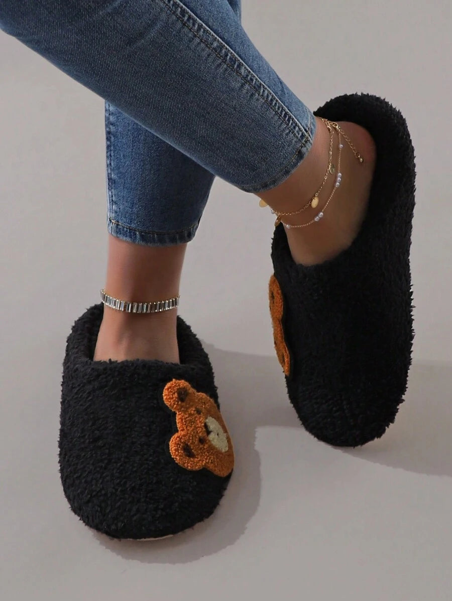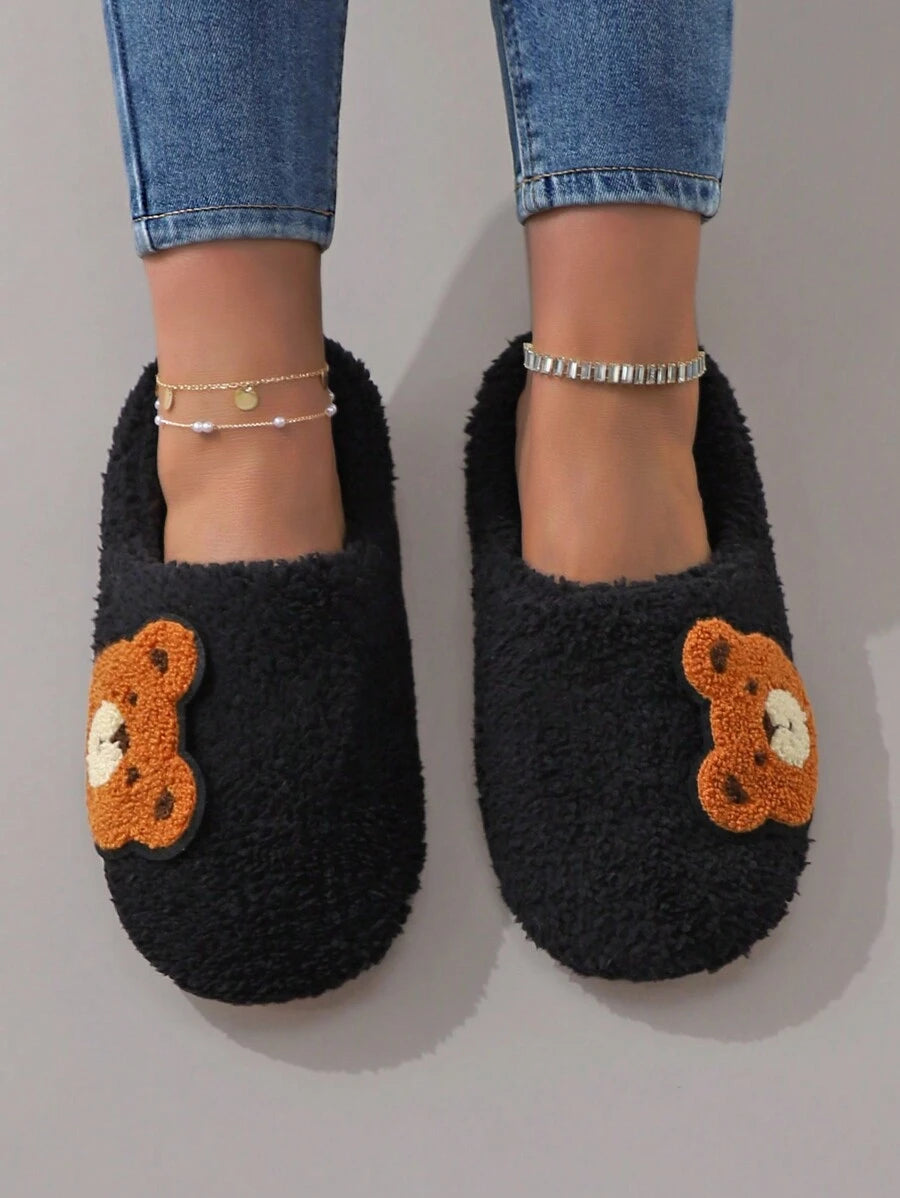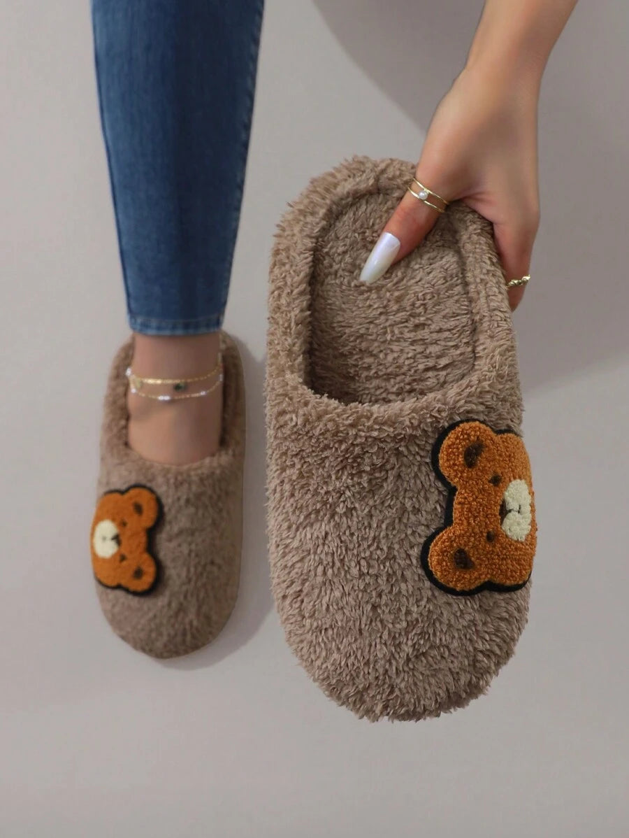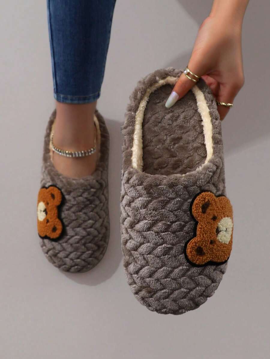 MIU Cute Cartoon Embroidered Bear Plush Silent Soft Bottom Slippers, Women Indoor Floor Slipper Socks