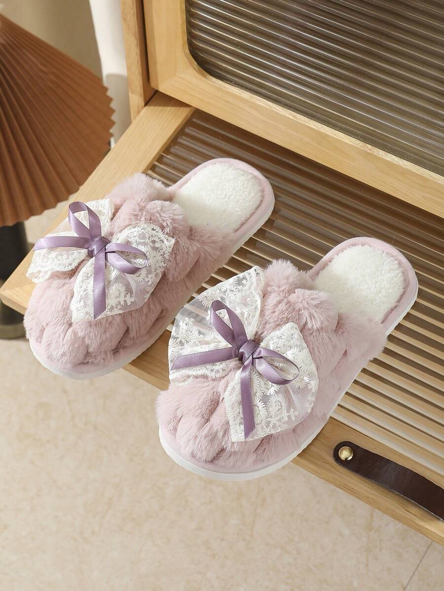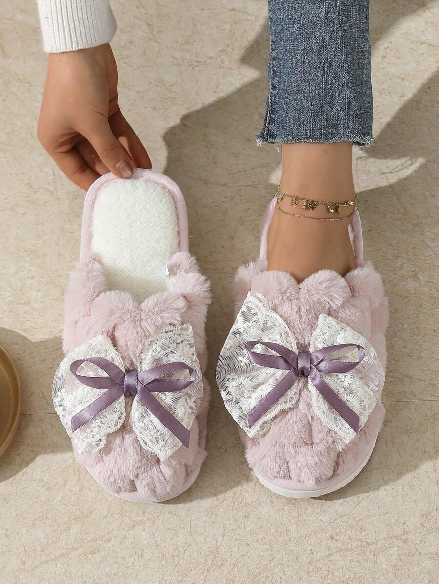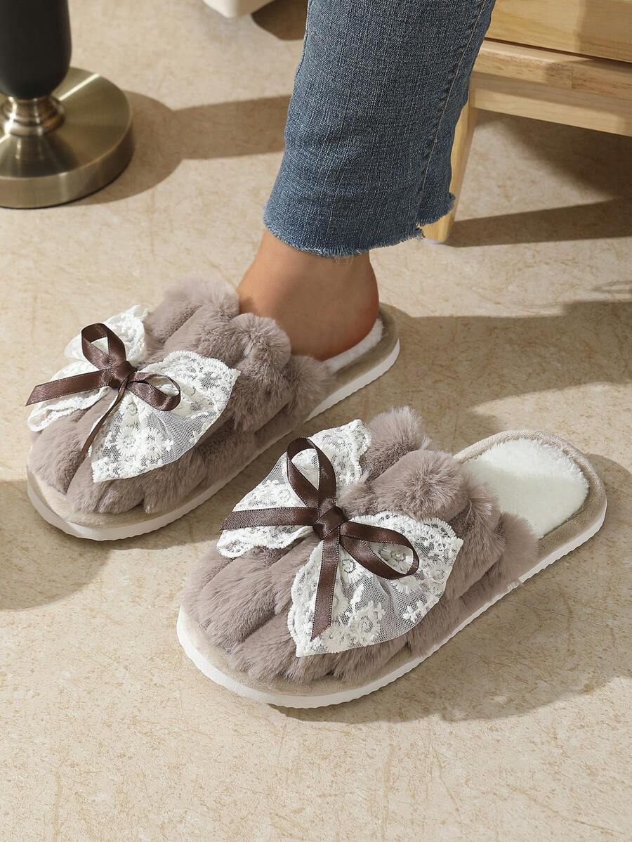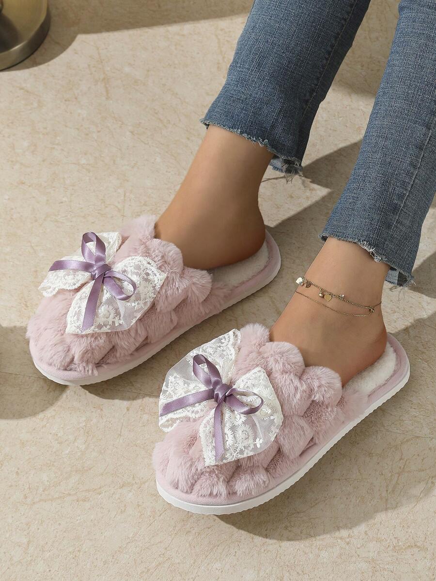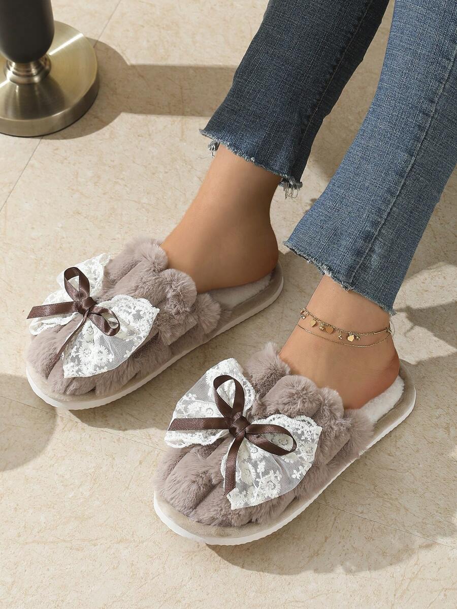 MIU Cute Lace Bow Women Slippers For Indoor House Wear, Lightweight Non-Slip Warm Fuzzy Plush Slides, Suitable For Autumn/Winter