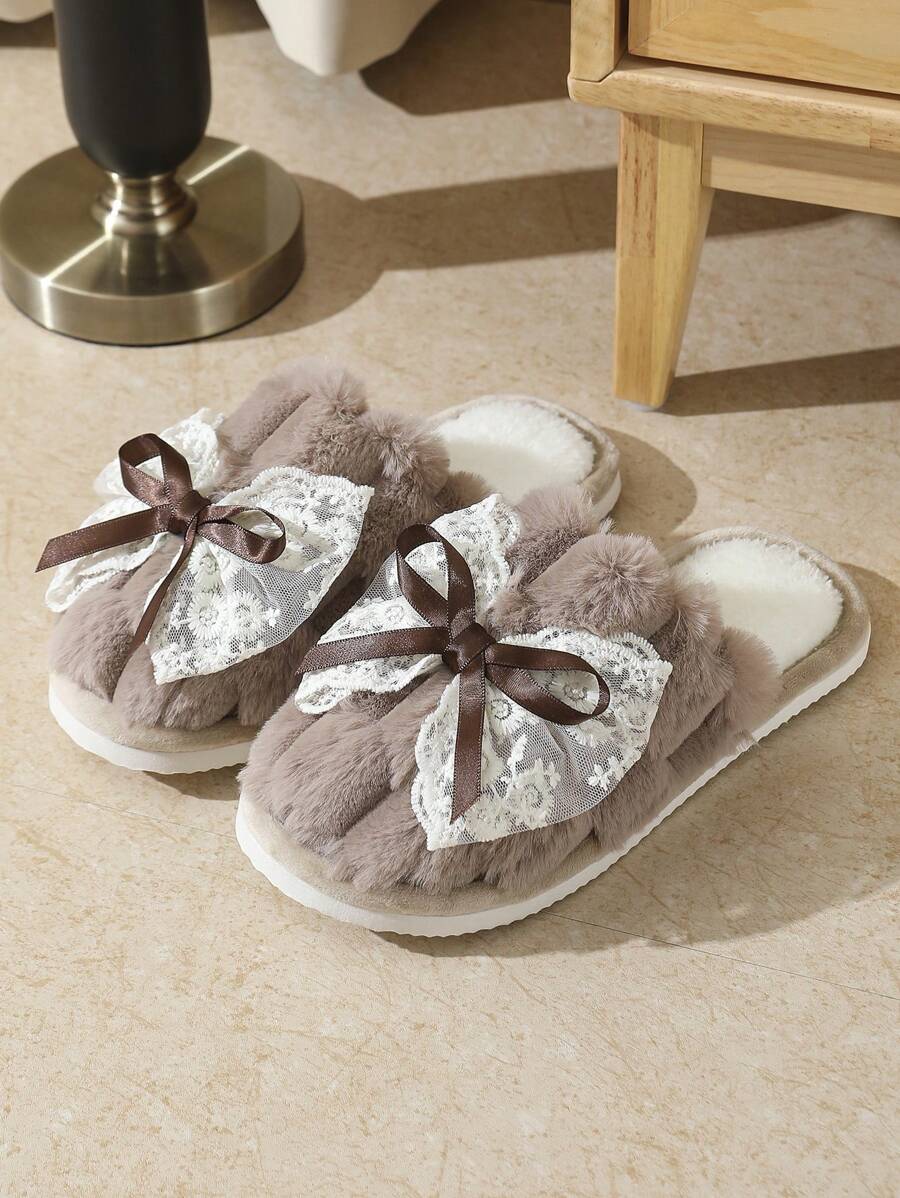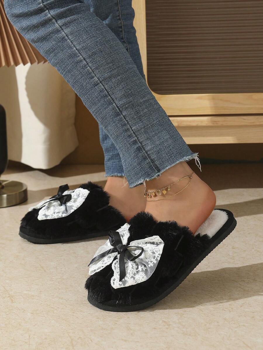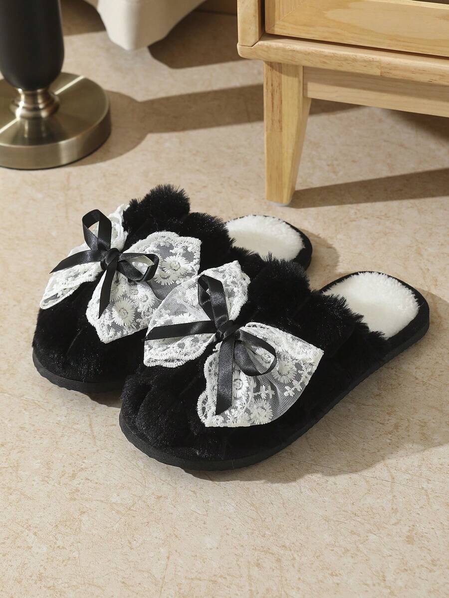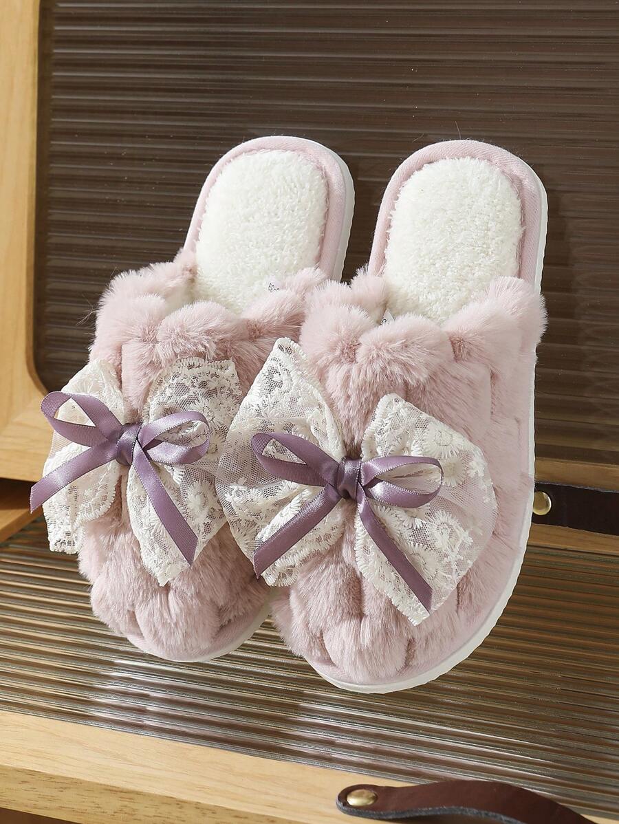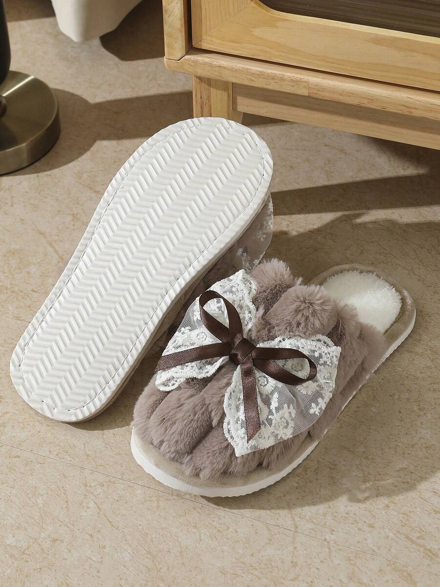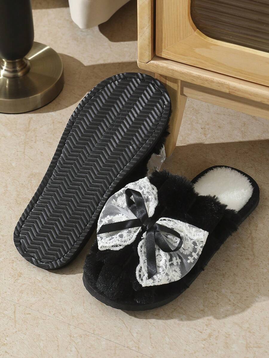 MIU Cute Lace Bow Women Slippers For Indoor House Wear, Lightweight Non-Slip Warm Fuzzy Plush Slides, Suitable For Autumn/Winter