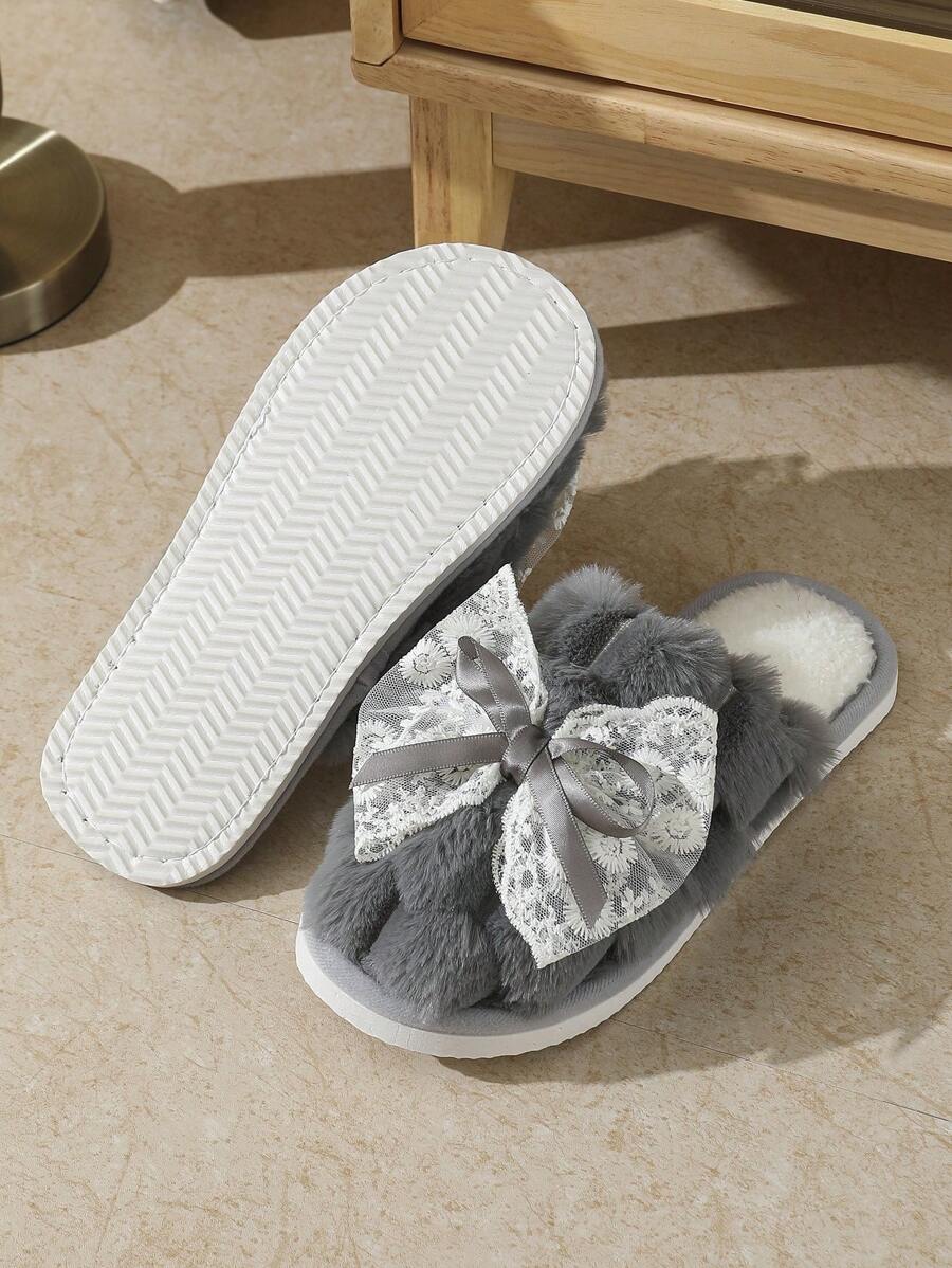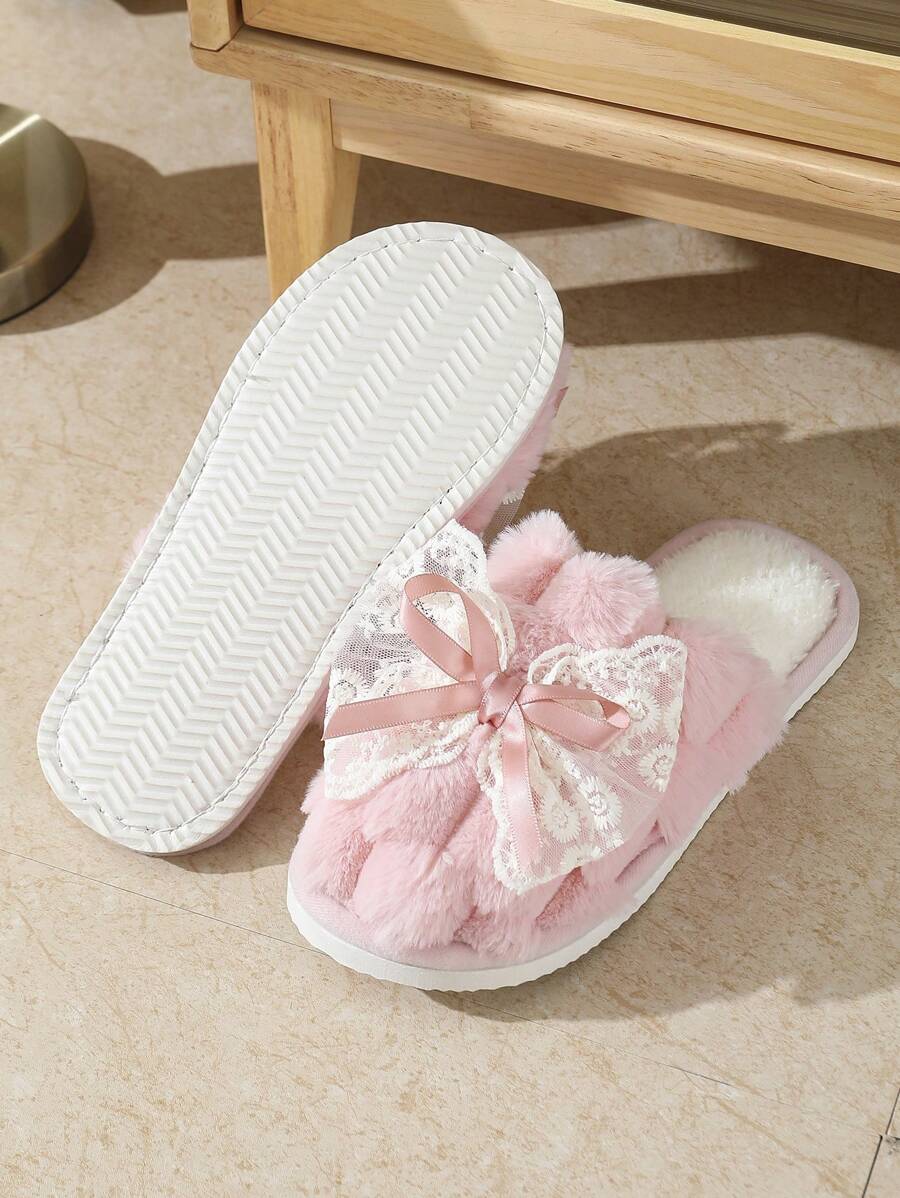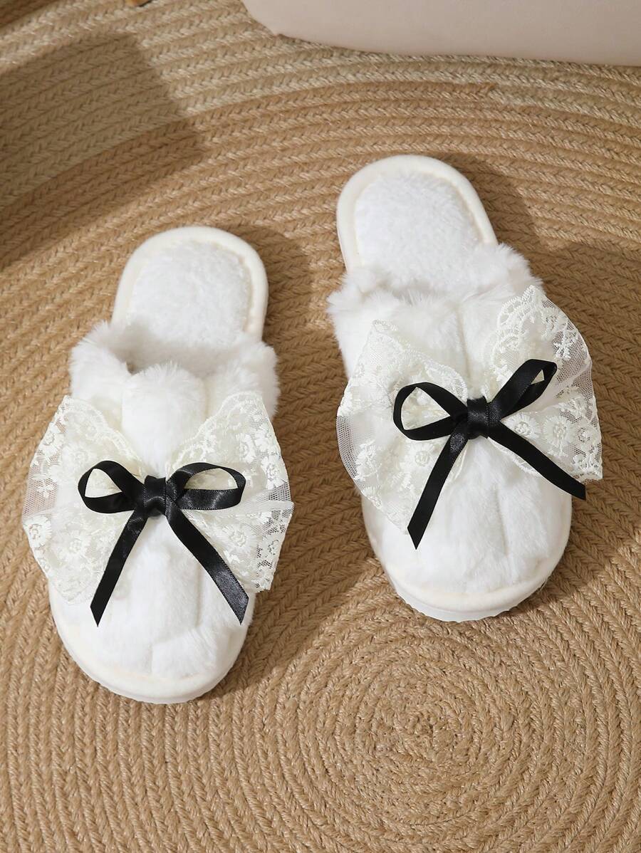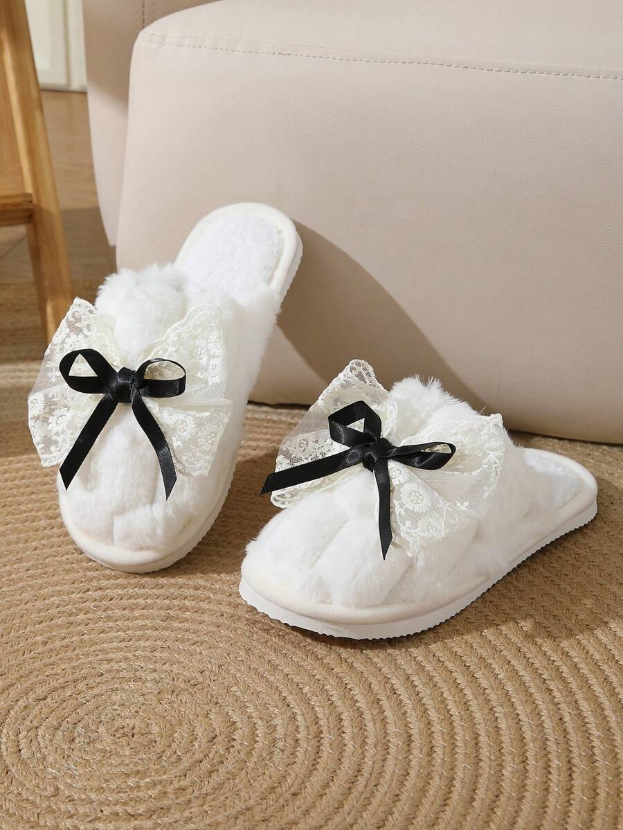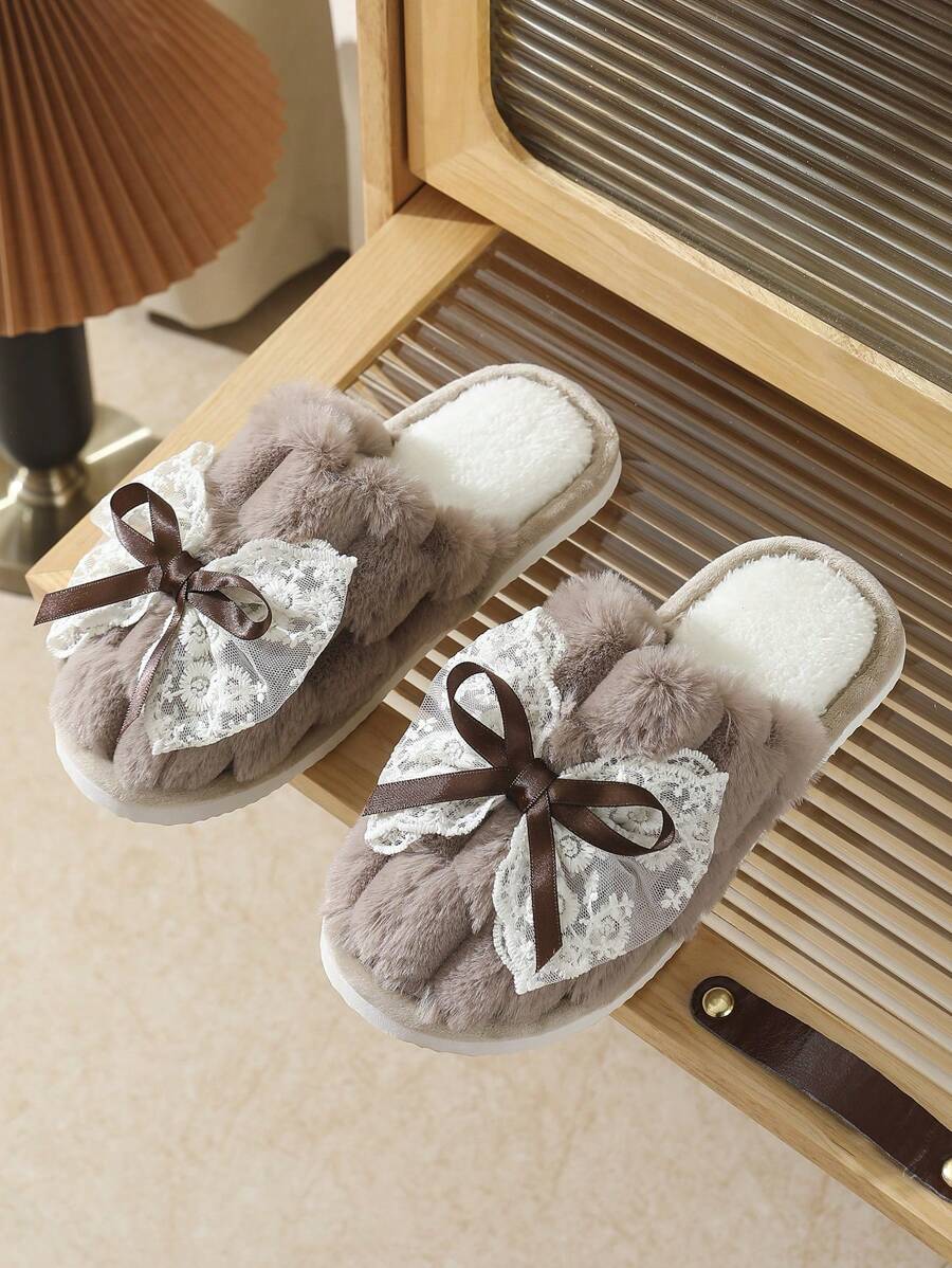 MIU Cute Lace Bow Women Slippers For Indoor House Wear, Lightweight Non-Slip Warm Fuzzy Plush Slides, Suitable For Autumn/Winter