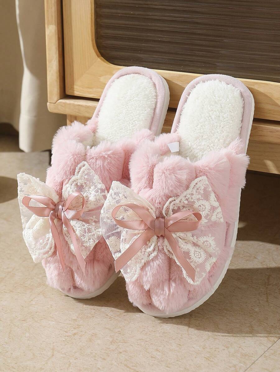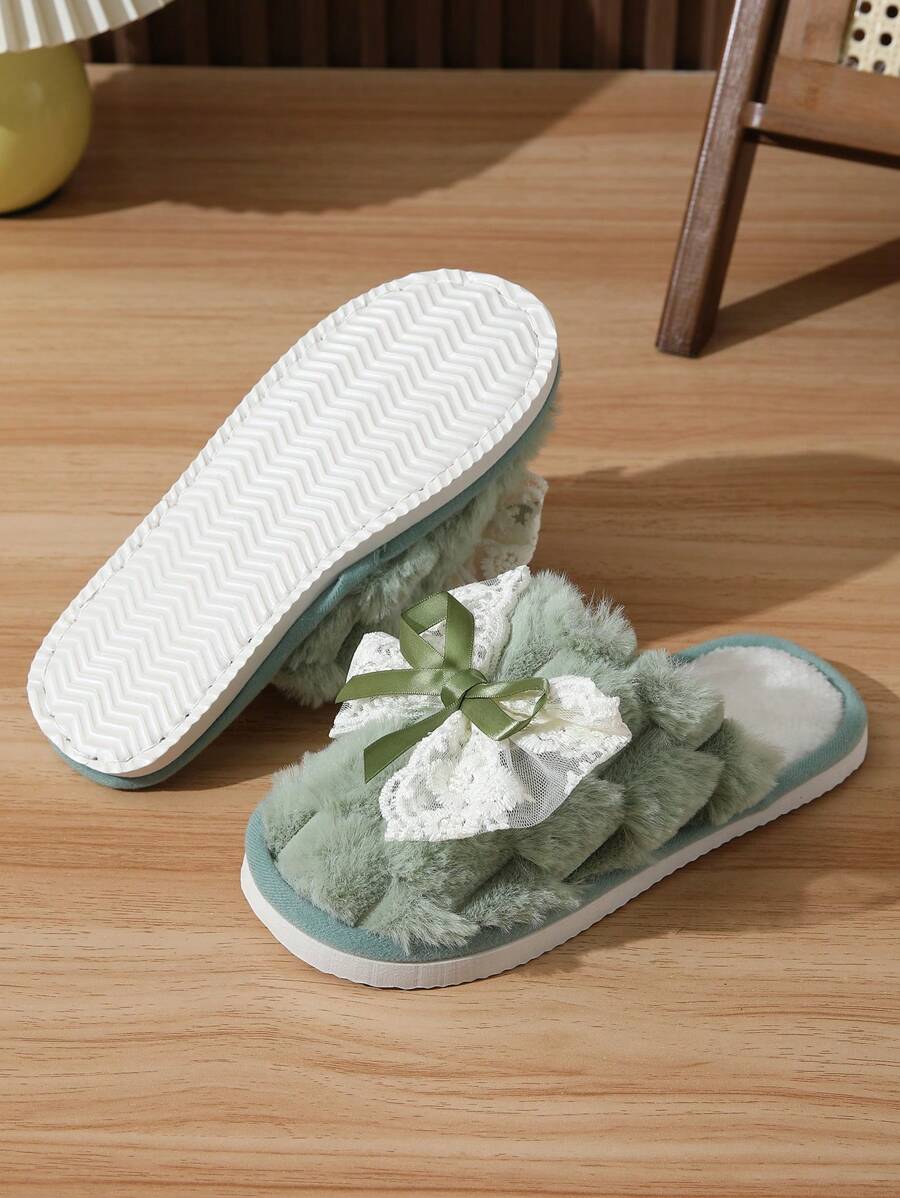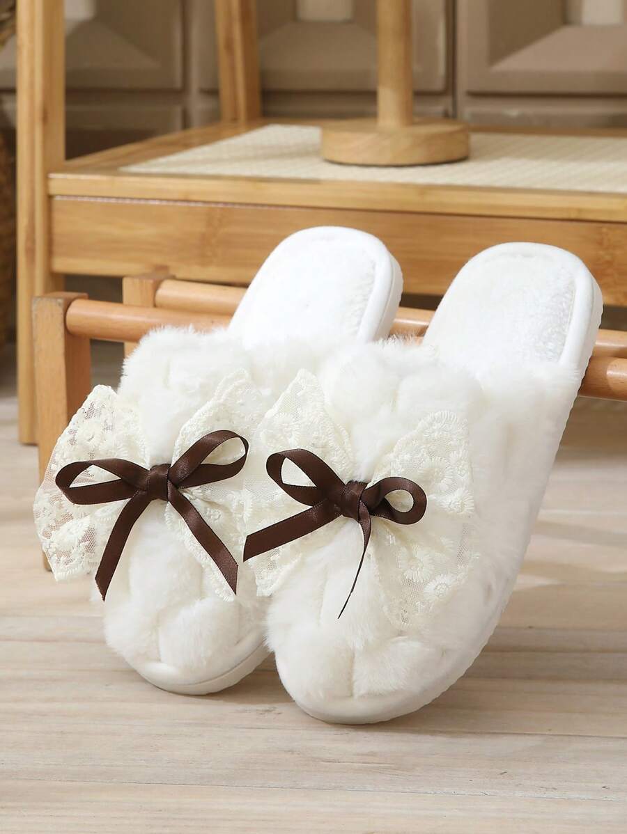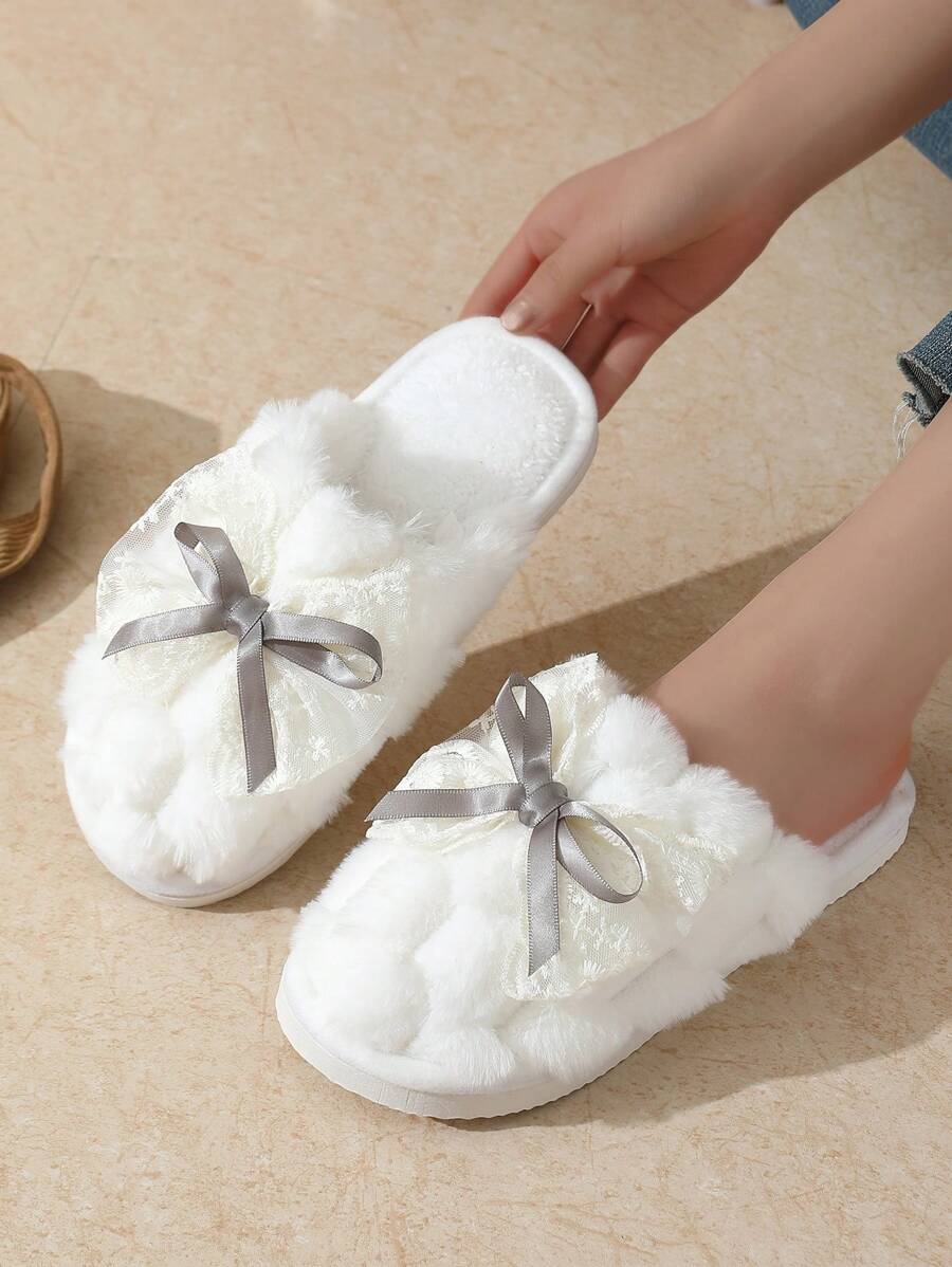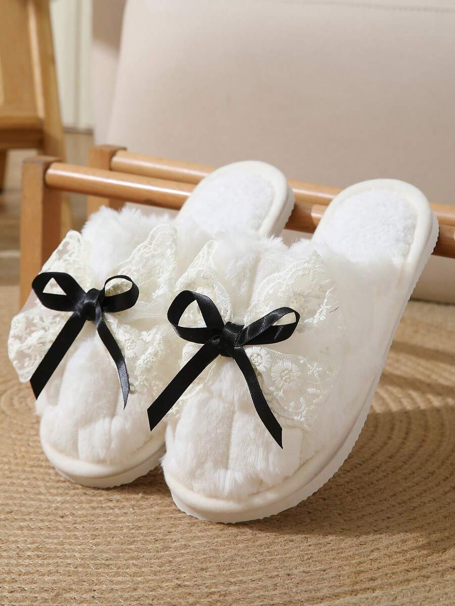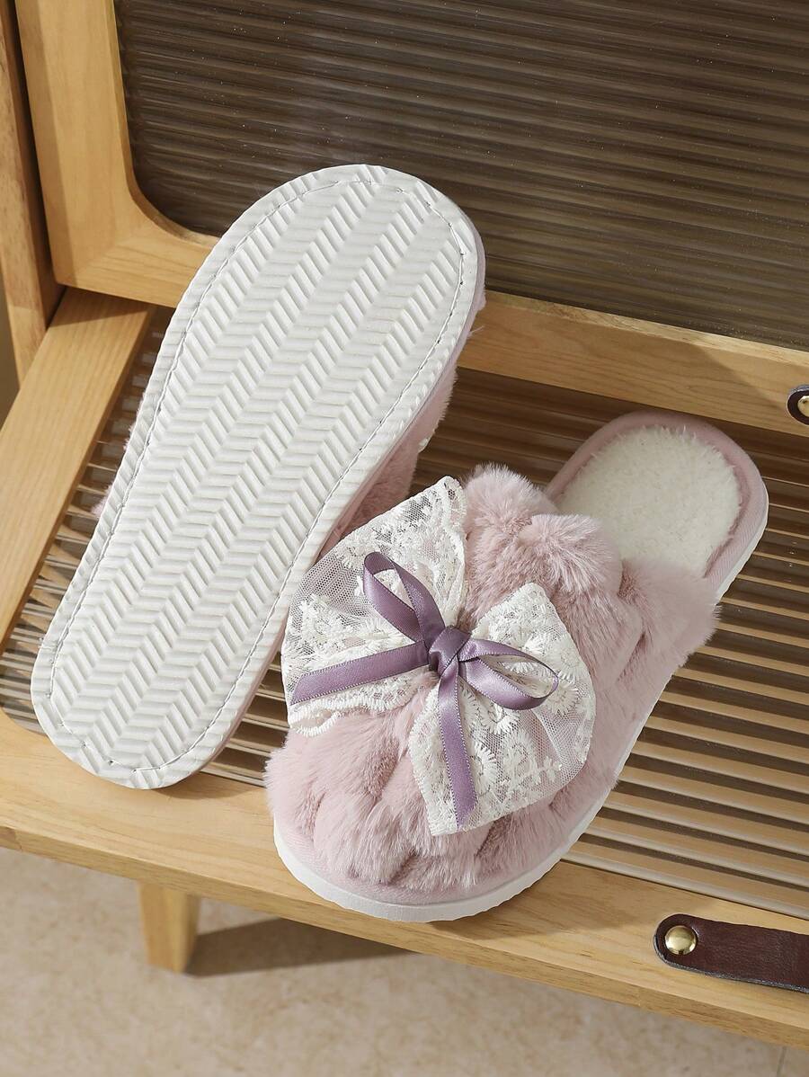 MIU Cute Lace Bow Women Slippers For Indoor House Wear, Lightweight Non-Slip Warm Fuzzy Plush Slides, Suitable For Autumn/Winter