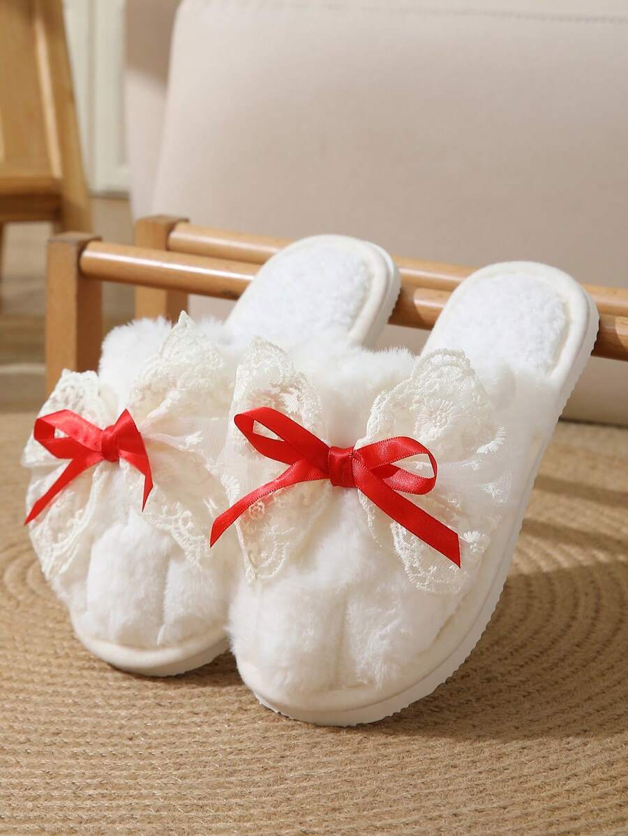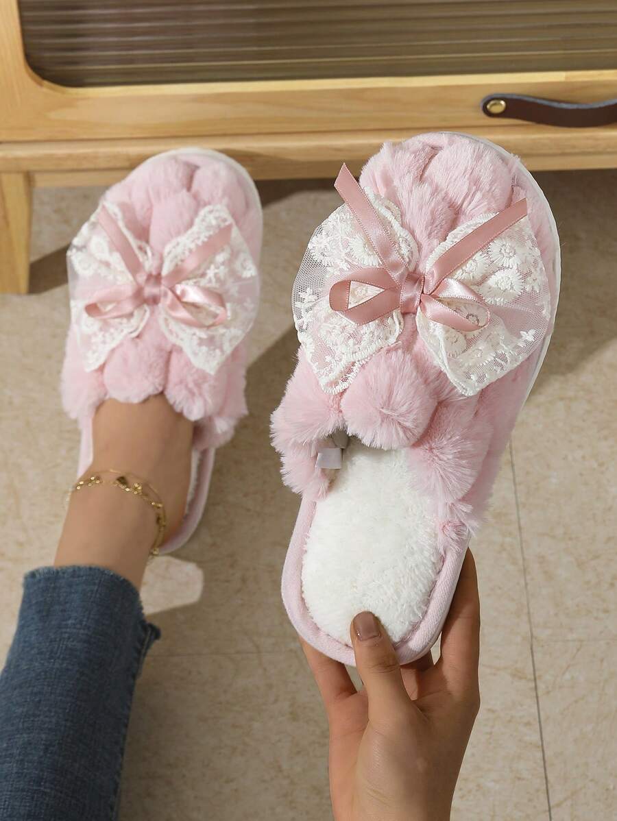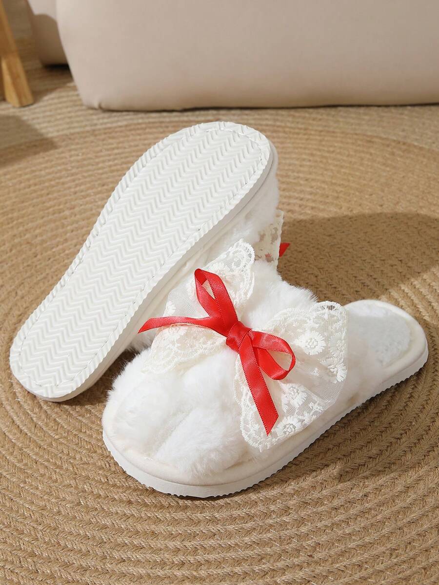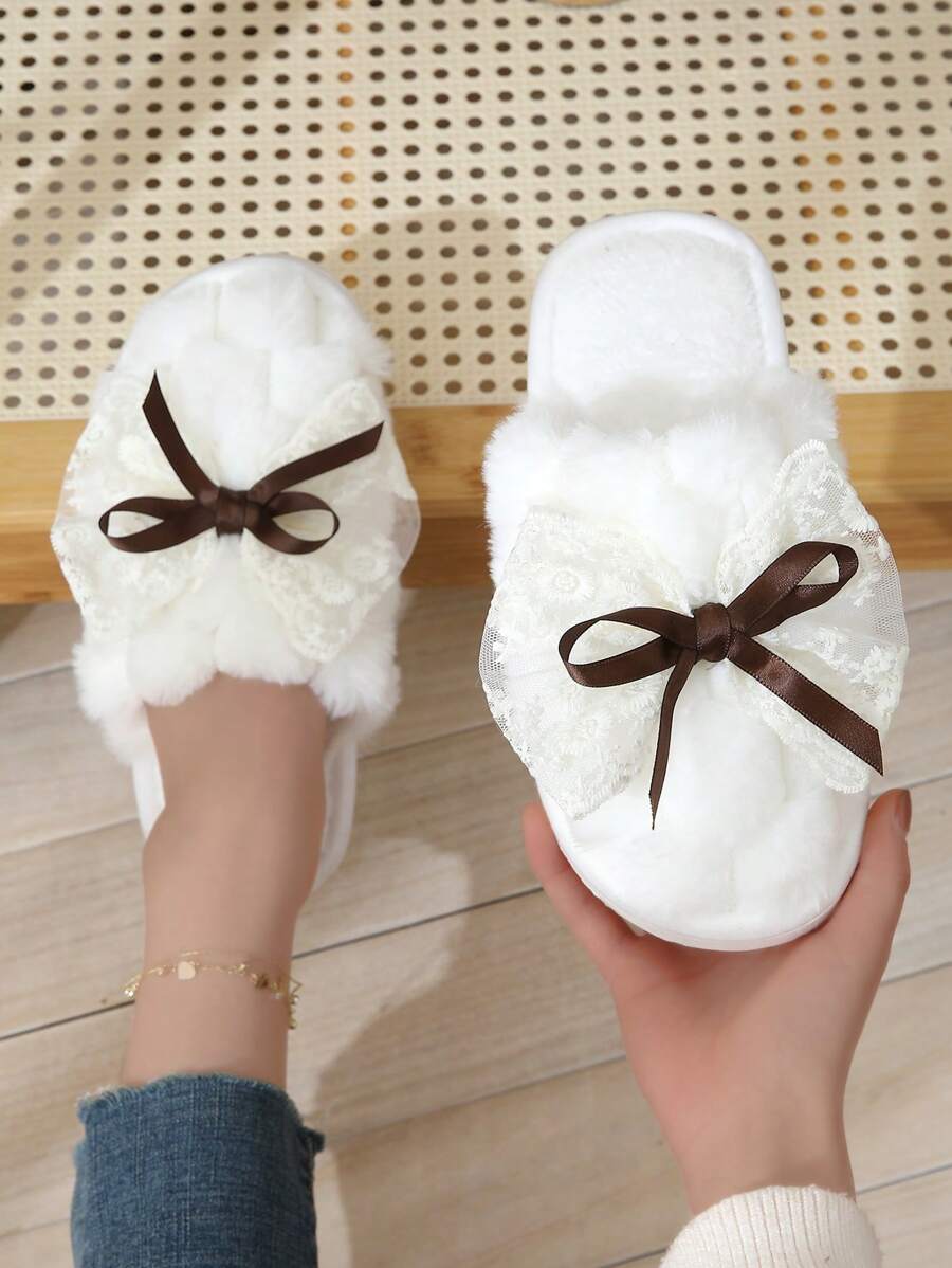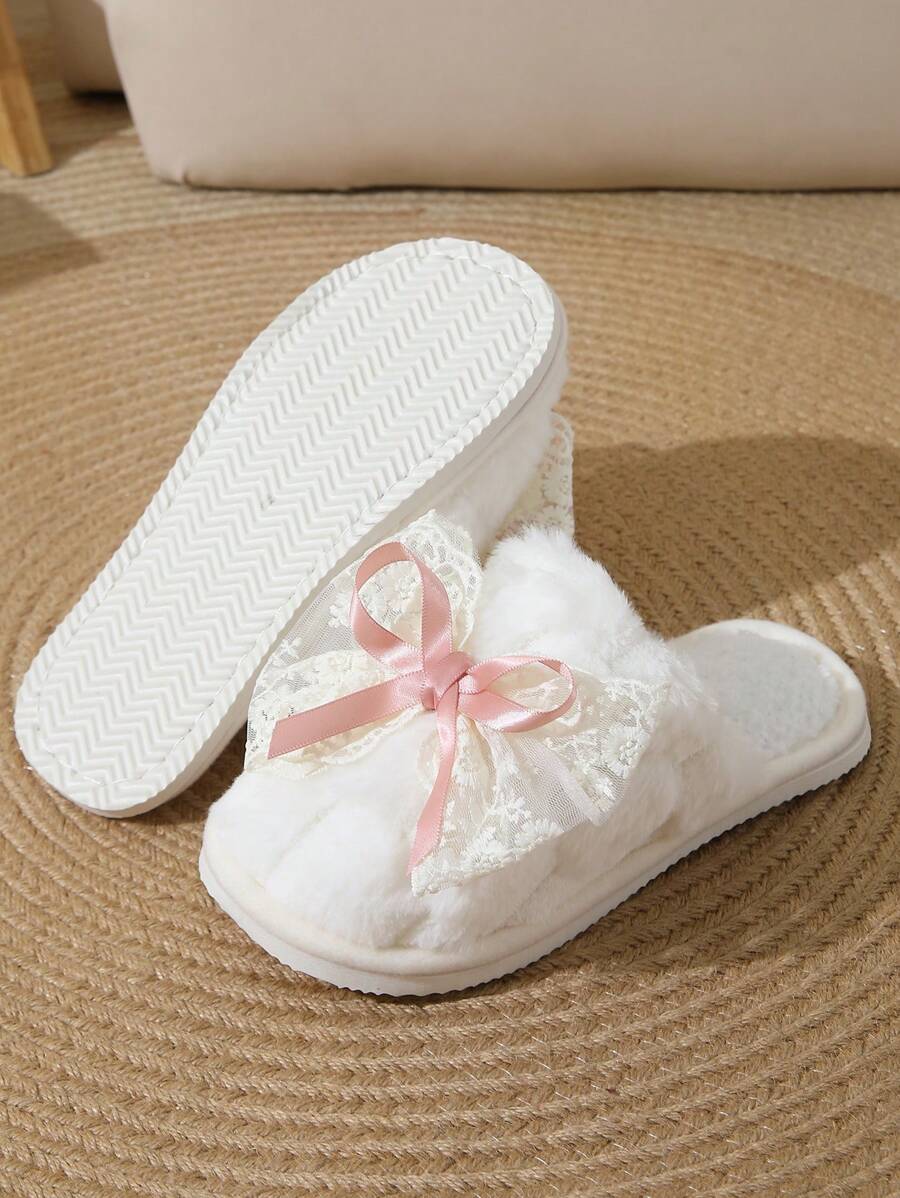 MIU Cute Lace Bow Women Slippers For Indoor House Wear, Lightweight Non-Slip Warm Fuzzy Plush Slides, Suitable For Autumn/Winter