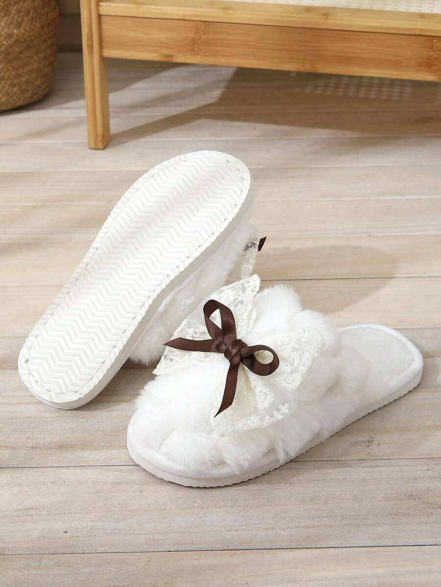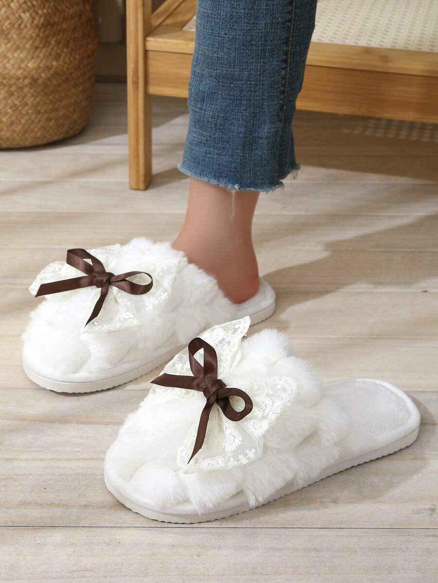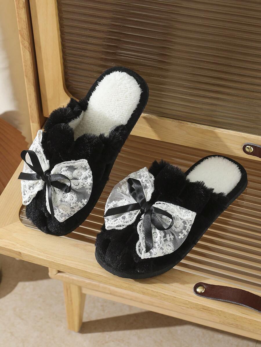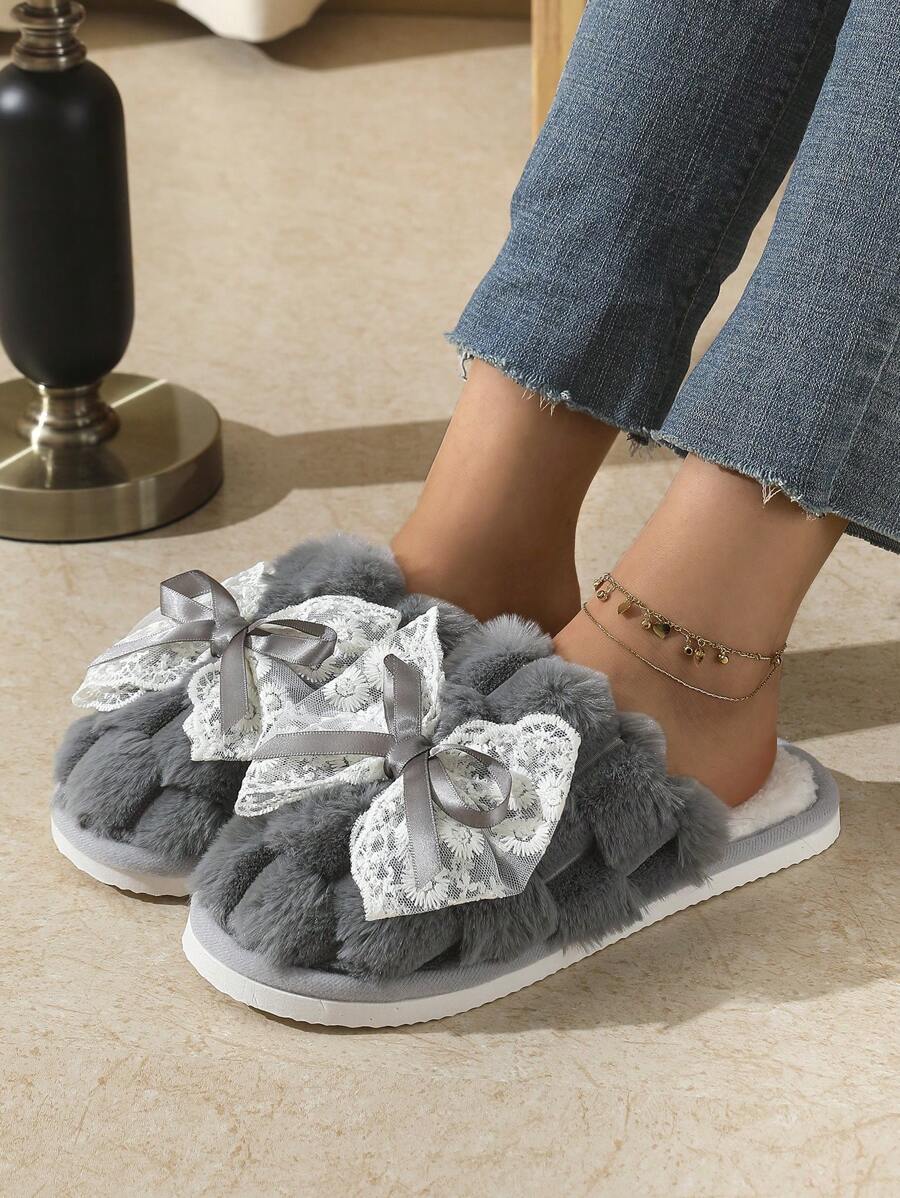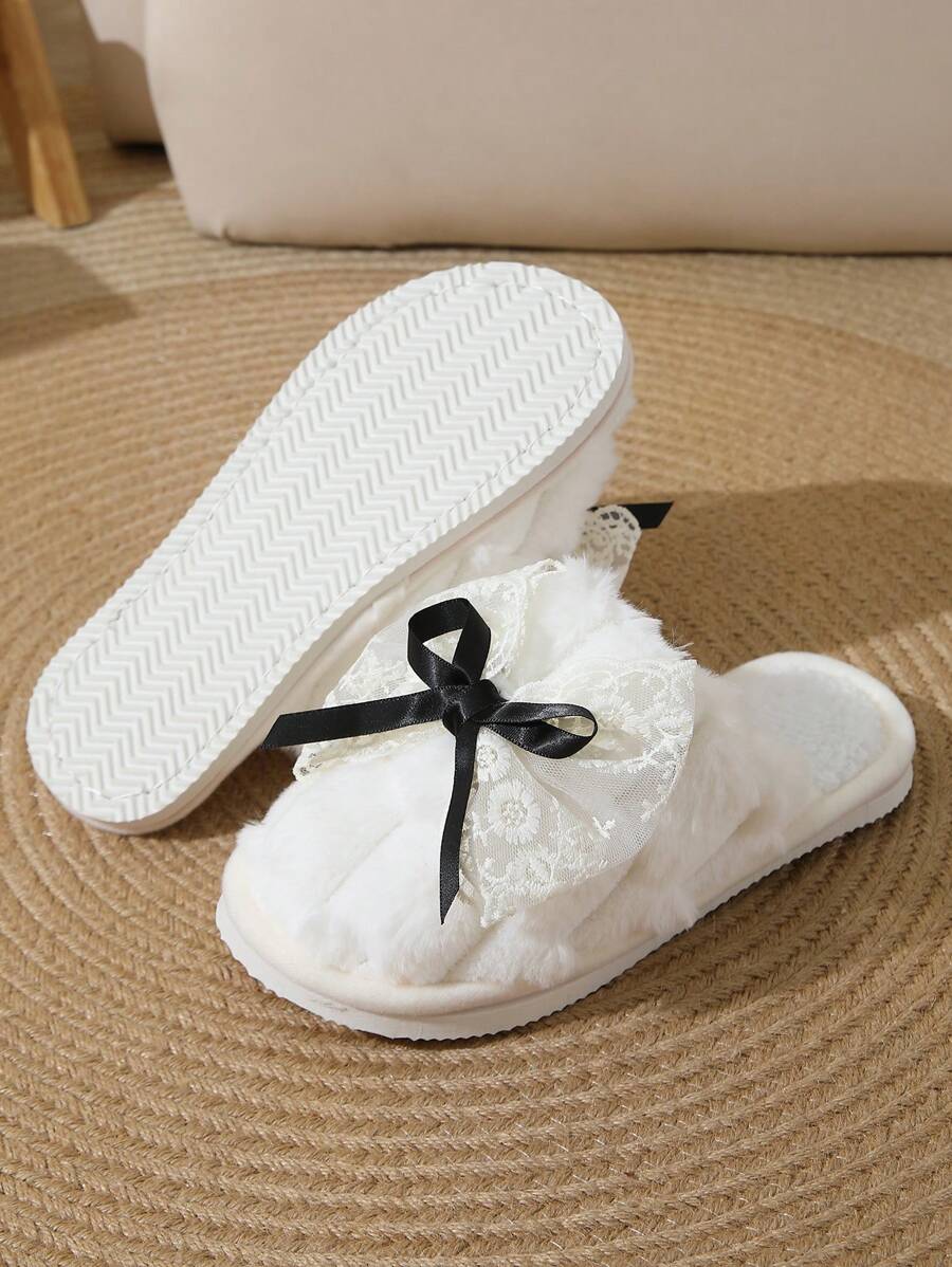 MIU Cute Lace Bow Women Slippers For Indoor House Wear, Lightweight Non-Slip Warm Fuzzy Plush Slides, Suitable For Autumn/Winter