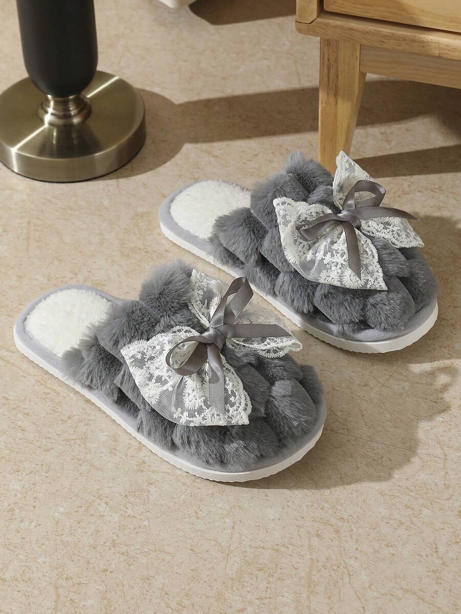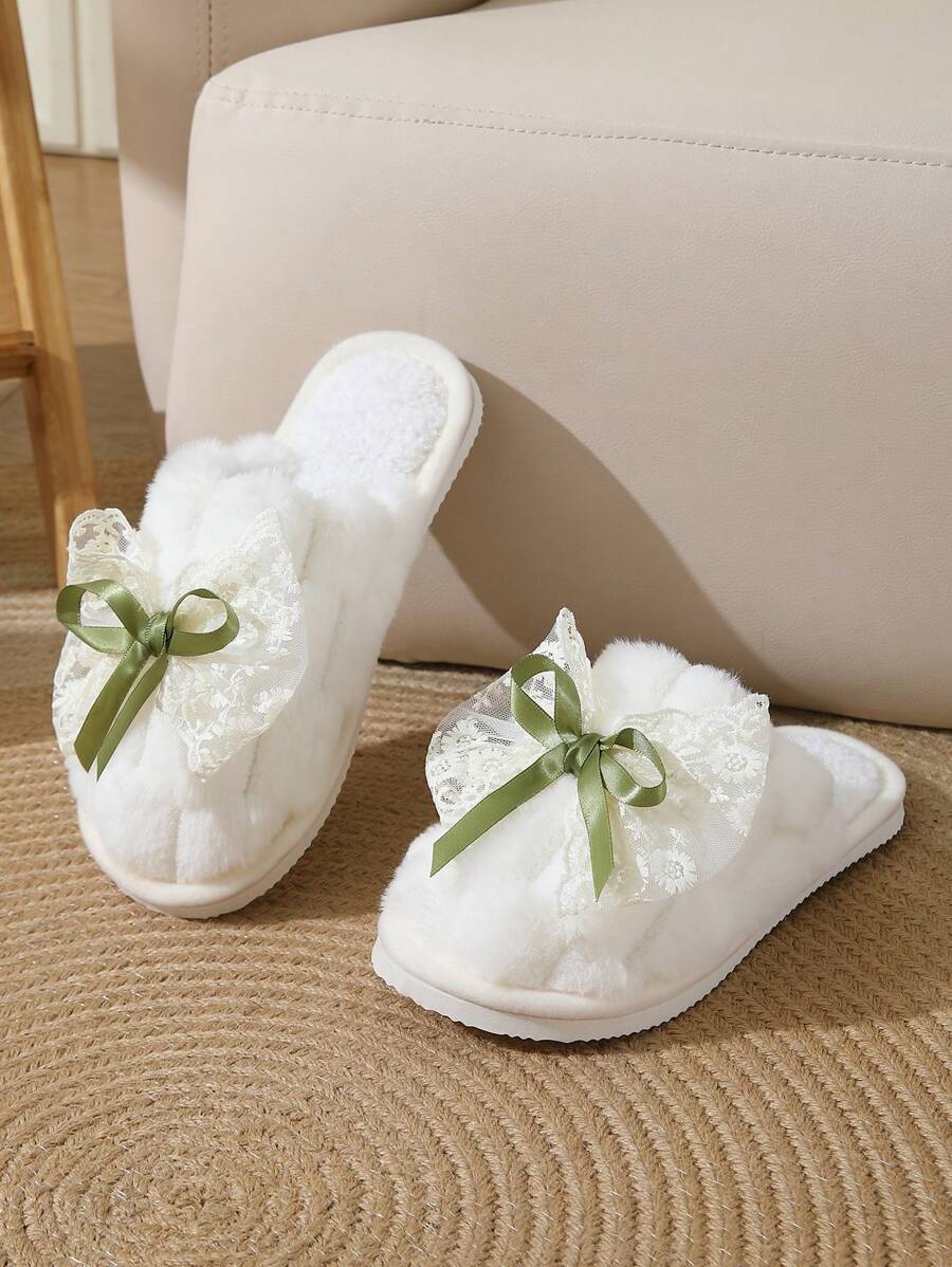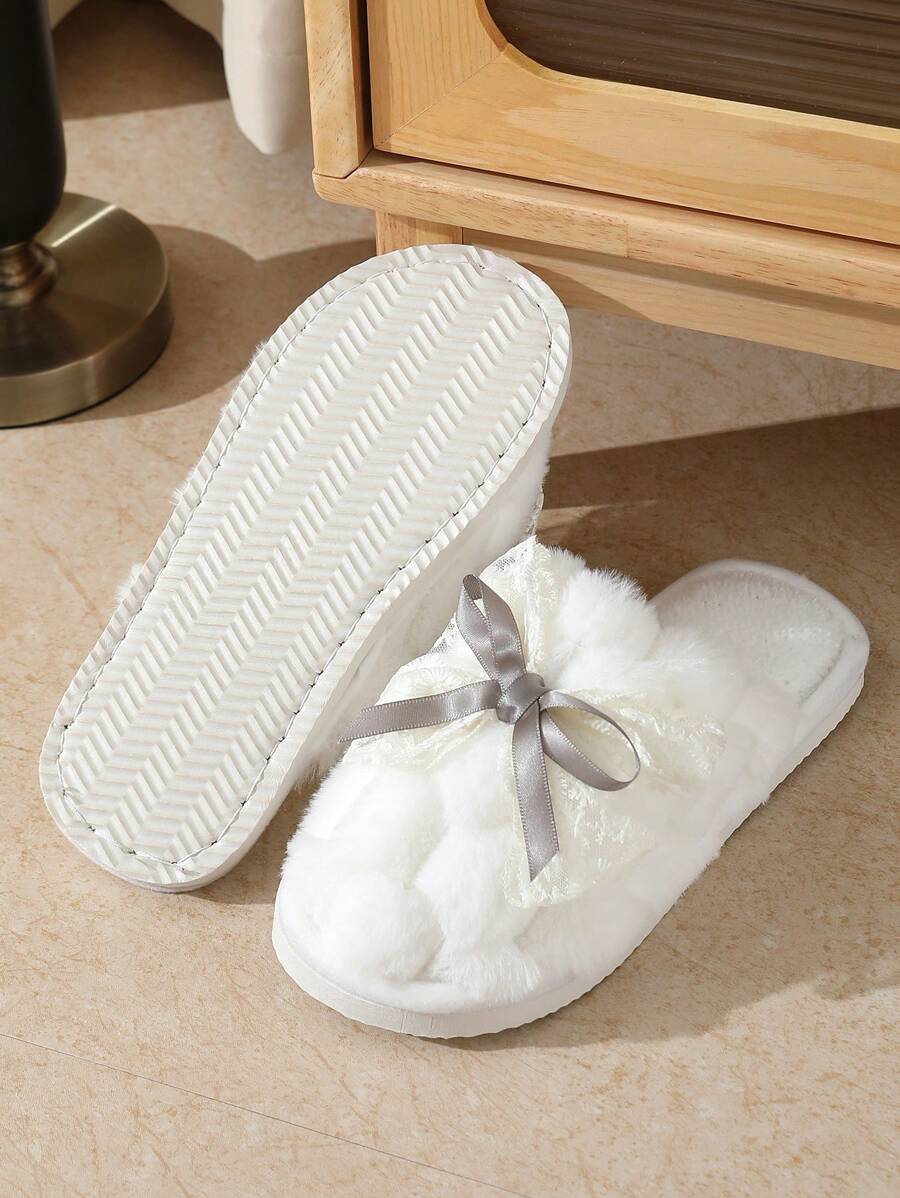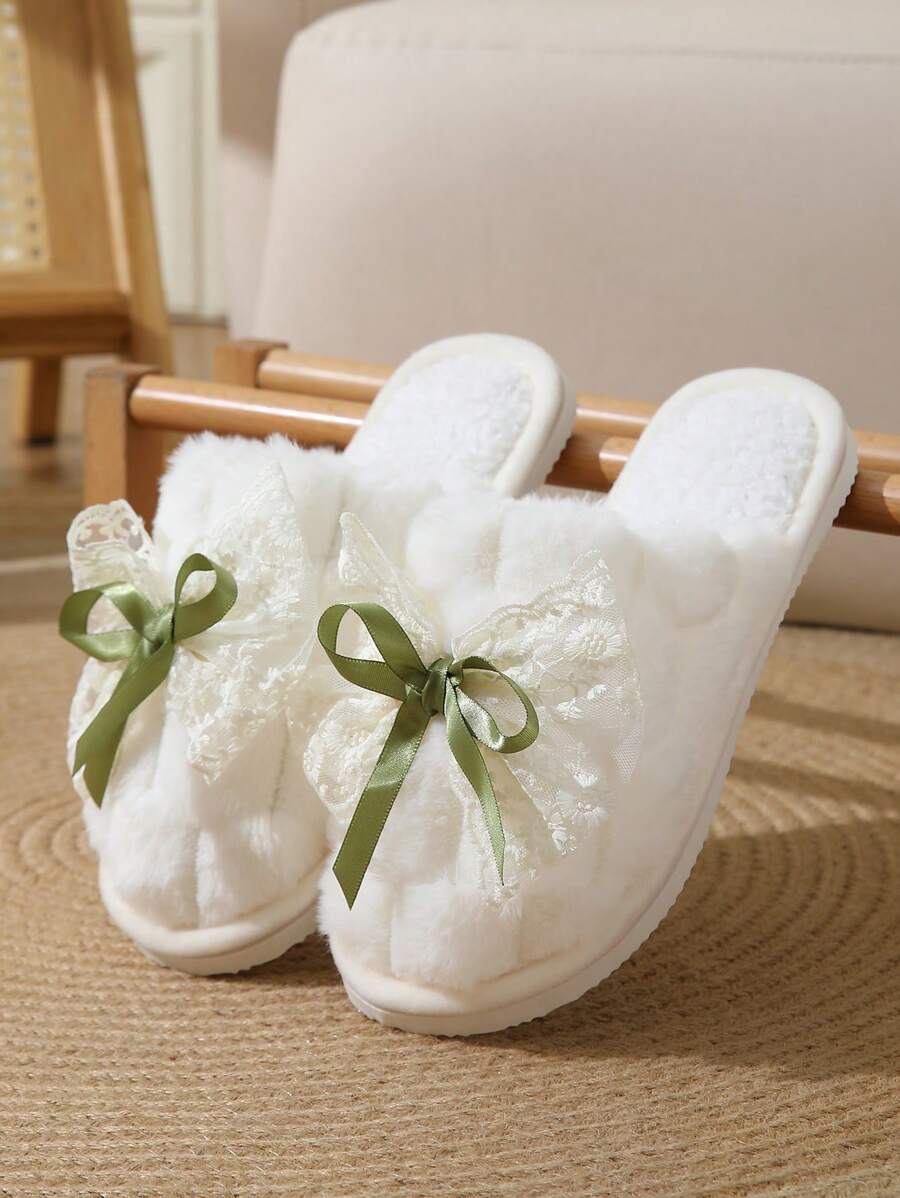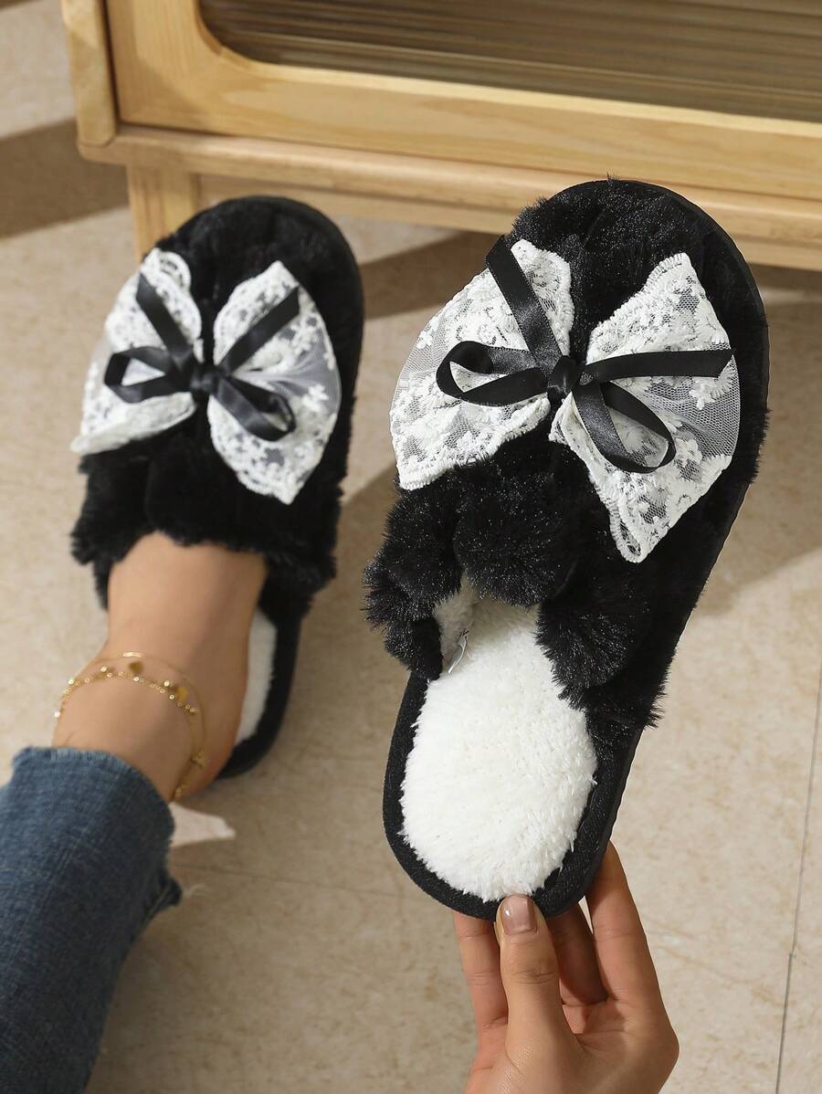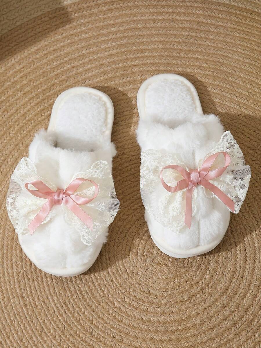 MIU Cute Lace Bow Women Slippers For Indoor House Wear, Lightweight Non-Slip Warm Fuzzy Plush Slides, Suitable For Autumn/Winter