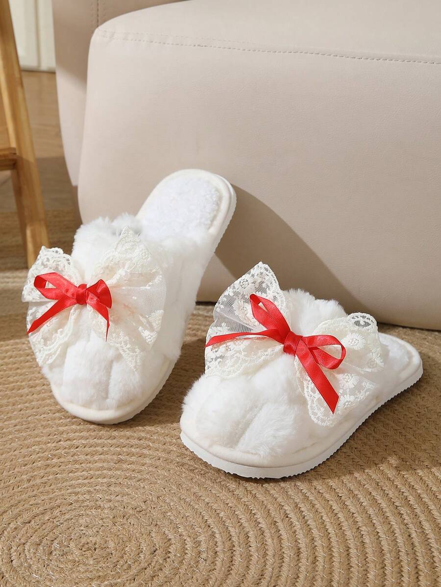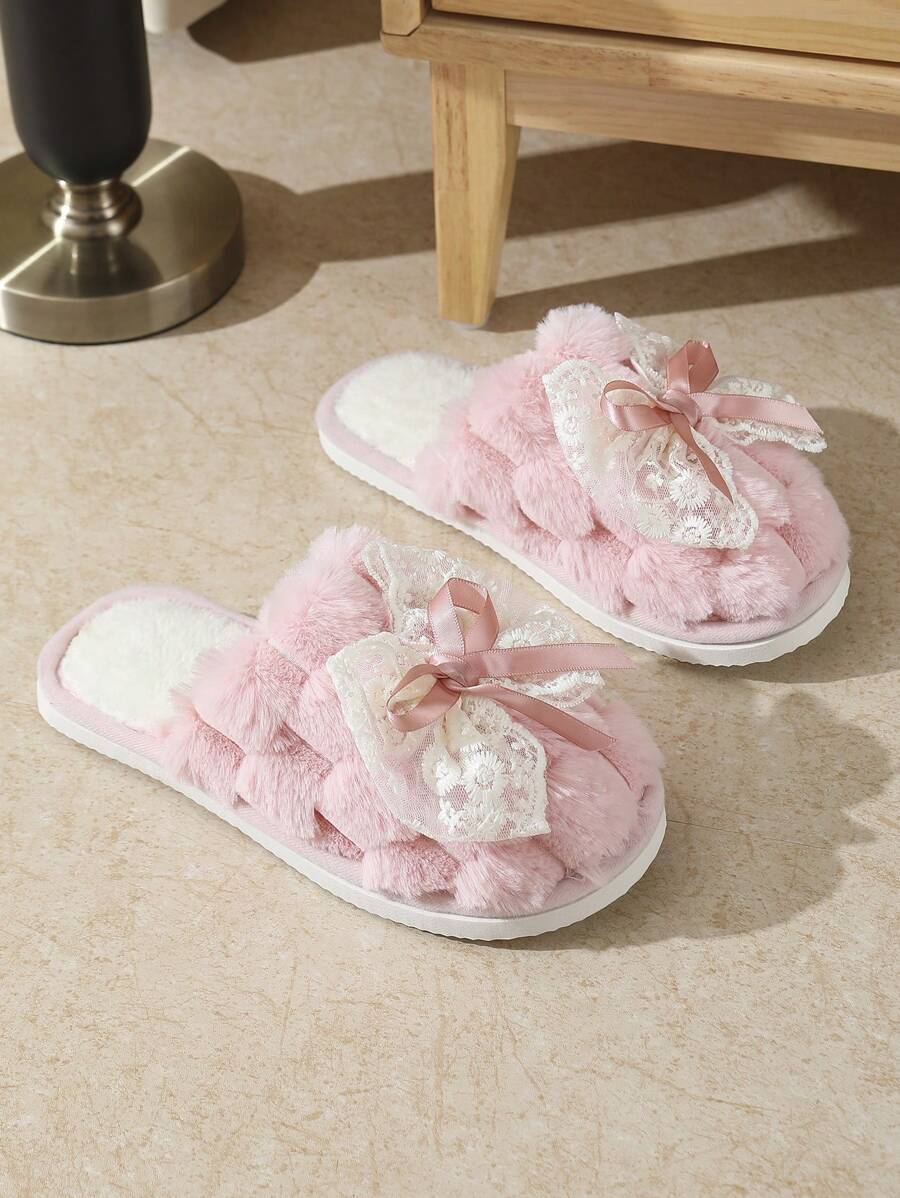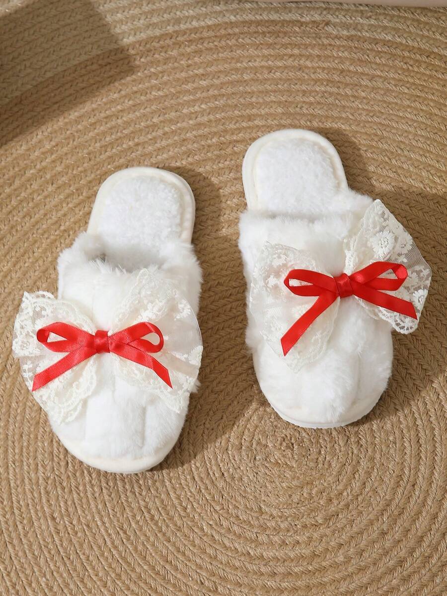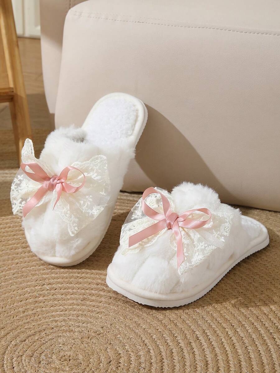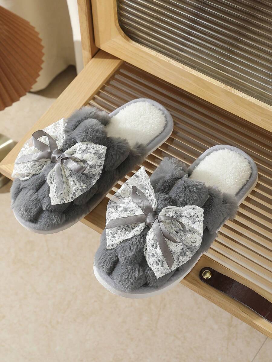 MIU Cute Lace Bow Women Slippers For Indoor House Wear, Lightweight Non-Slip Warm Fuzzy Plush Slides, Suitable For Autumn/Winter
