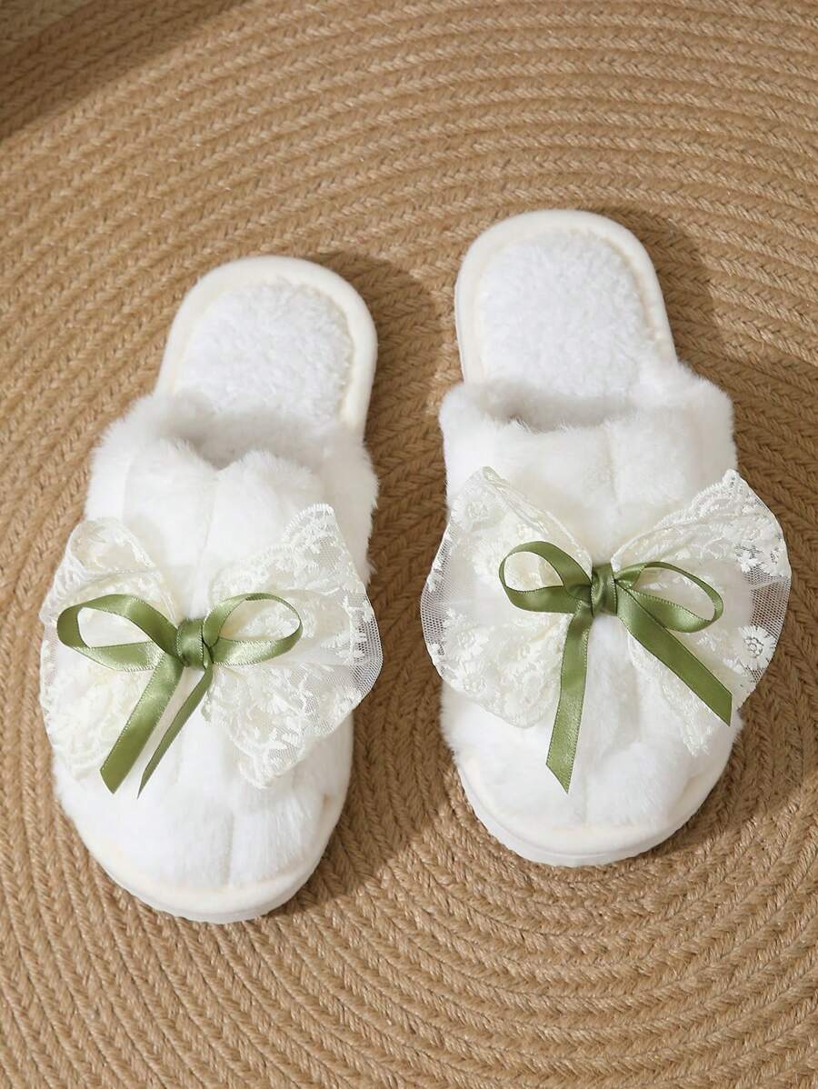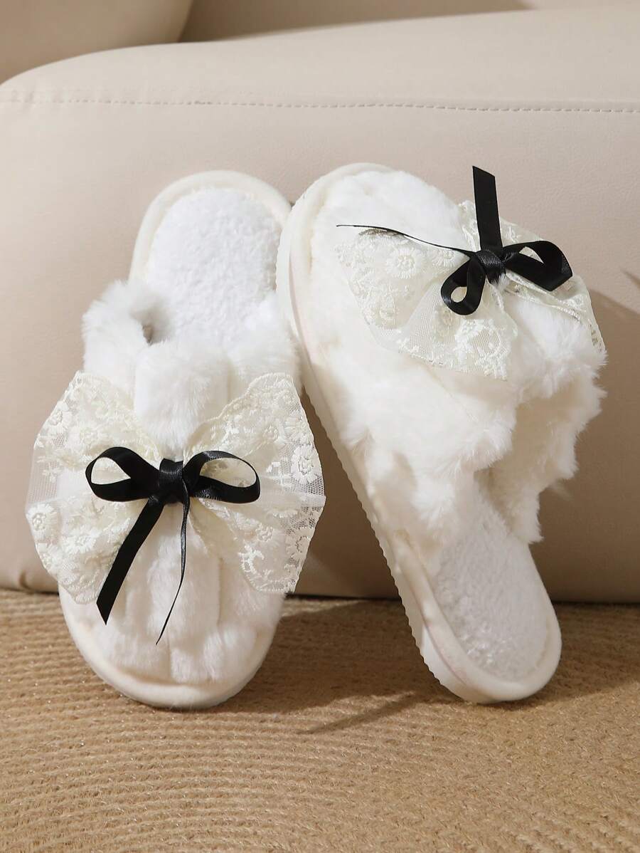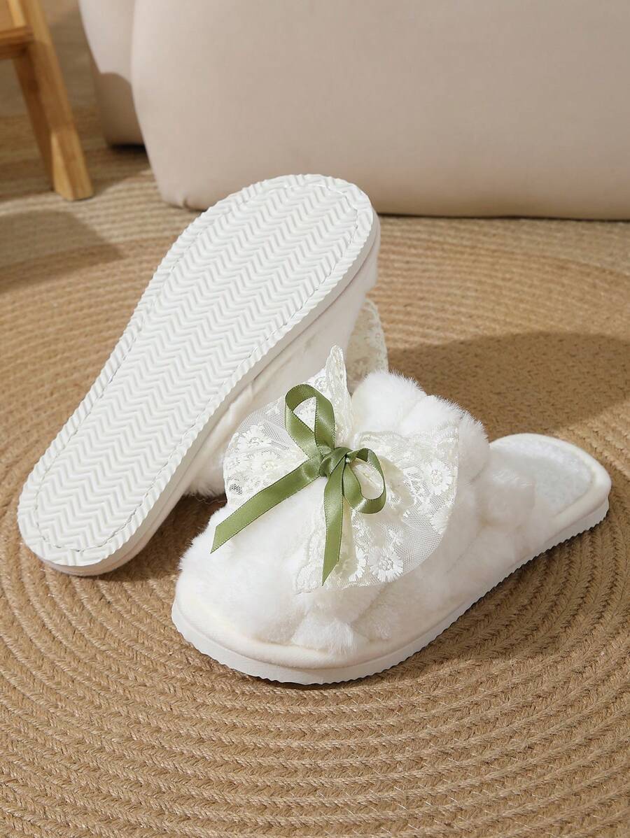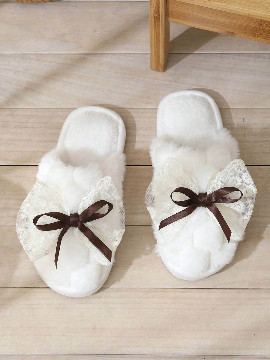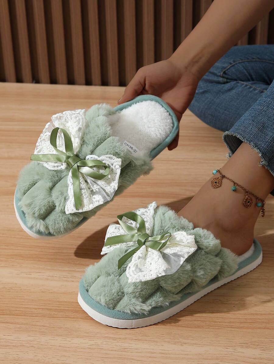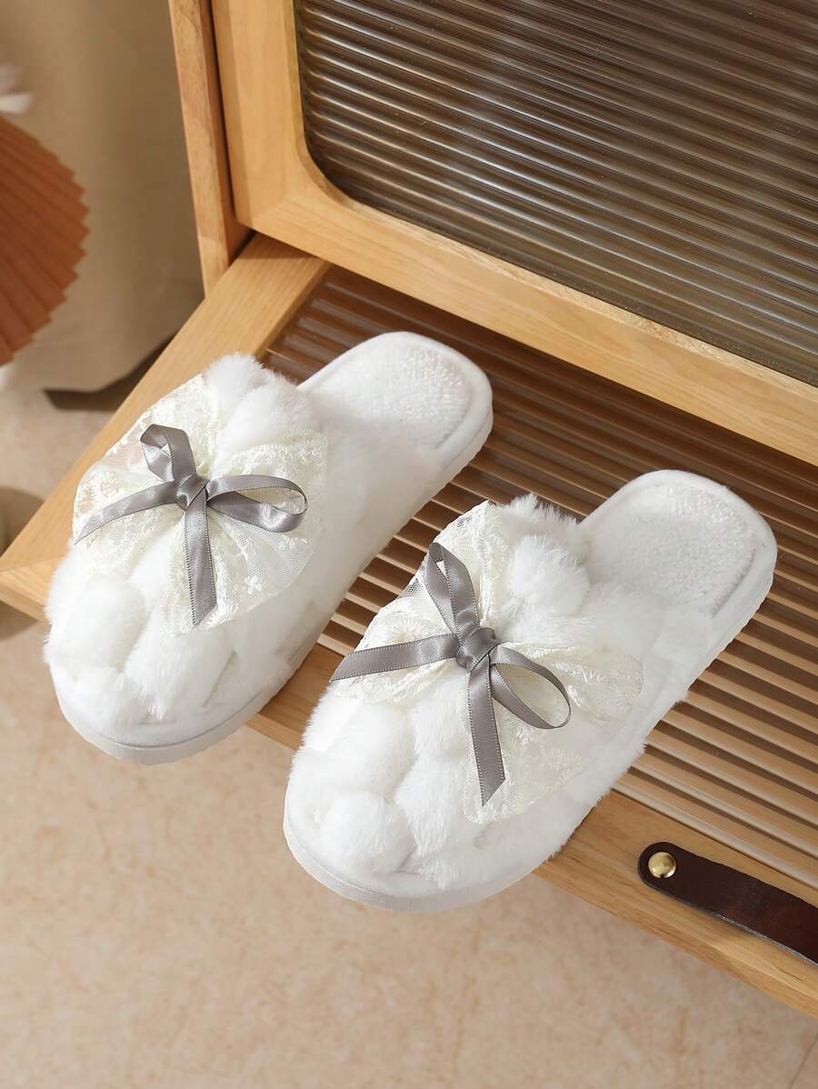 MIU Cute Lace Bow Women Slippers For Indoor House Wear, Lightweight Non-Slip Warm Fuzzy Plush Slides, Suitable For Autumn/Winter
