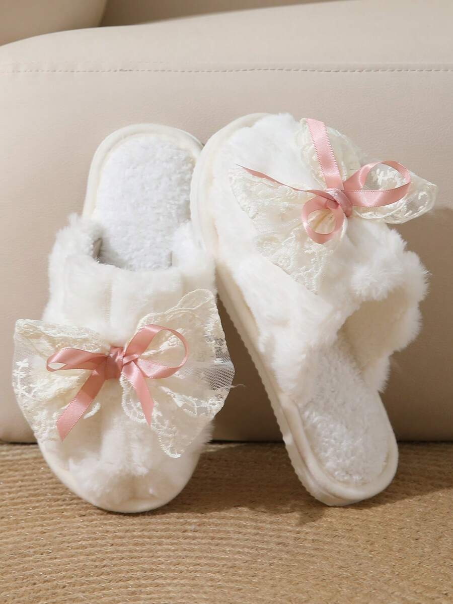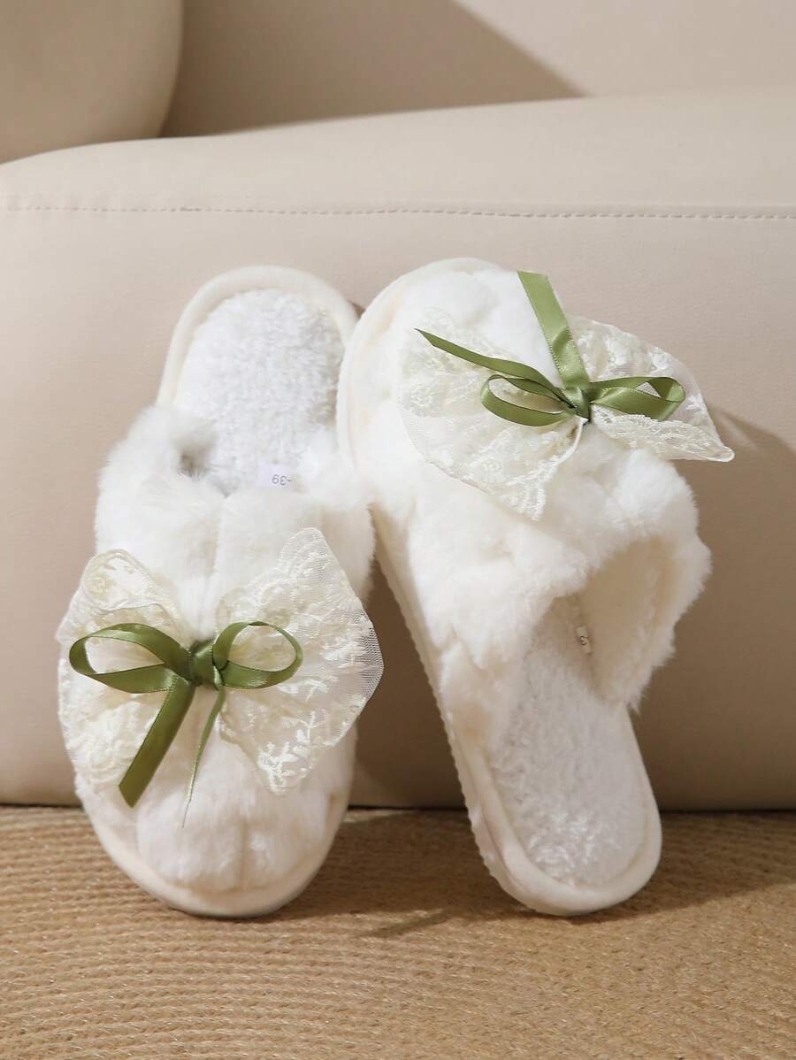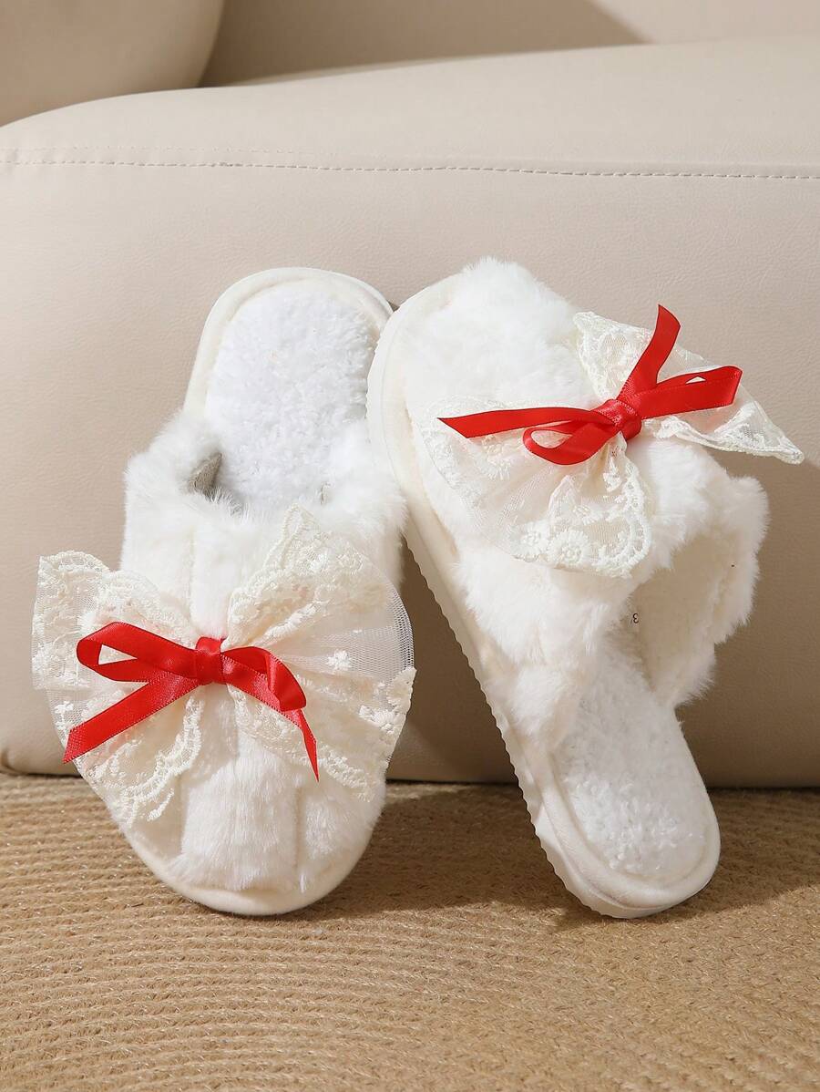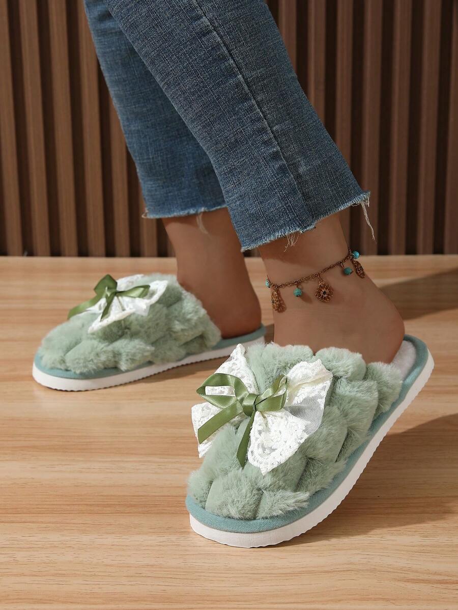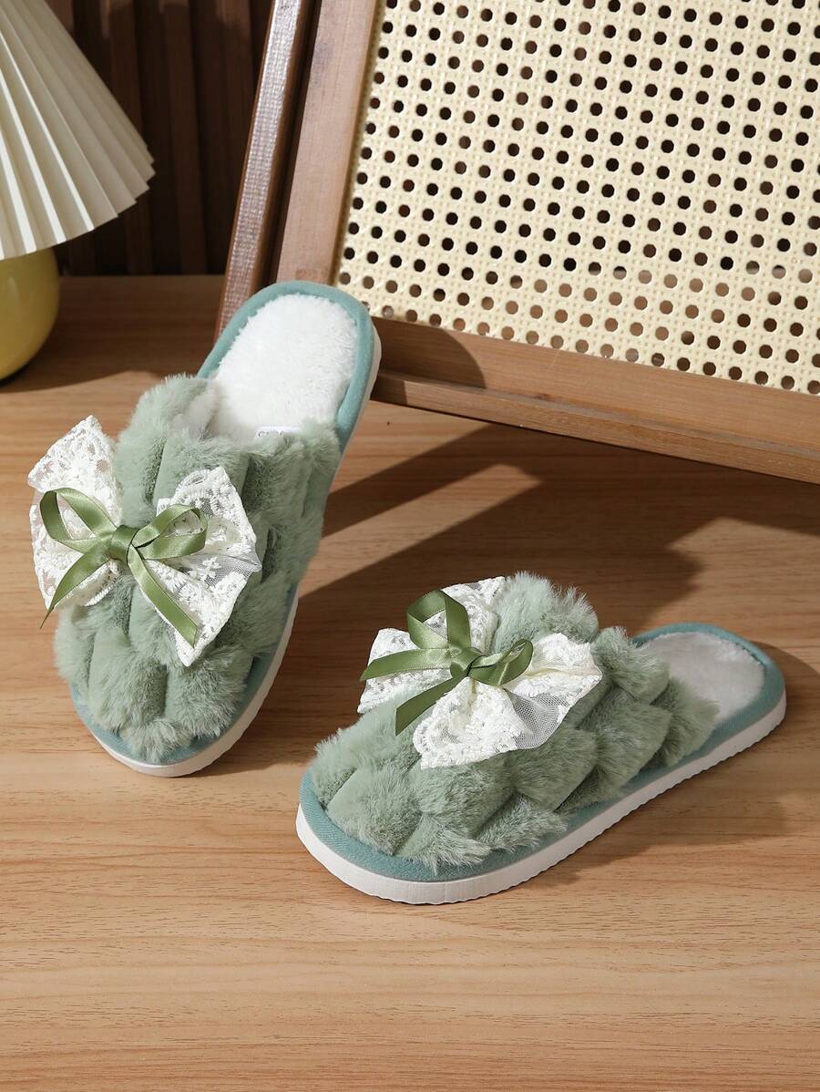 MIU Cute Lace Bow Women Slippers For Indoor House Wear, Lightweight Non-Slip Warm Fuzzy Plush Slides, Suitable For Autumn/Winter