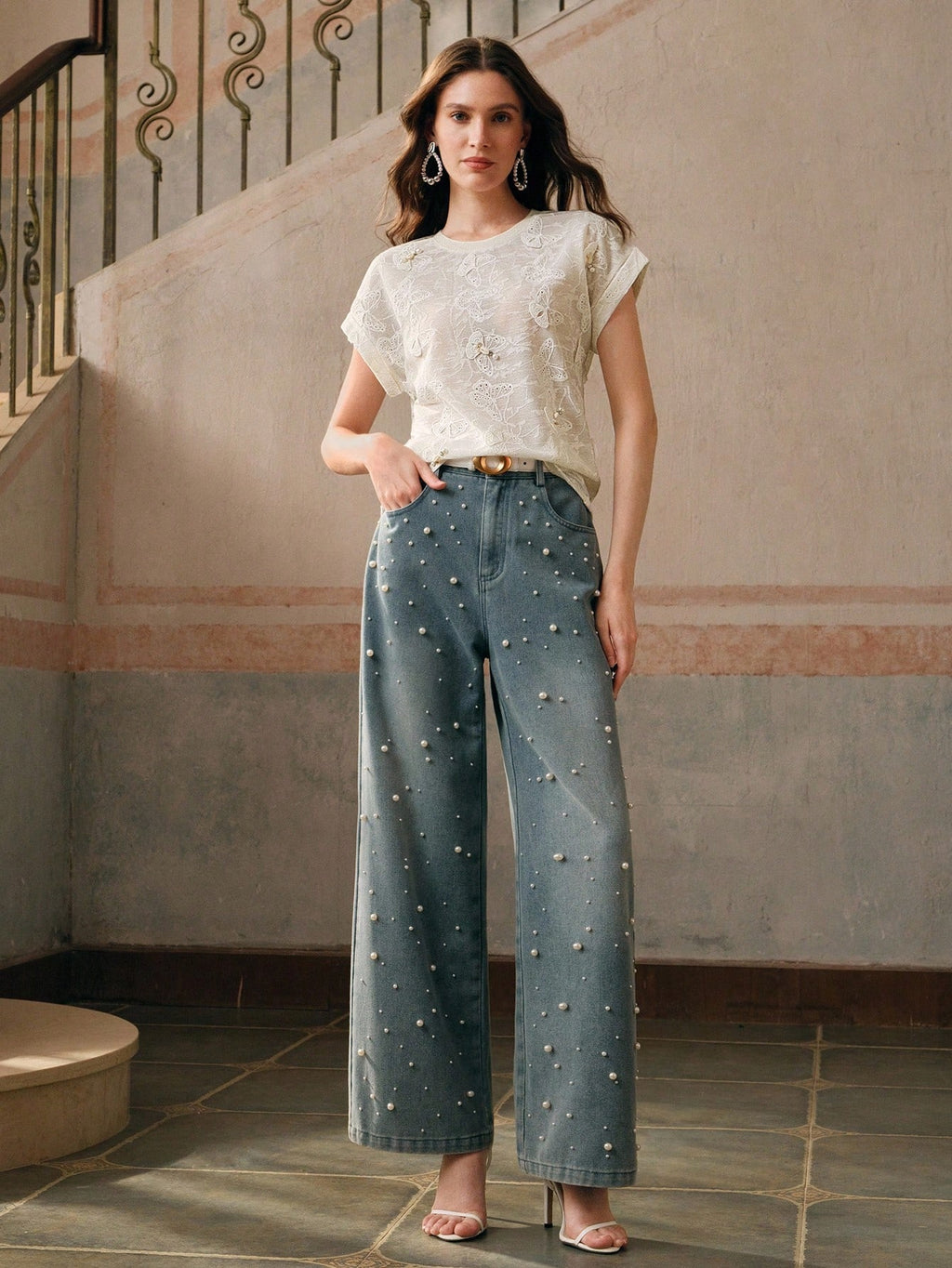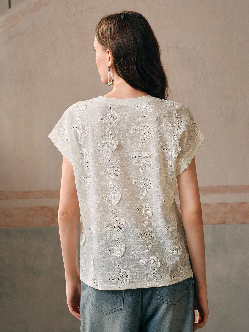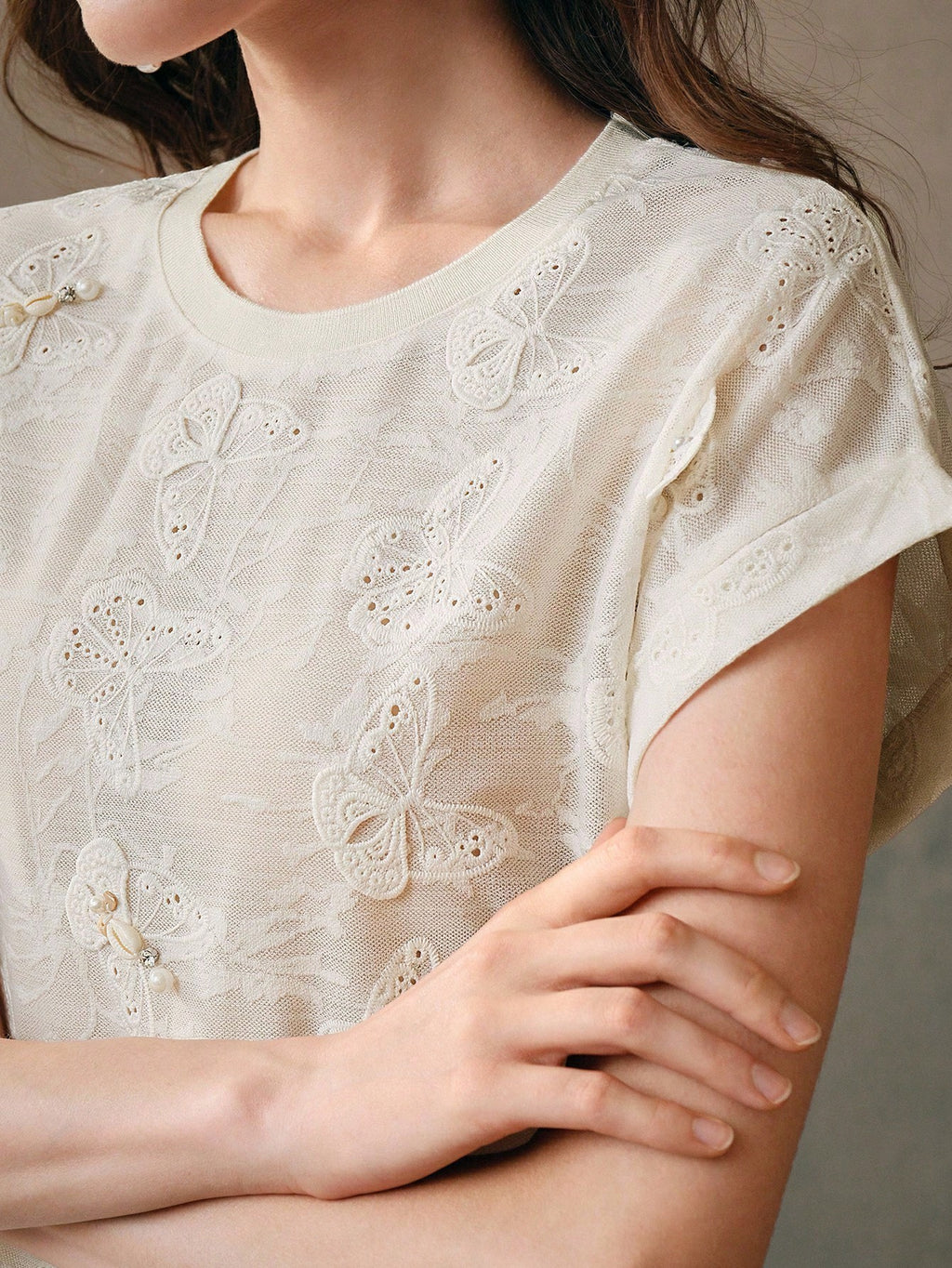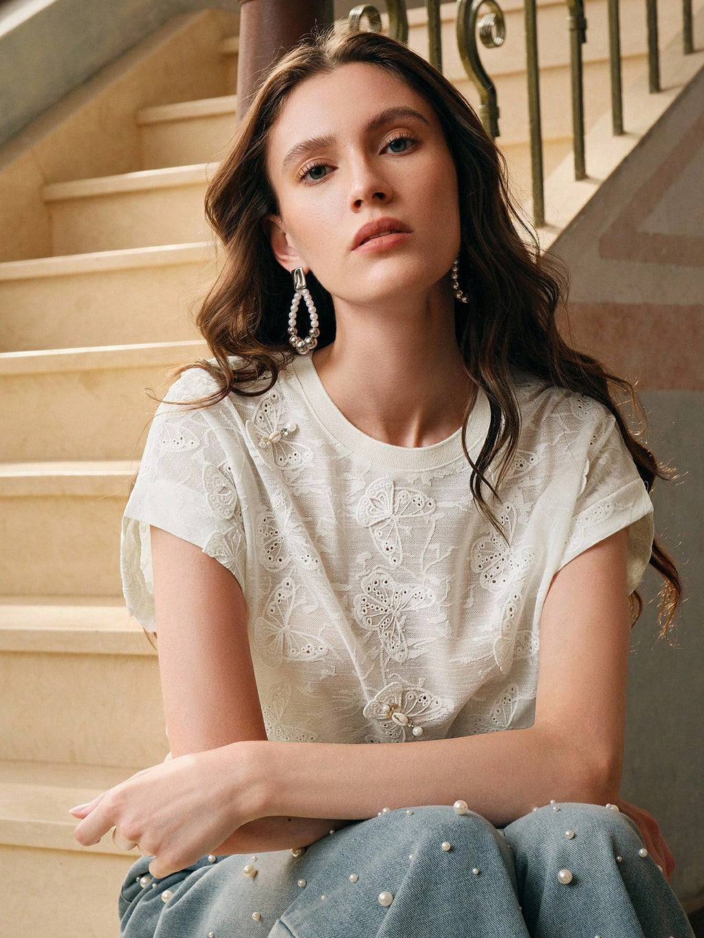 MIU Elaire Elegant Butterfly Embroidered Round Neck Short Sleeve T-Shirt, Summer