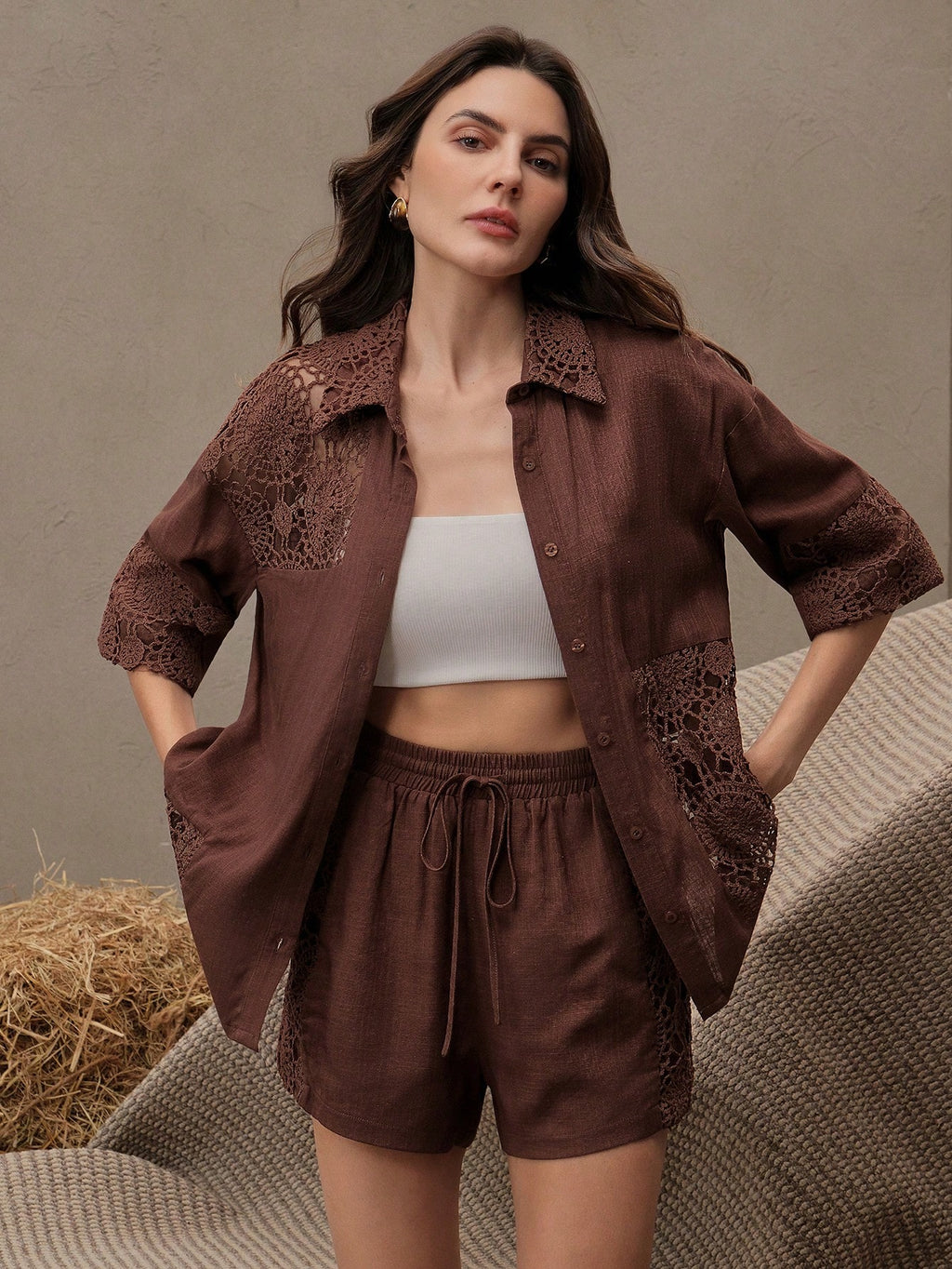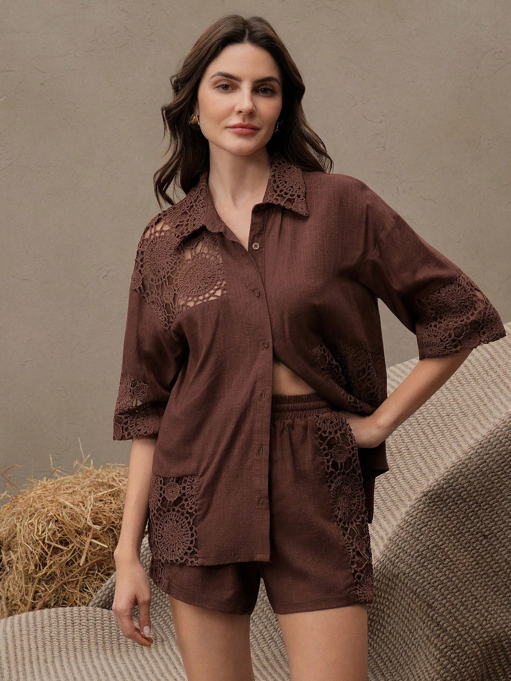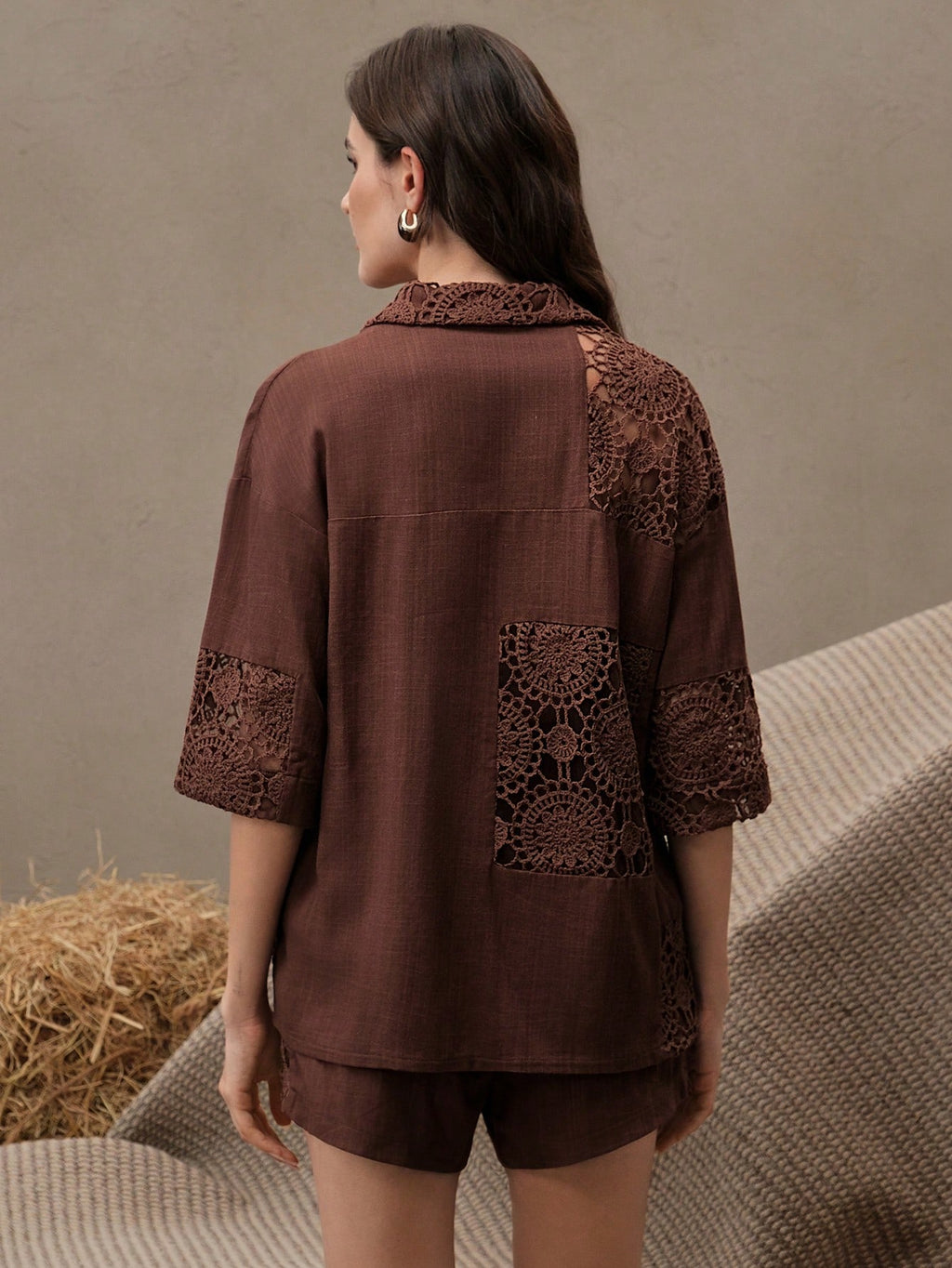 MIU Elegant Casual Resort Lace Patchwork Collar Shirt