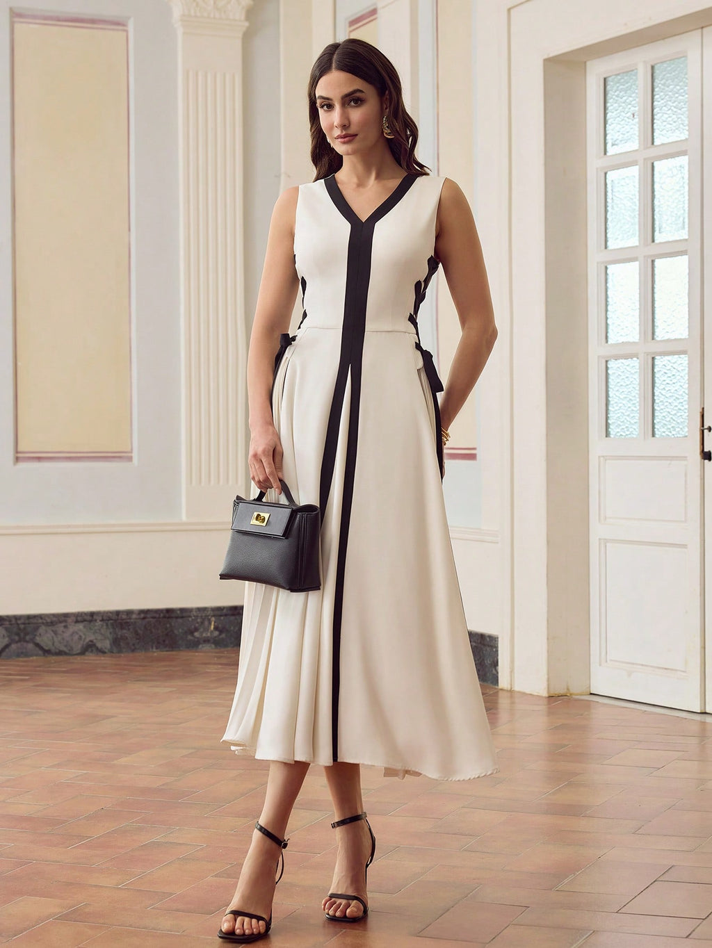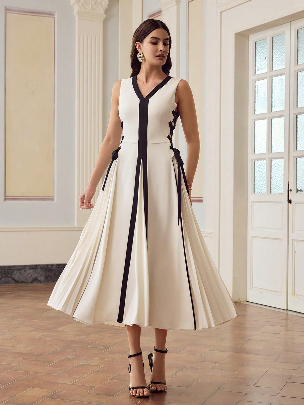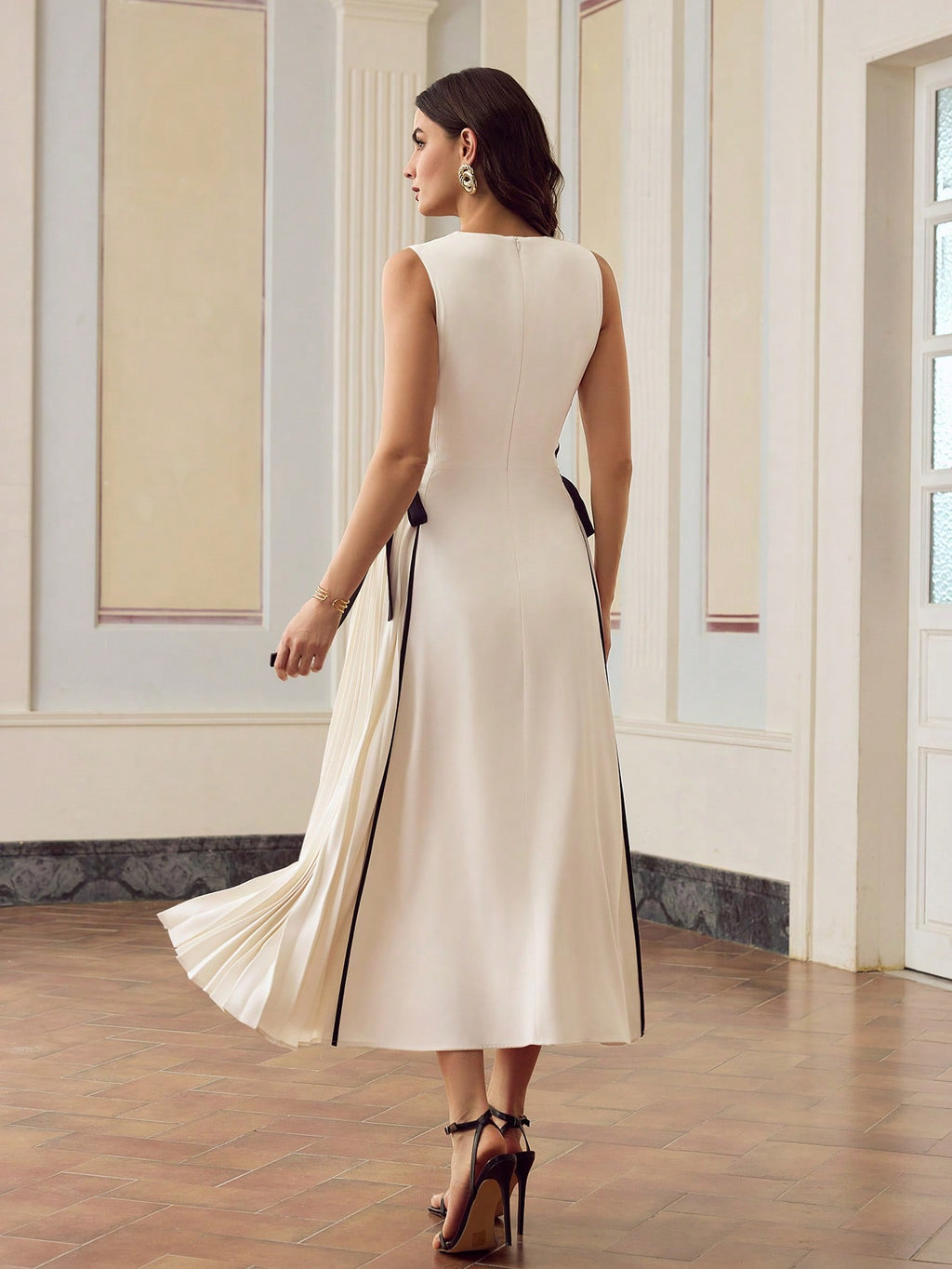 MIU Elegant Contrast Color Pleated Dress, Summer