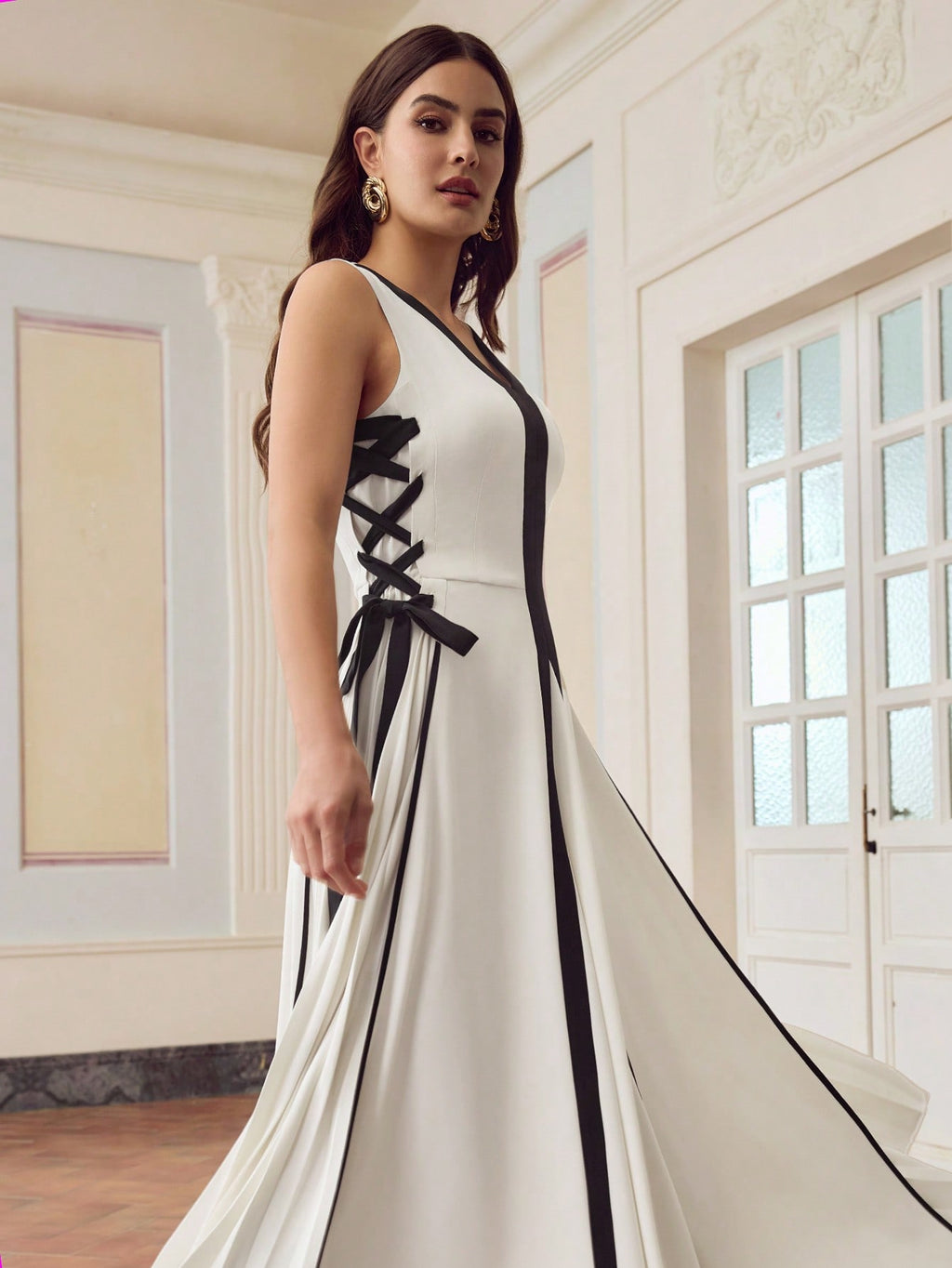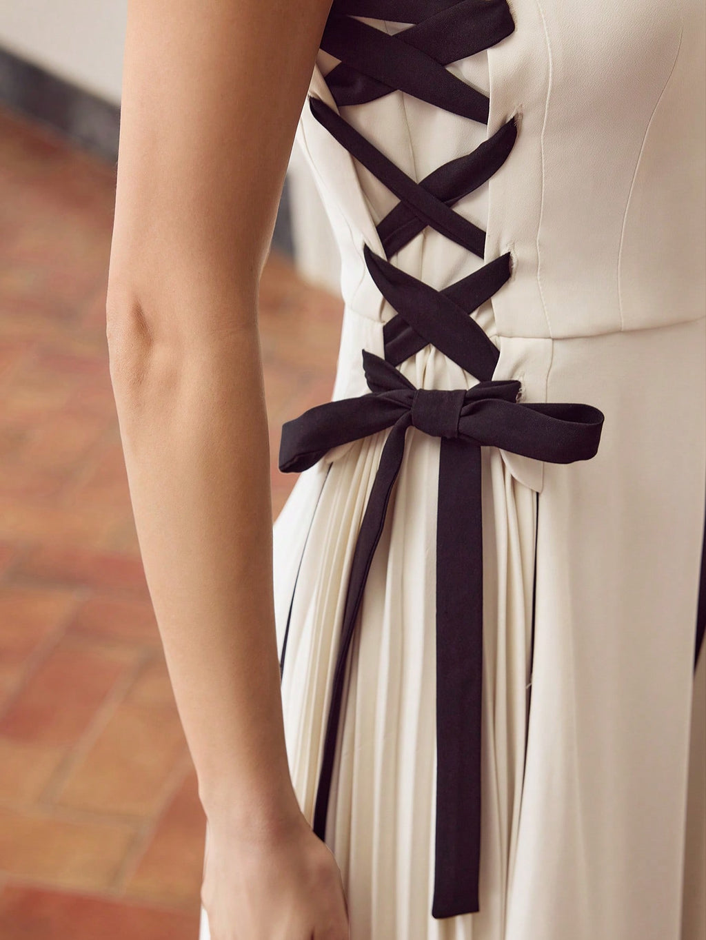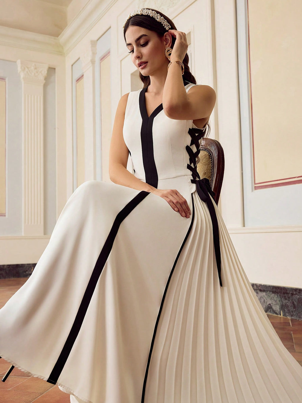 MIU Elegant Contrast Color Pleated Dress, Summer