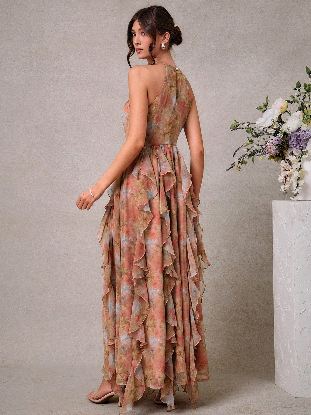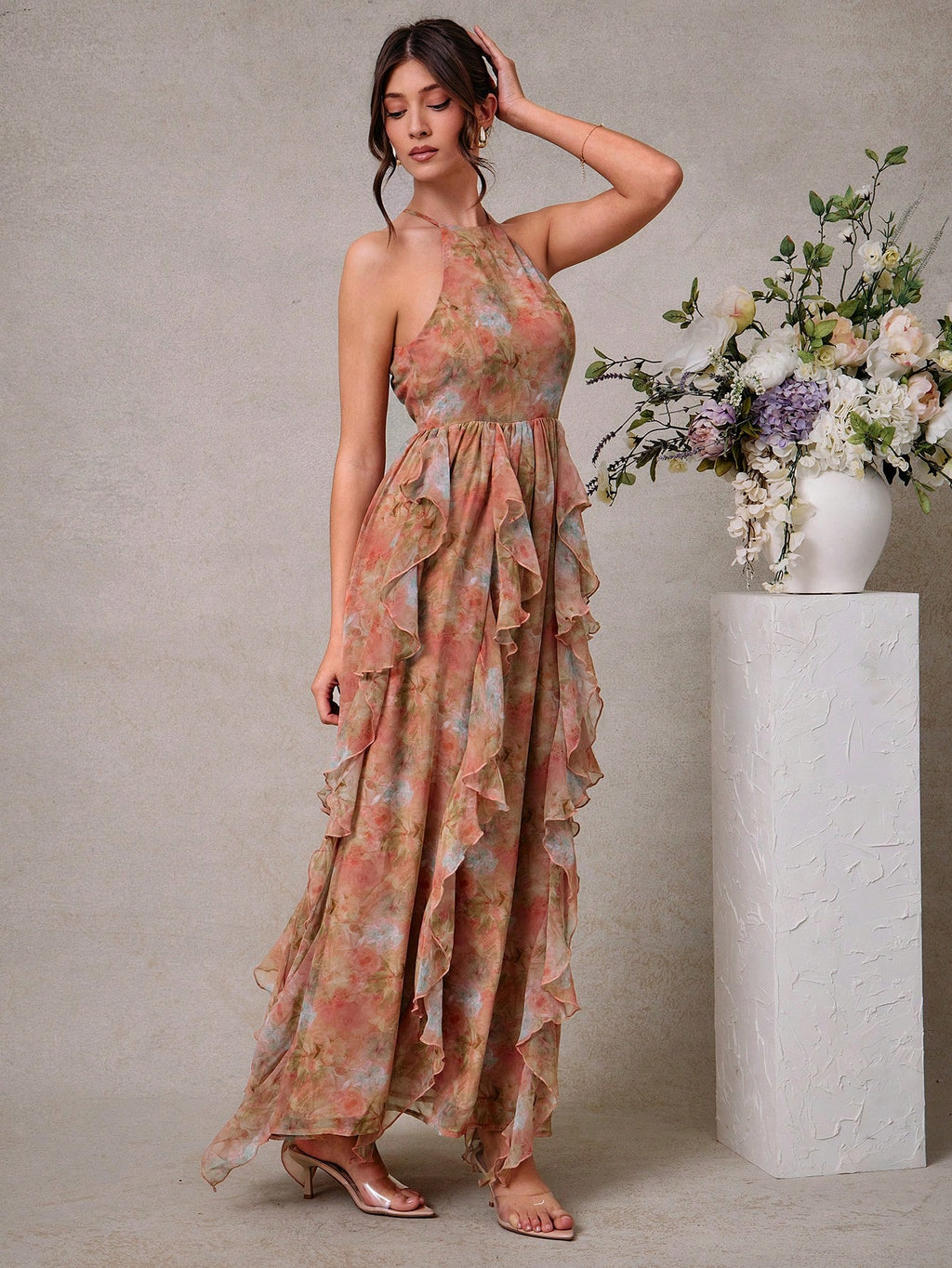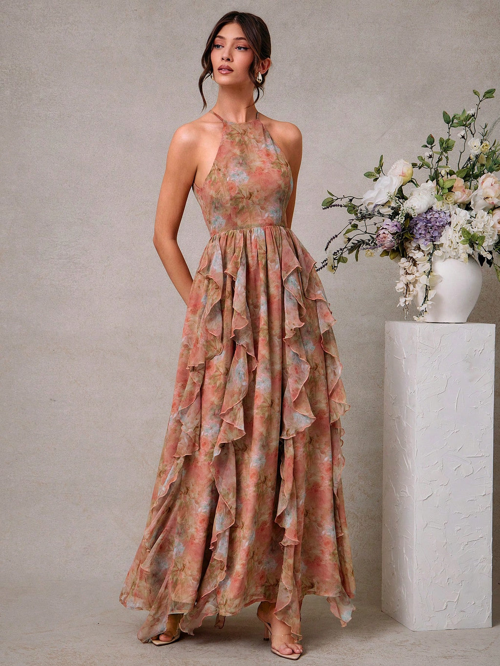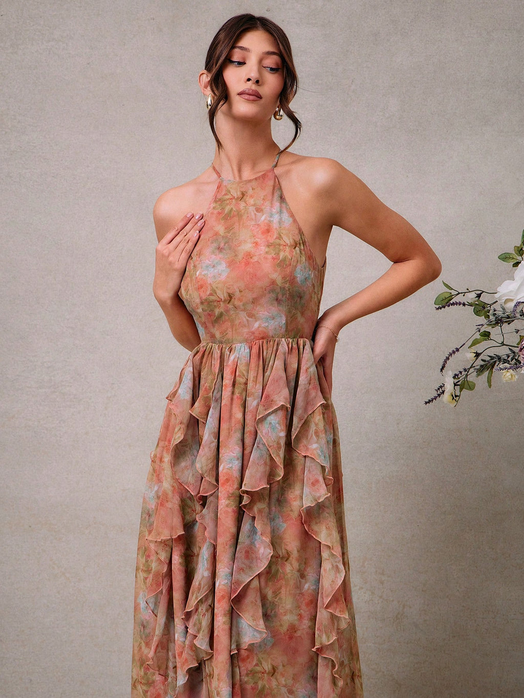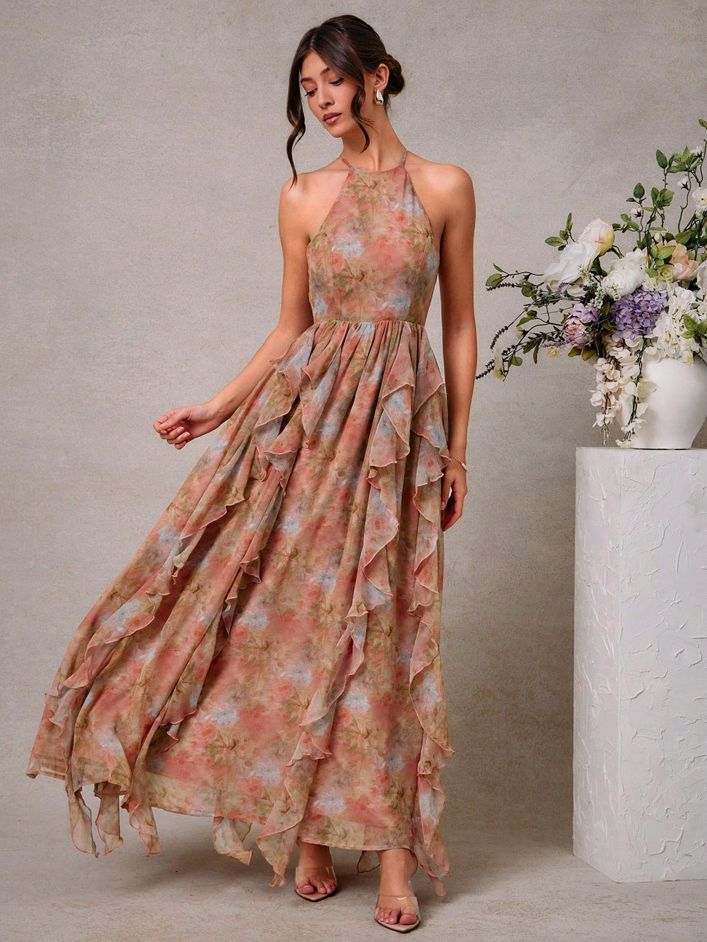 MIU Elegant Floral Chiffon Halter Neck Maxi Dress With Ruffle Details, Wedding Guest Dresses For Women, Summer Outfits For Women
