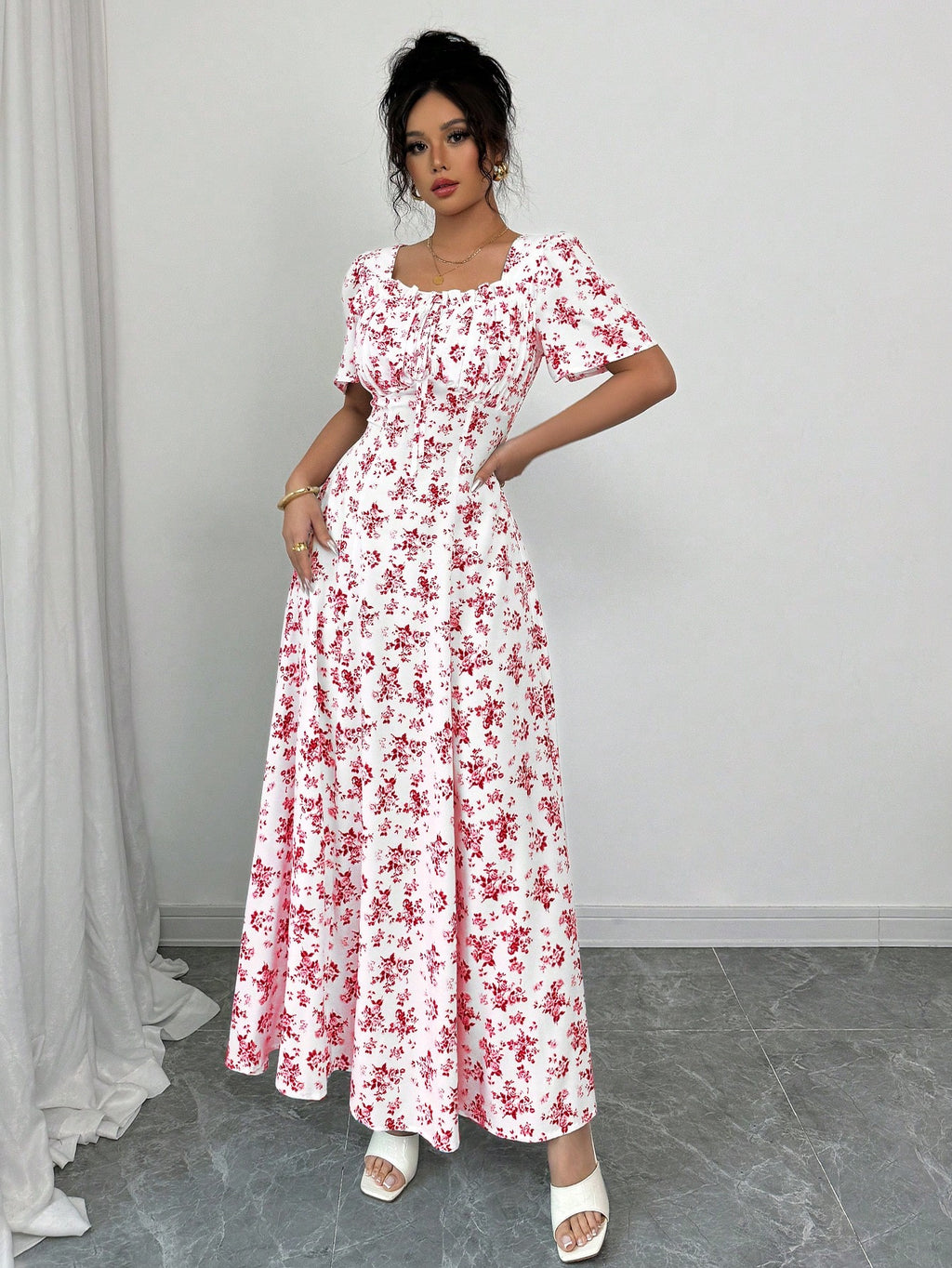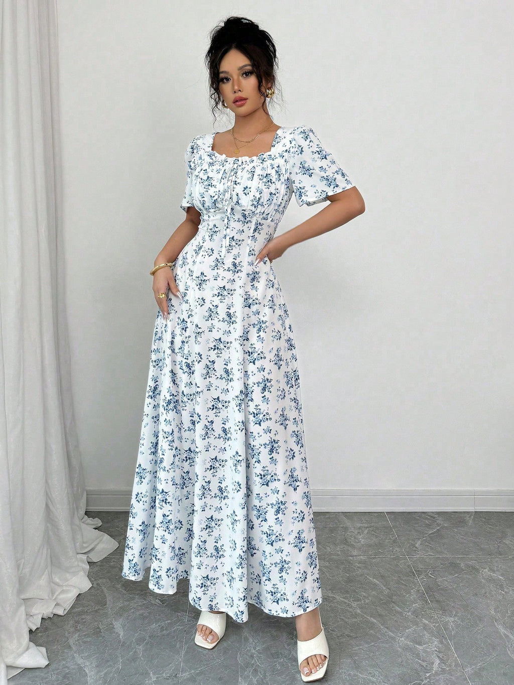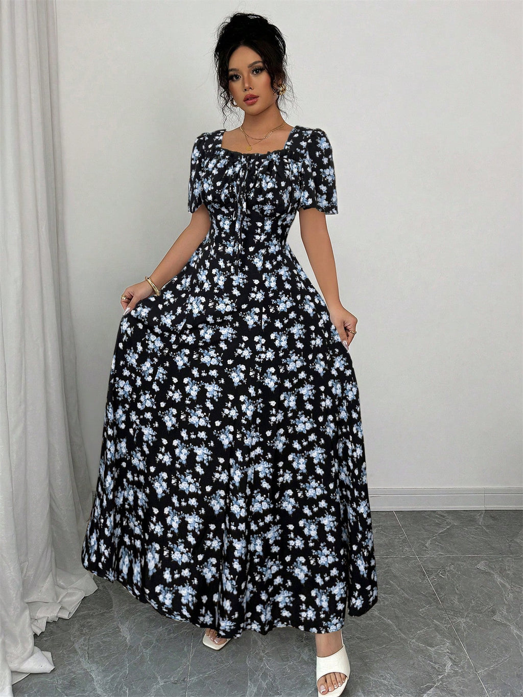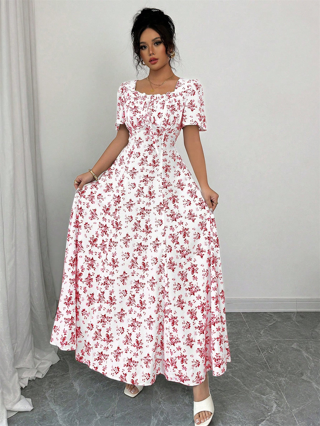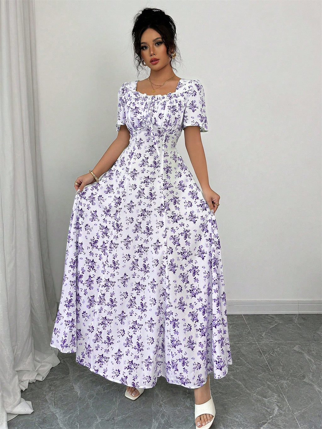 MIU Elegant Resort Casual Puff Sleeve Square Collar Gathered Cinched Waist Dress, Spring/Summer
