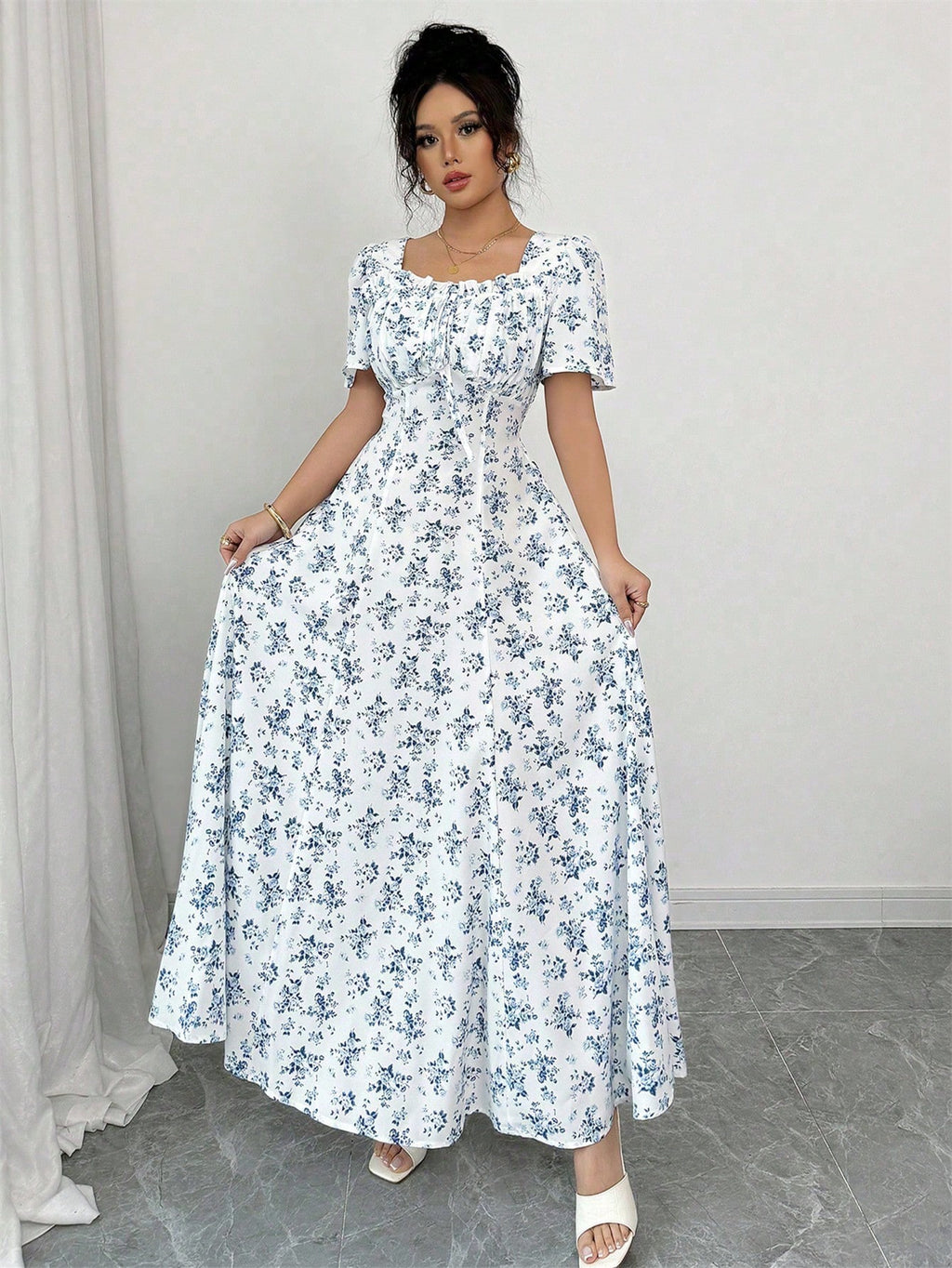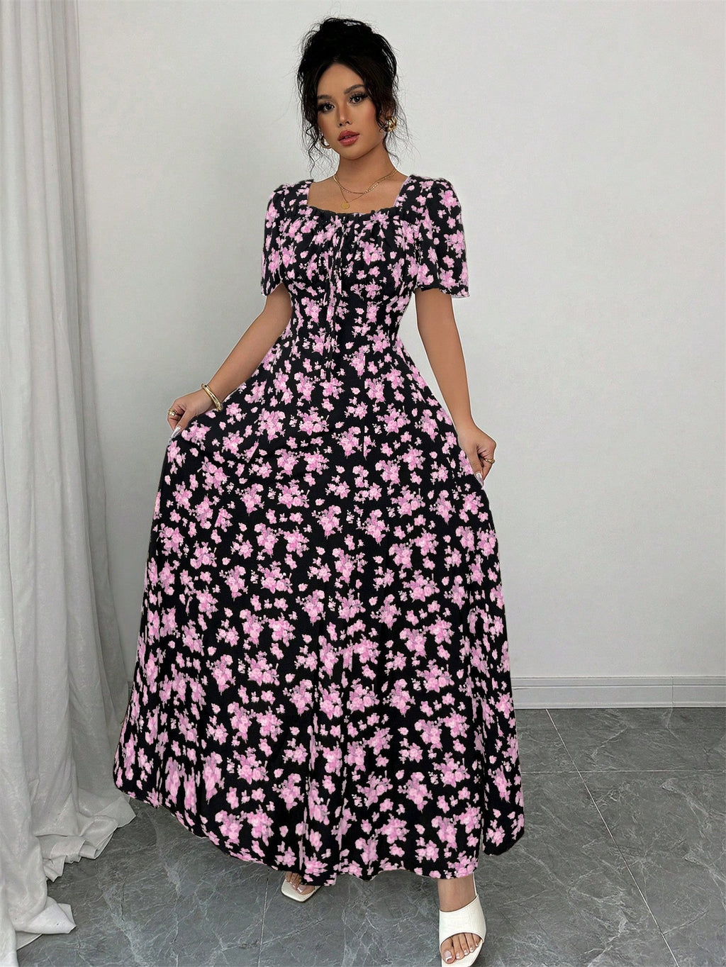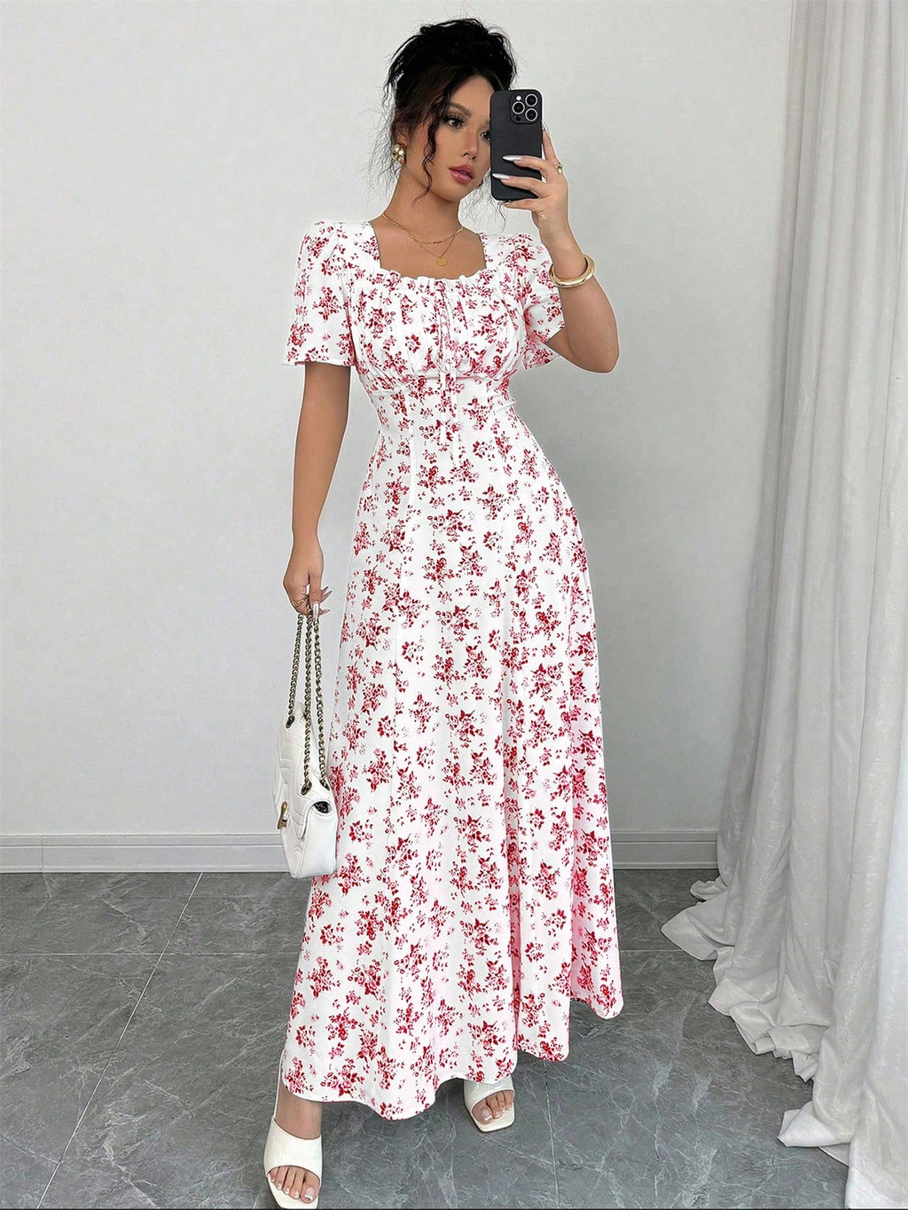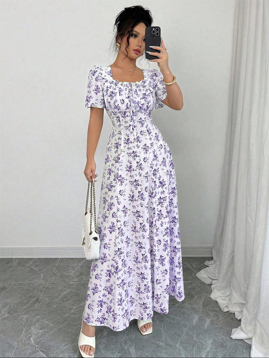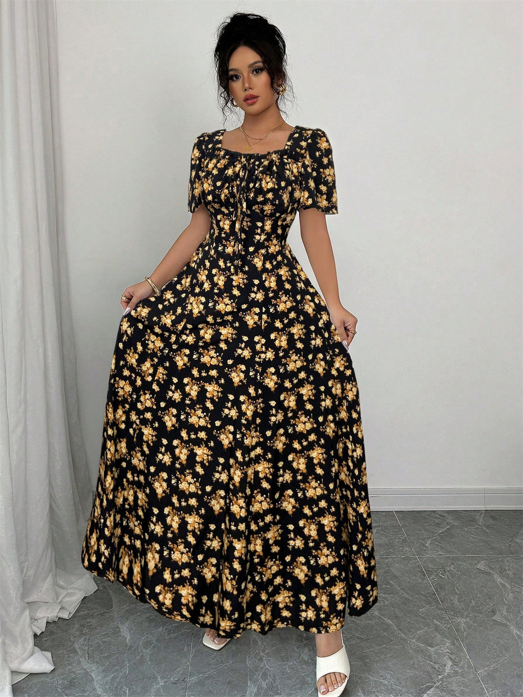 MIU Elegant Resort Casual Puff Sleeve Square Collar Gathered Cinched Waist Dress, Spring/Summer