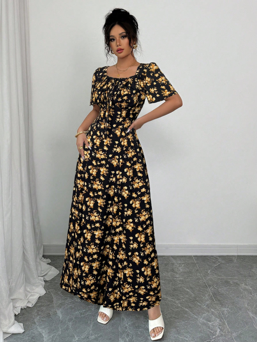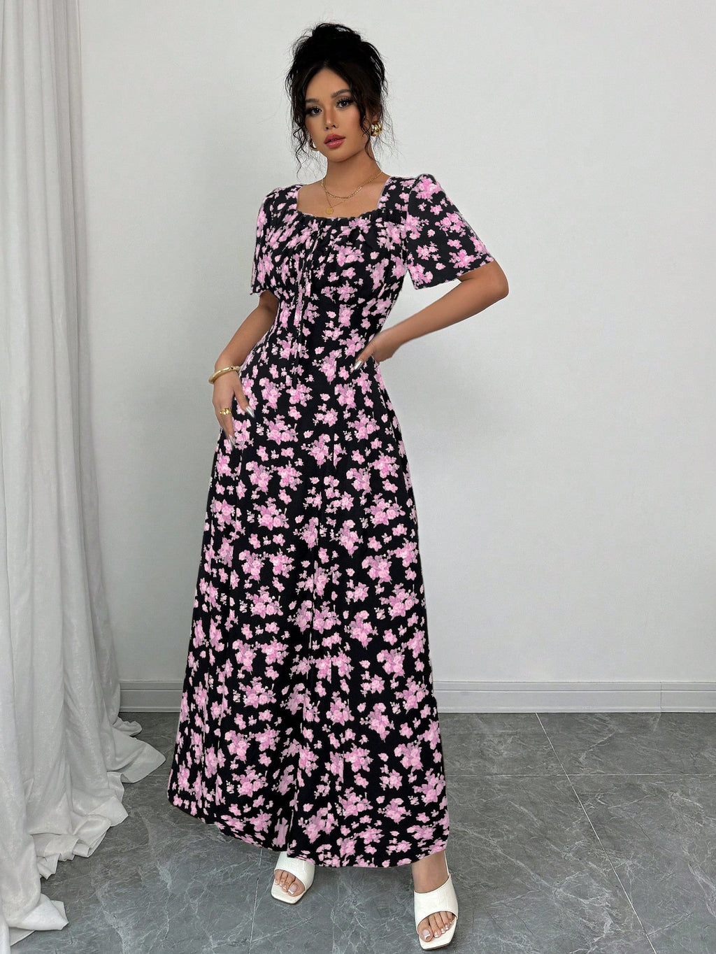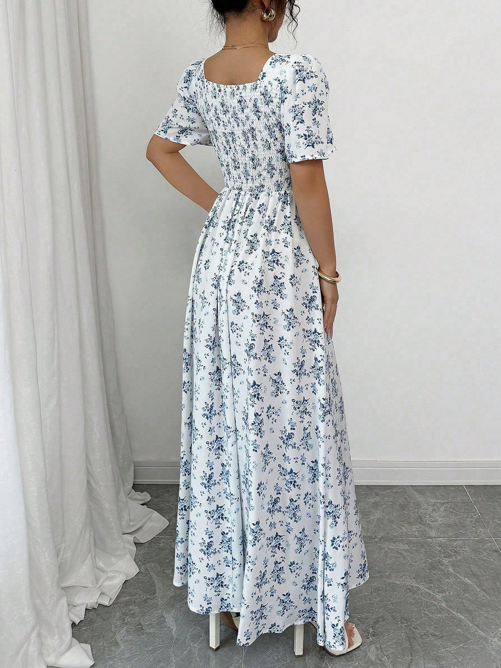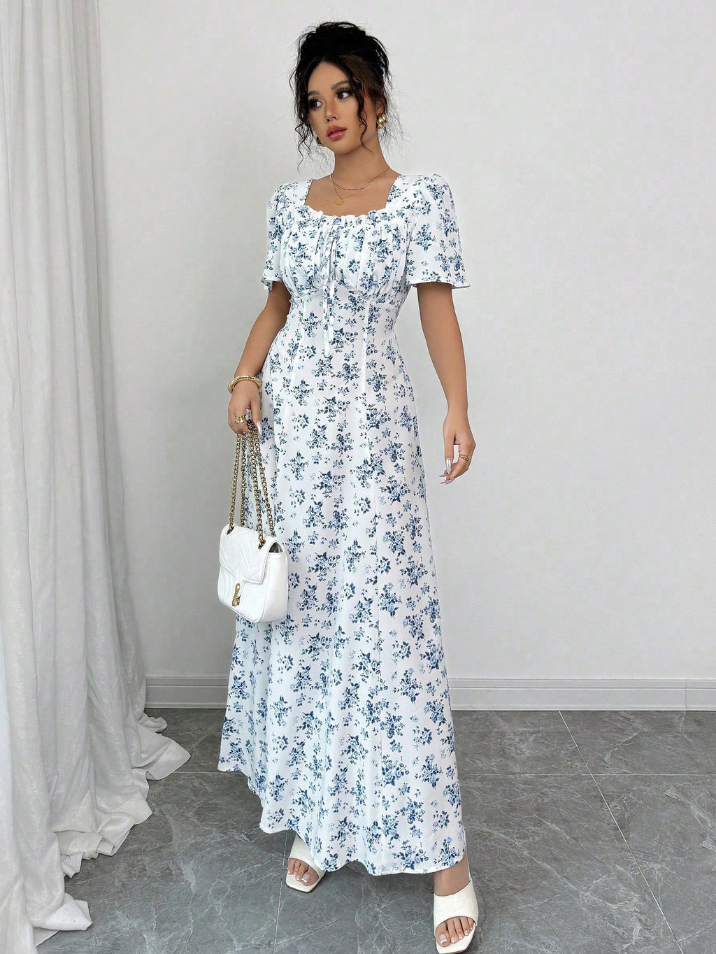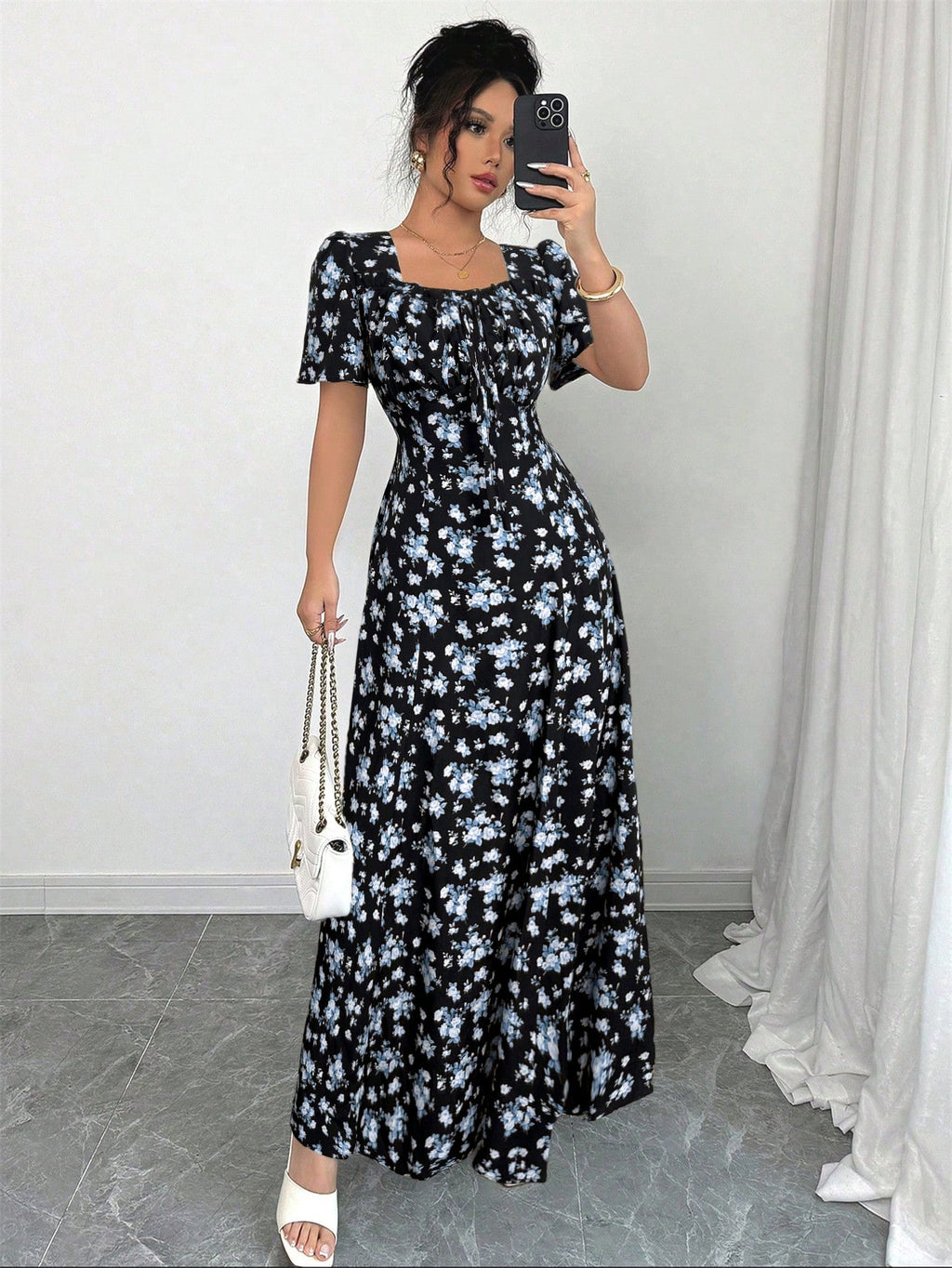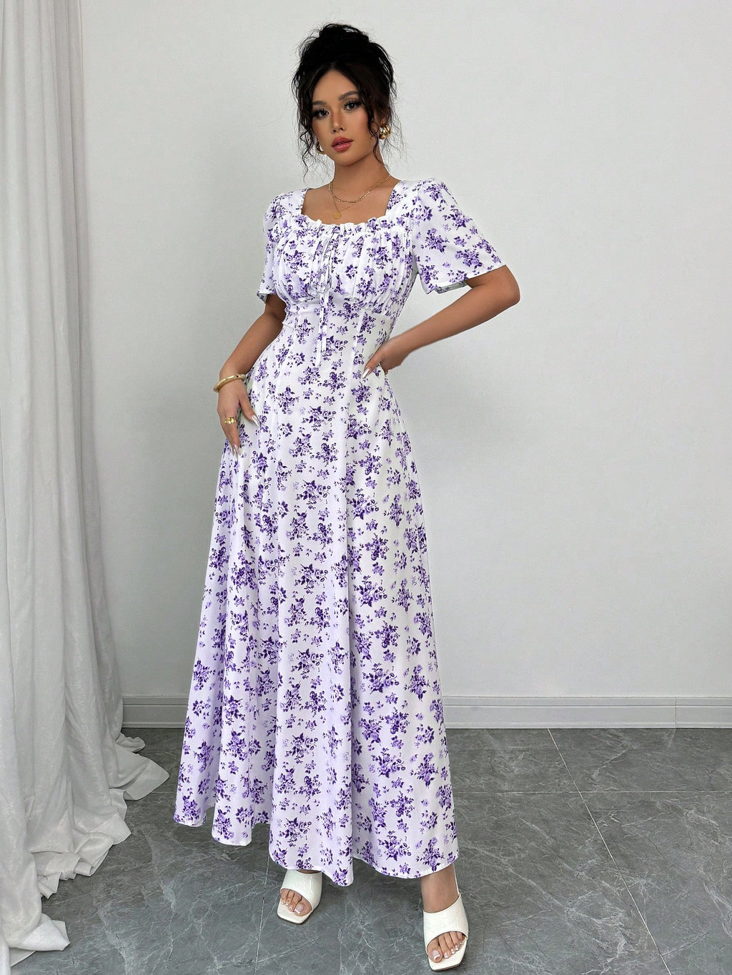 MIU Elegant Resort Casual Puff Sleeve Square Collar Gathered Cinched Waist Dress, Spring/Summer