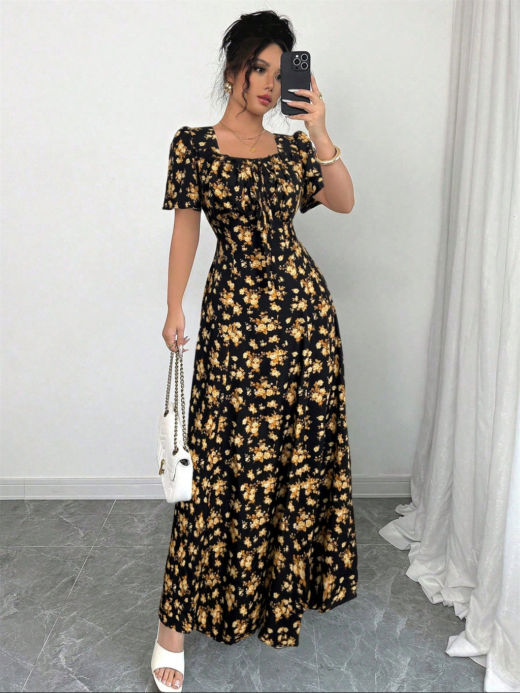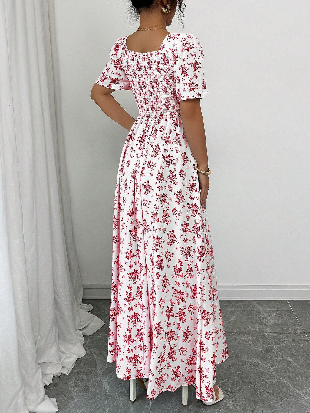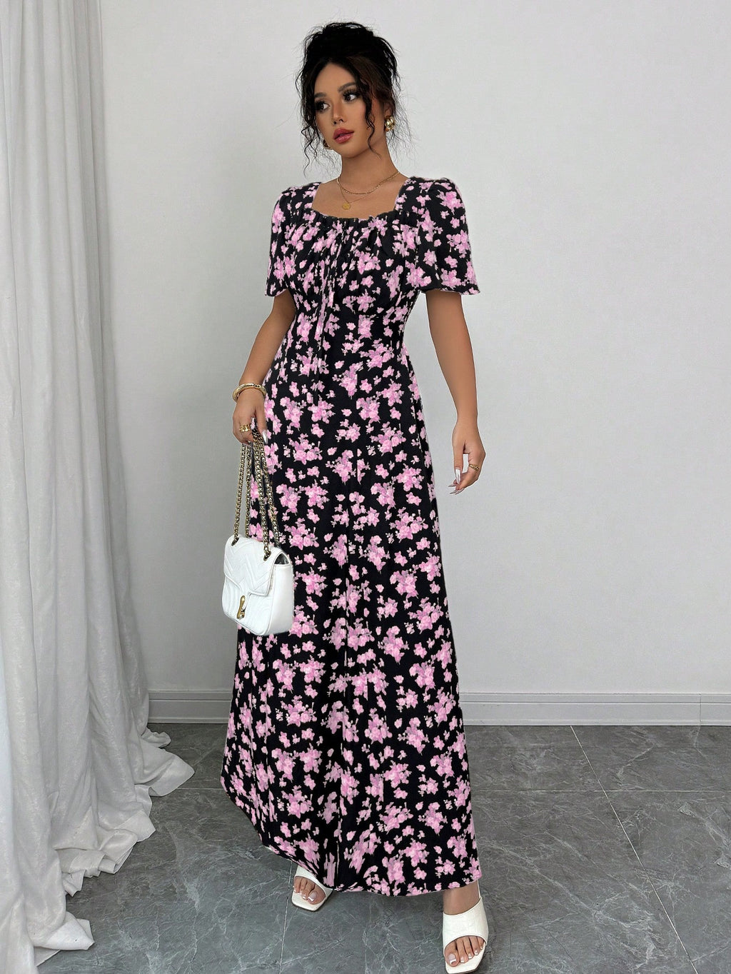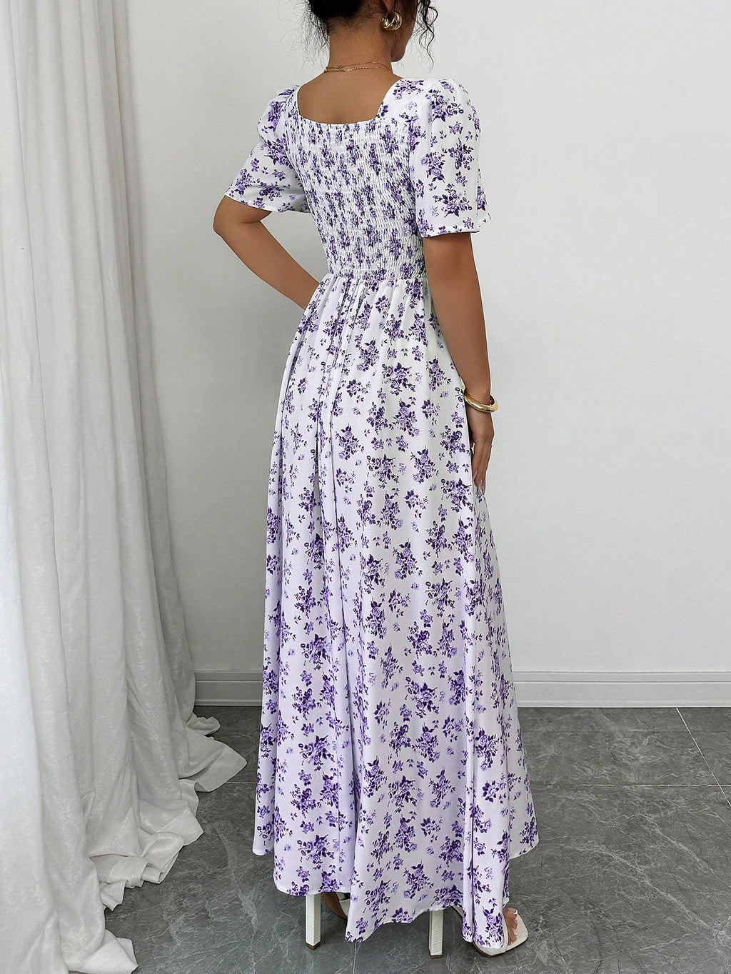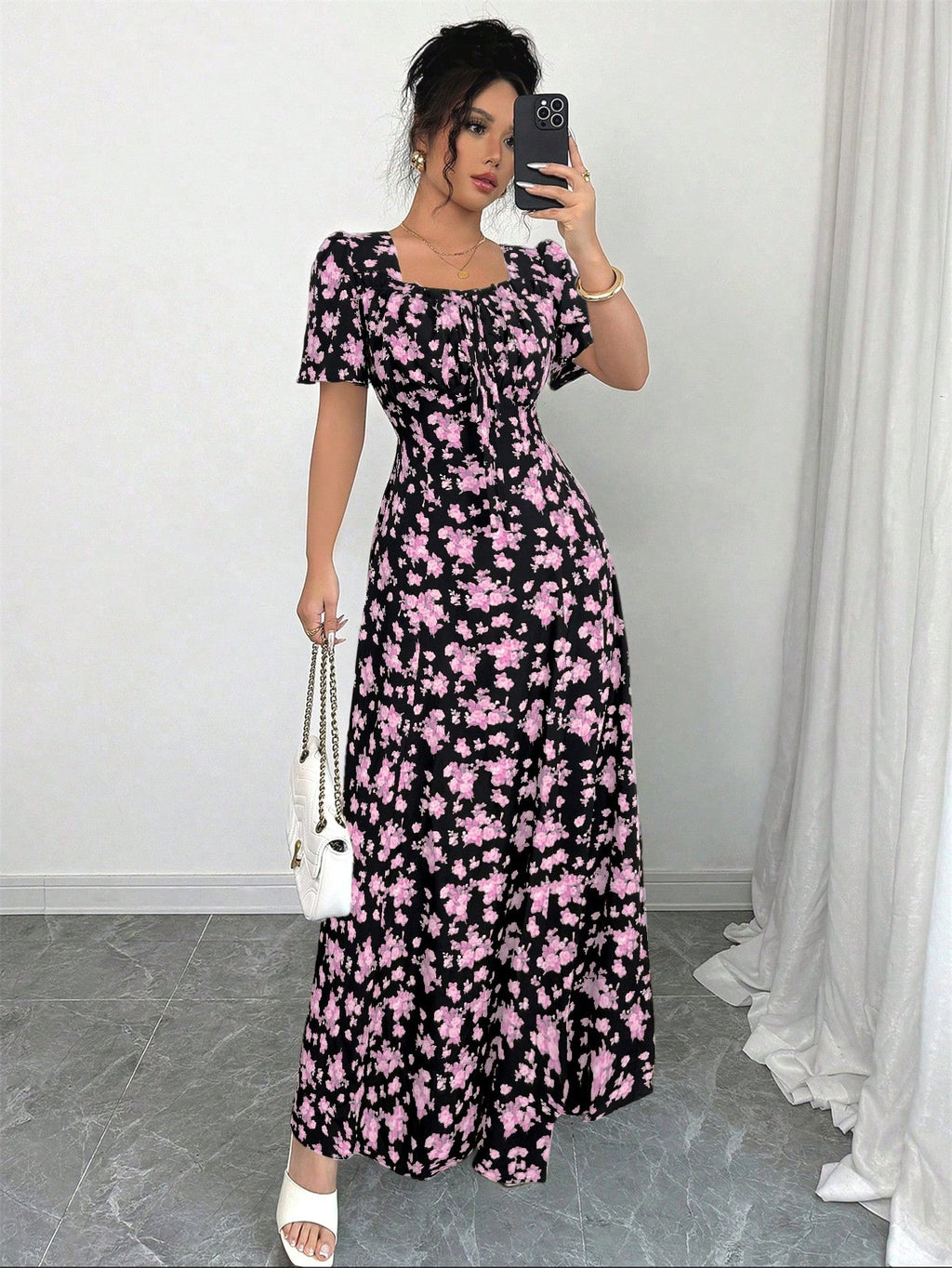 MIU Elegant Resort Casual Puff Sleeve Square Collar Gathered Cinched Waist Dress, Spring/Summer
