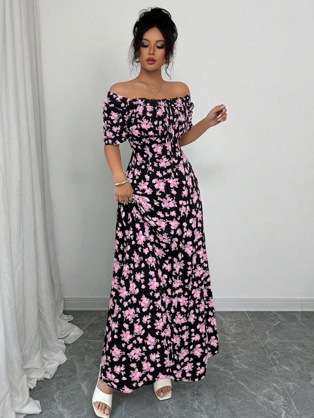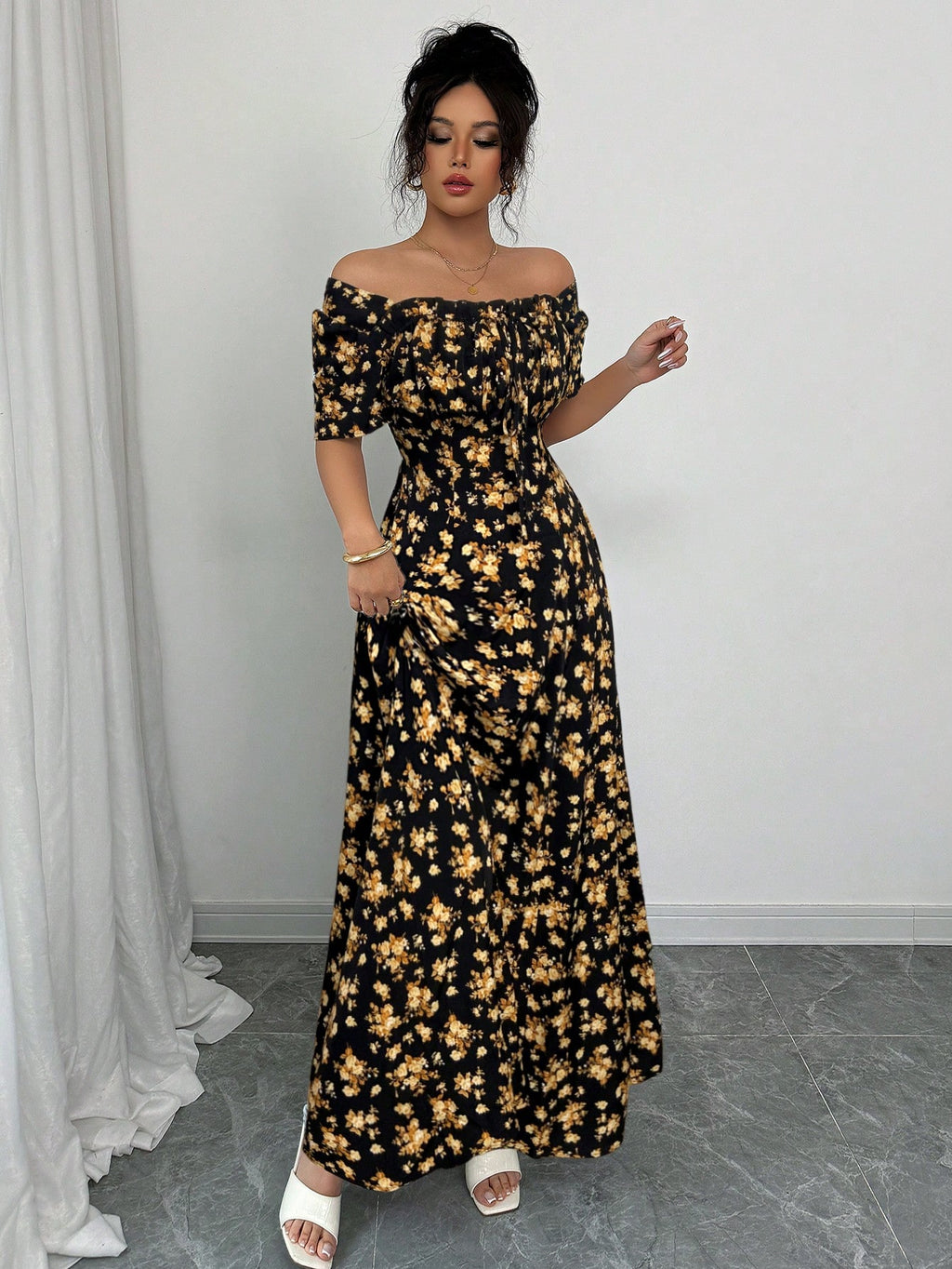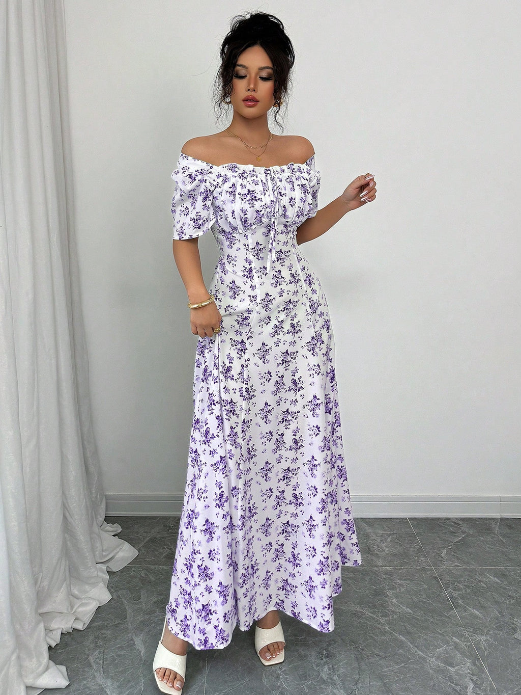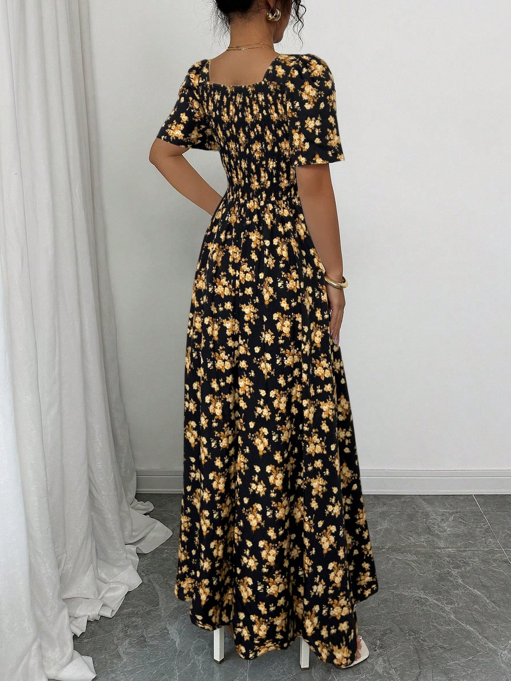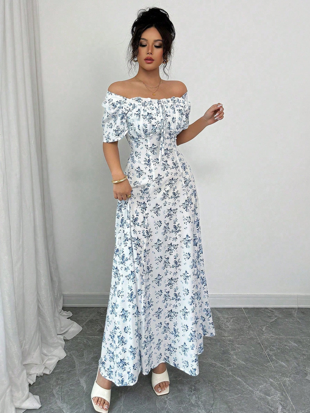 MIU Elegant Resort Casual Puff Sleeve Square Collar Gathered Cinched Waist Dress, Spring/Summer