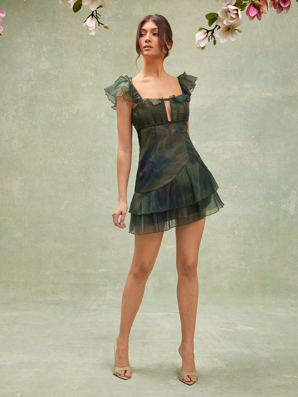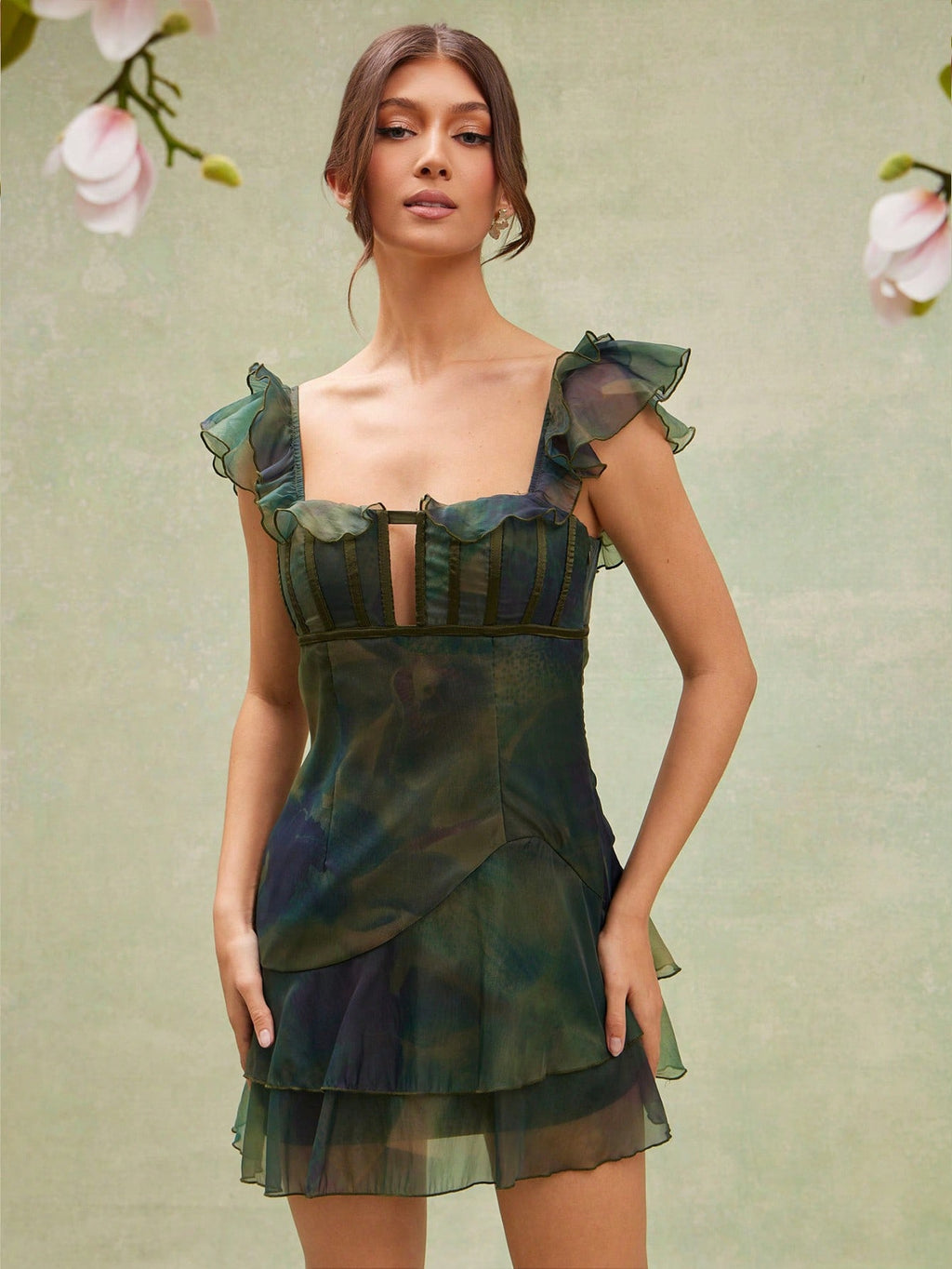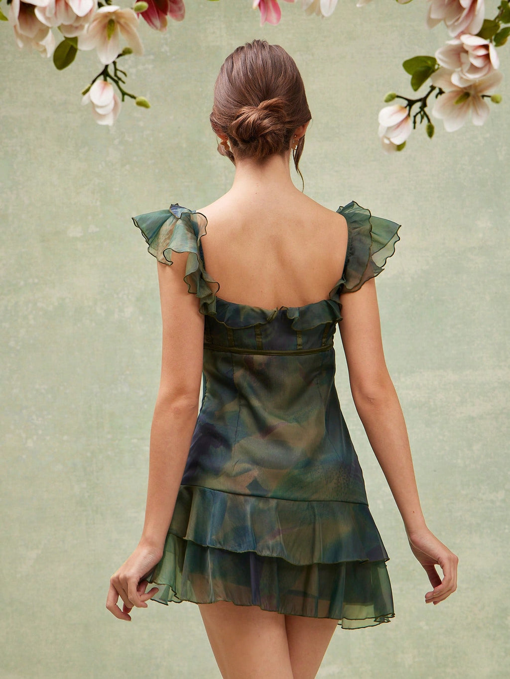 MIU Elegant Ruffle Sleeve Floral Tiered Hem Mini Sun Dress, Easter Dress Women, Summer Outfits For Women