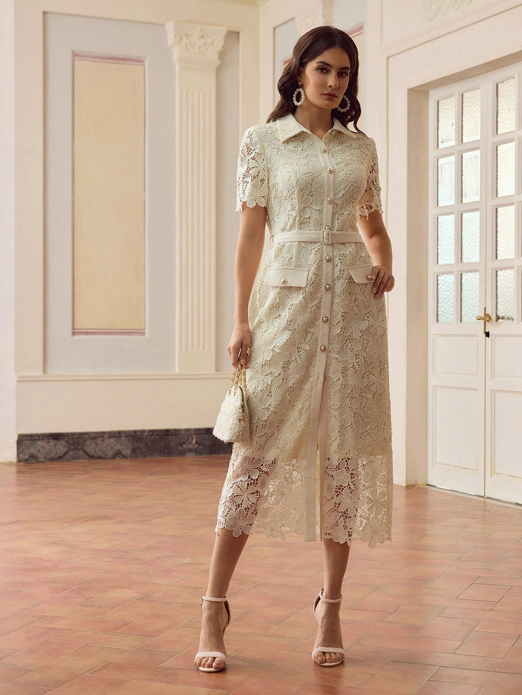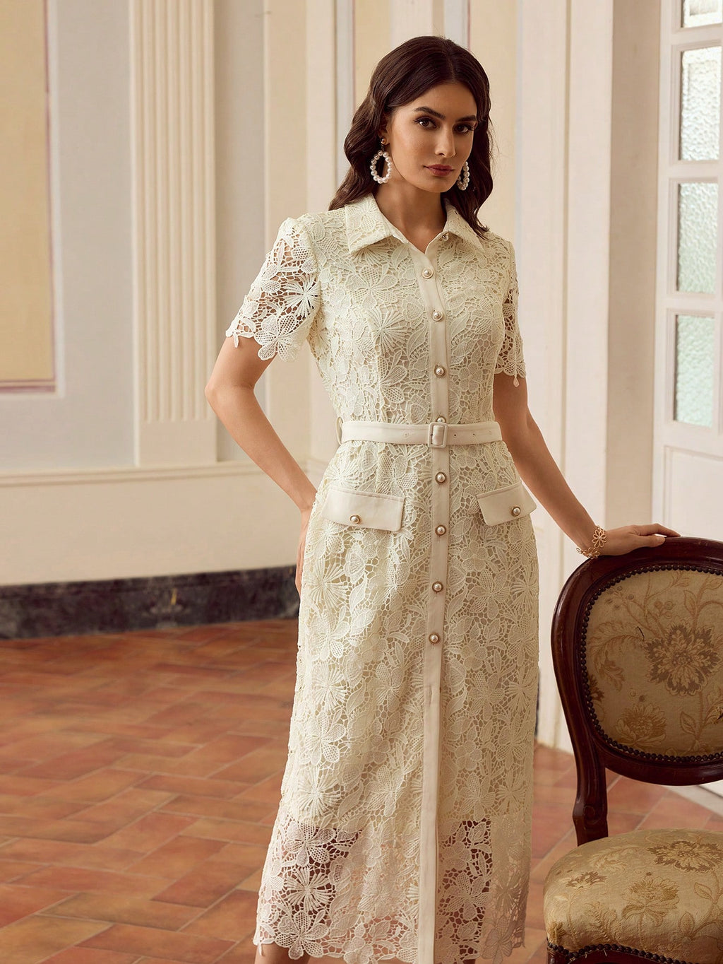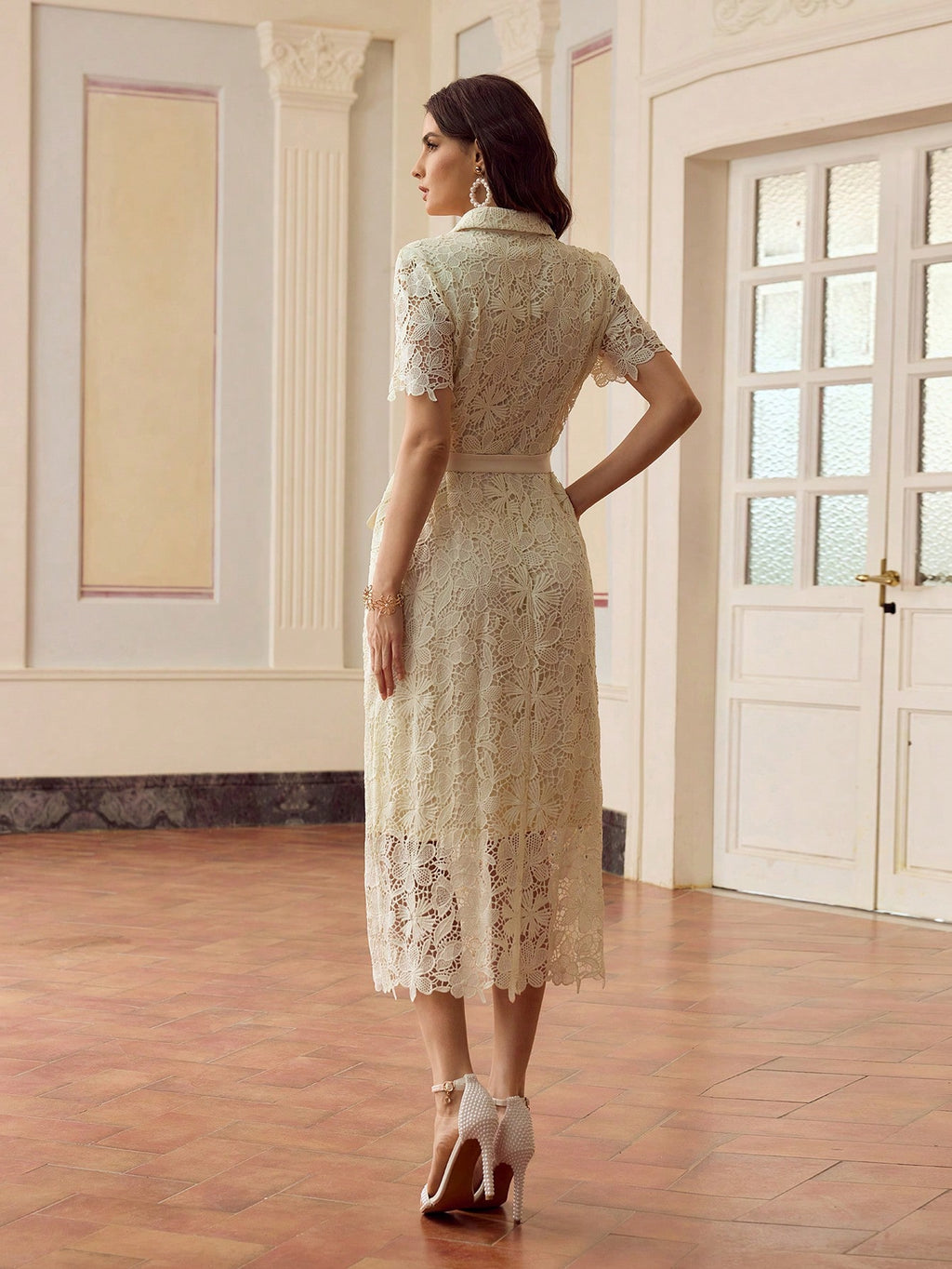 MIU Elegant Short Sleeve Lace Belt Open Front Mid-Length Dress