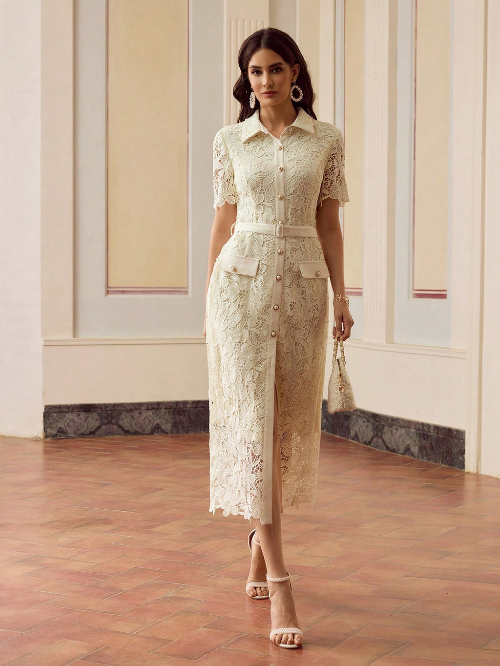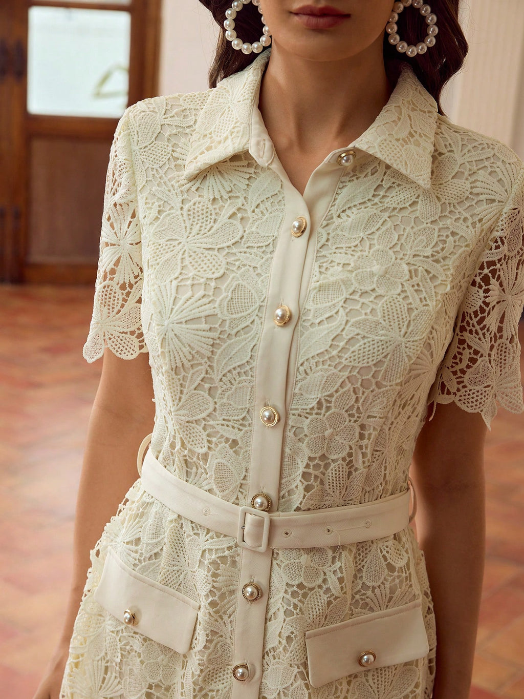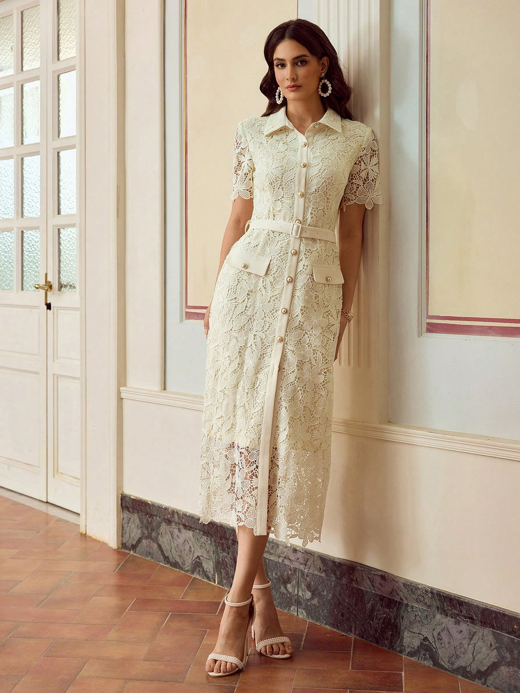 MIU Elegant Short Sleeve Lace Belt Open Front Mid-Length Dress