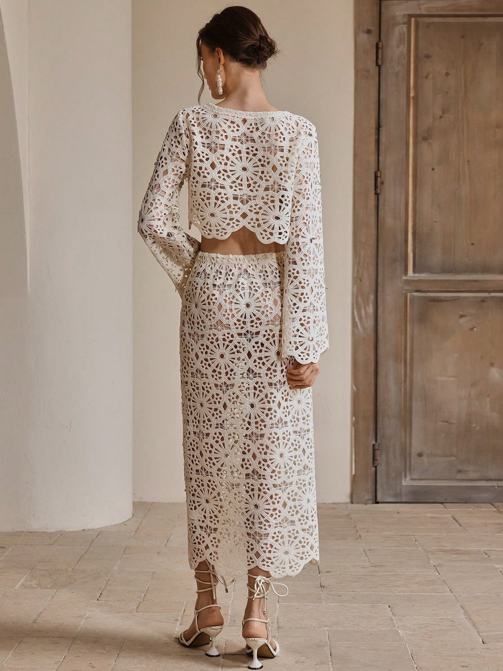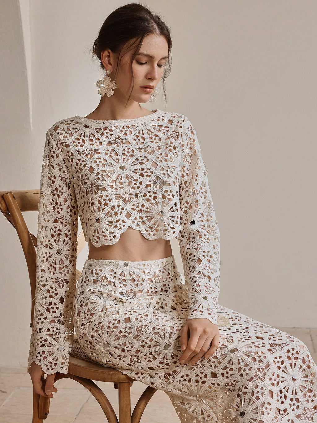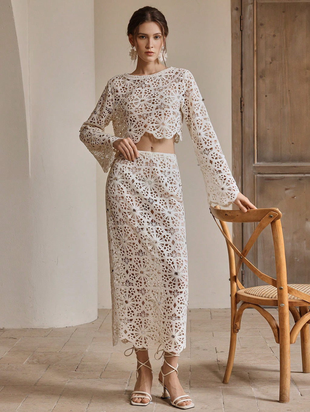 MIU Elegant Vacation Crochet Floral Long Sleeve Top And Skirt Set