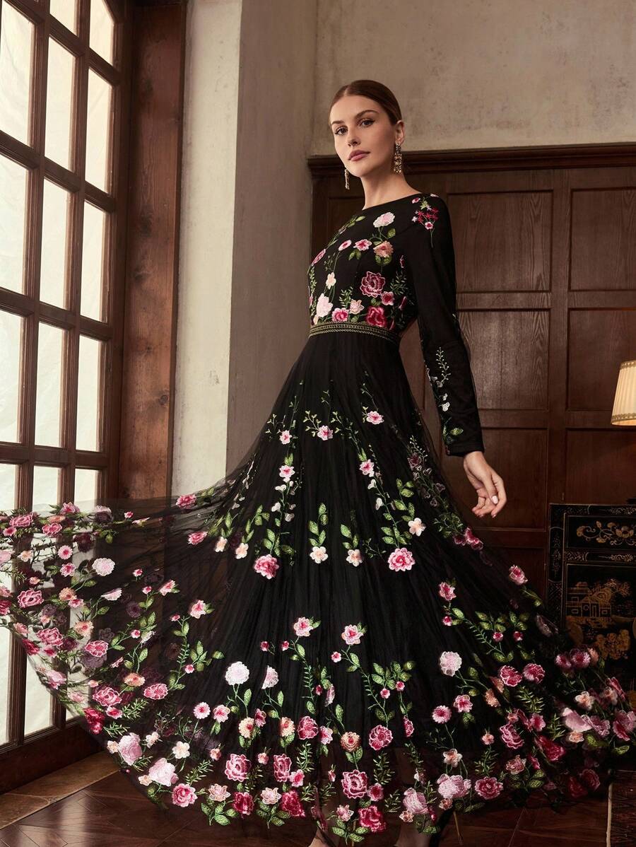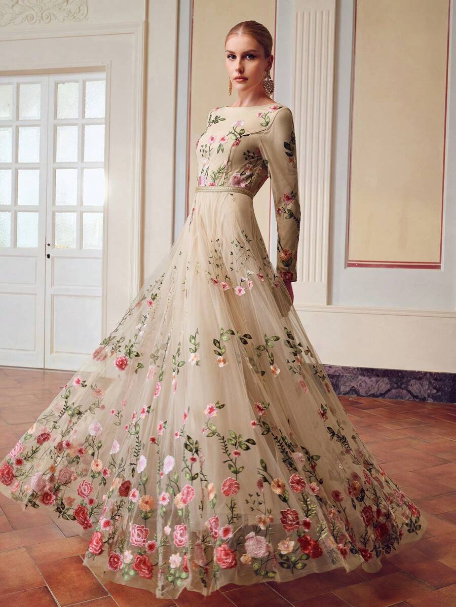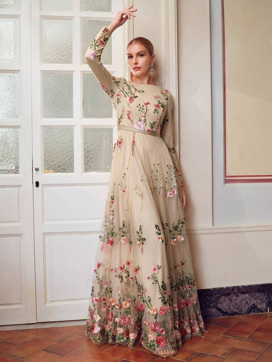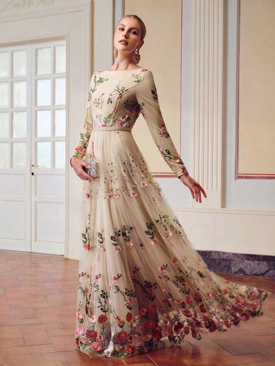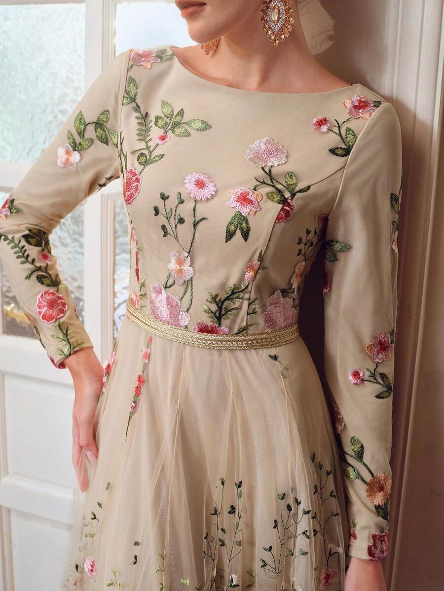 MIU EMBROIDERY MESH FLORAL PATTERN TAPE WAIST Dress