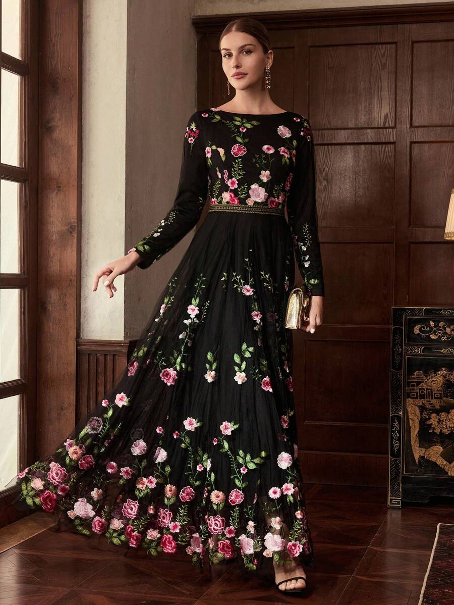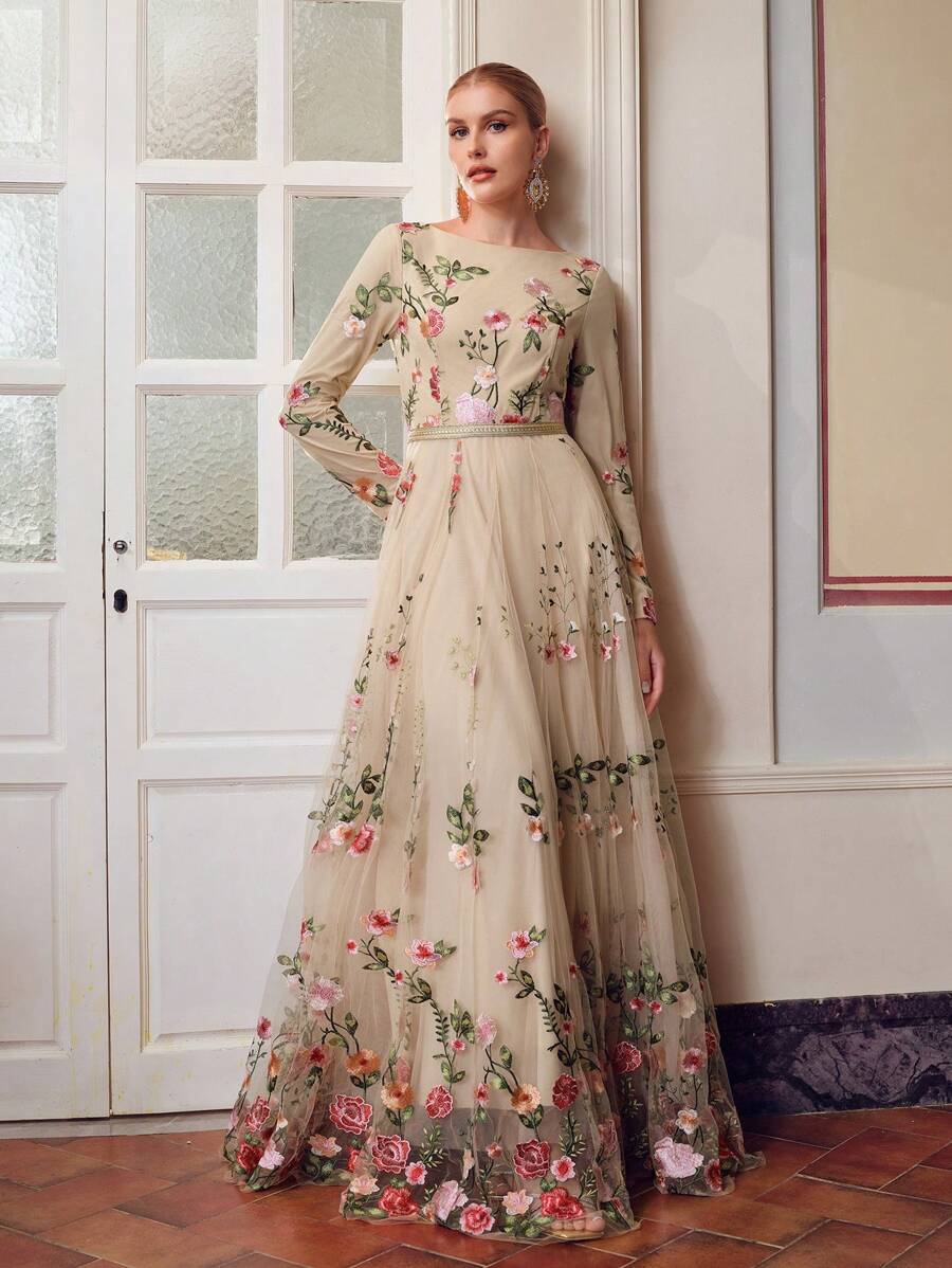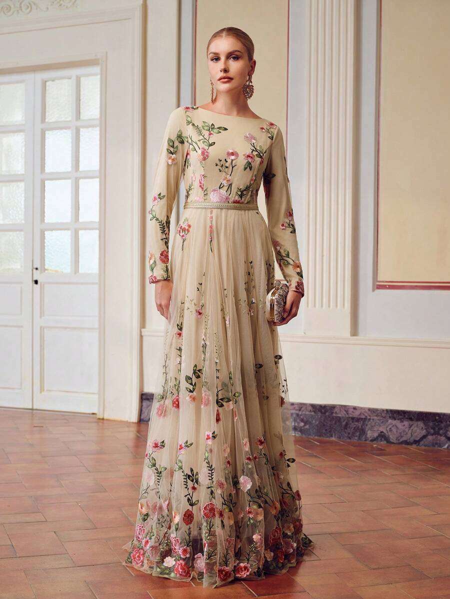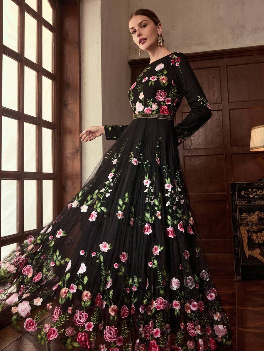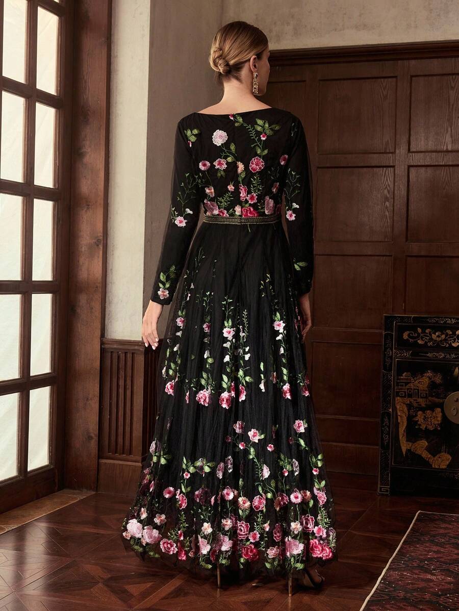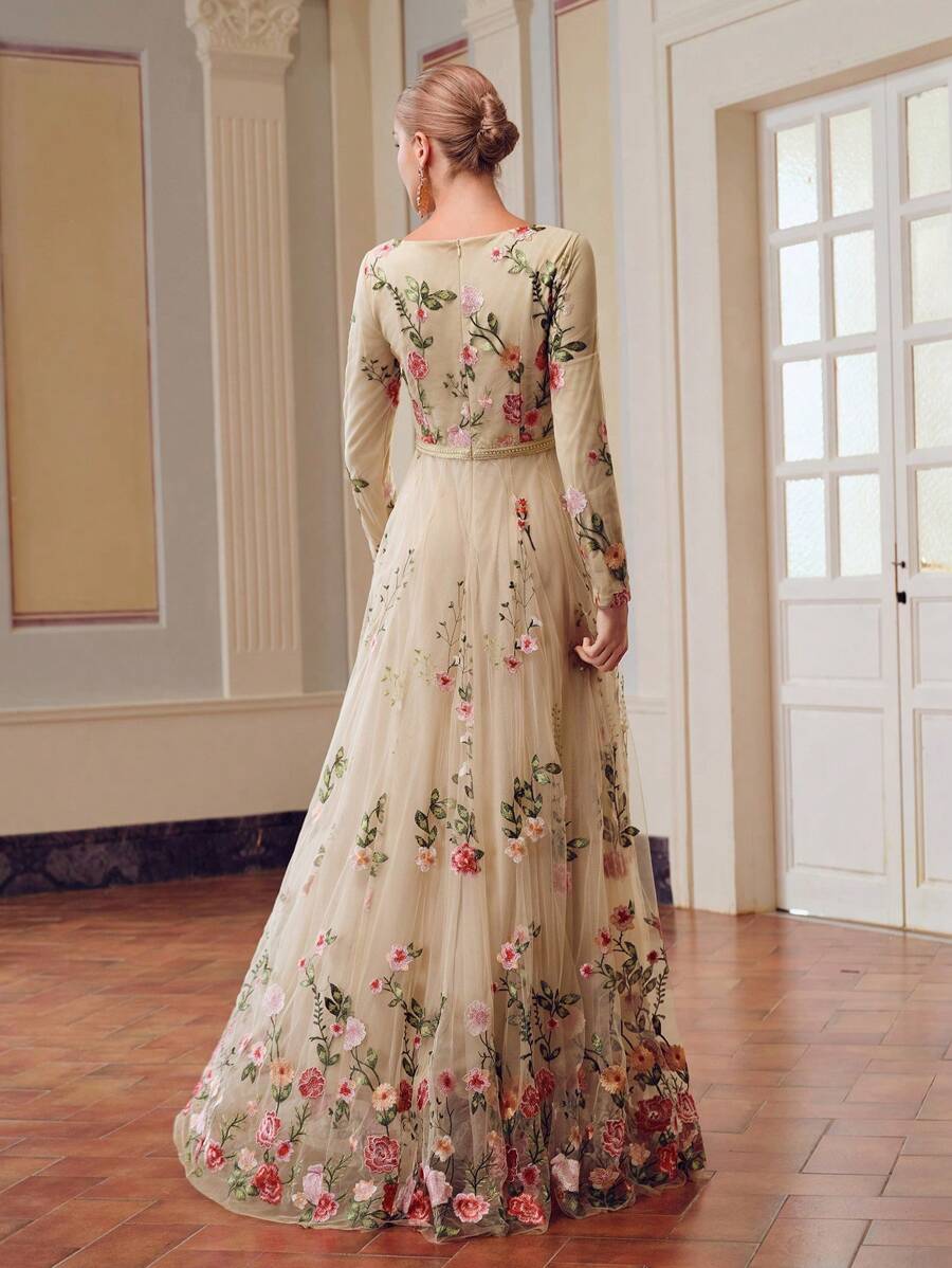 MIU EMBROIDERY MESH FLORAL PATTERN TAPE WAIST Dress