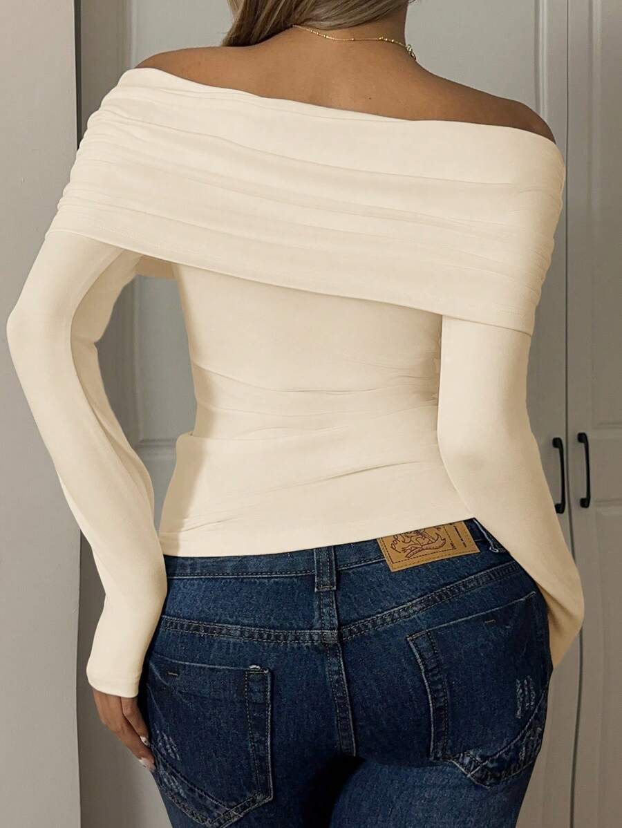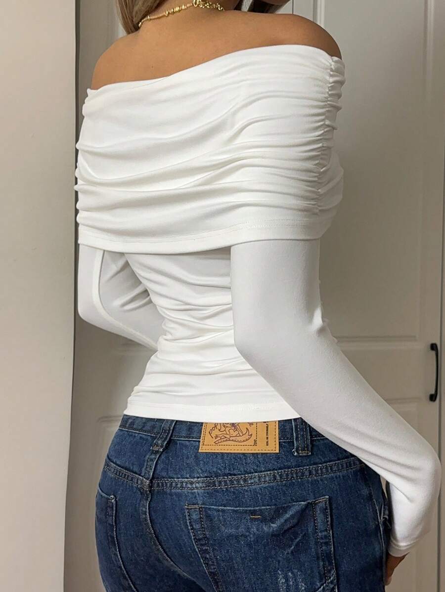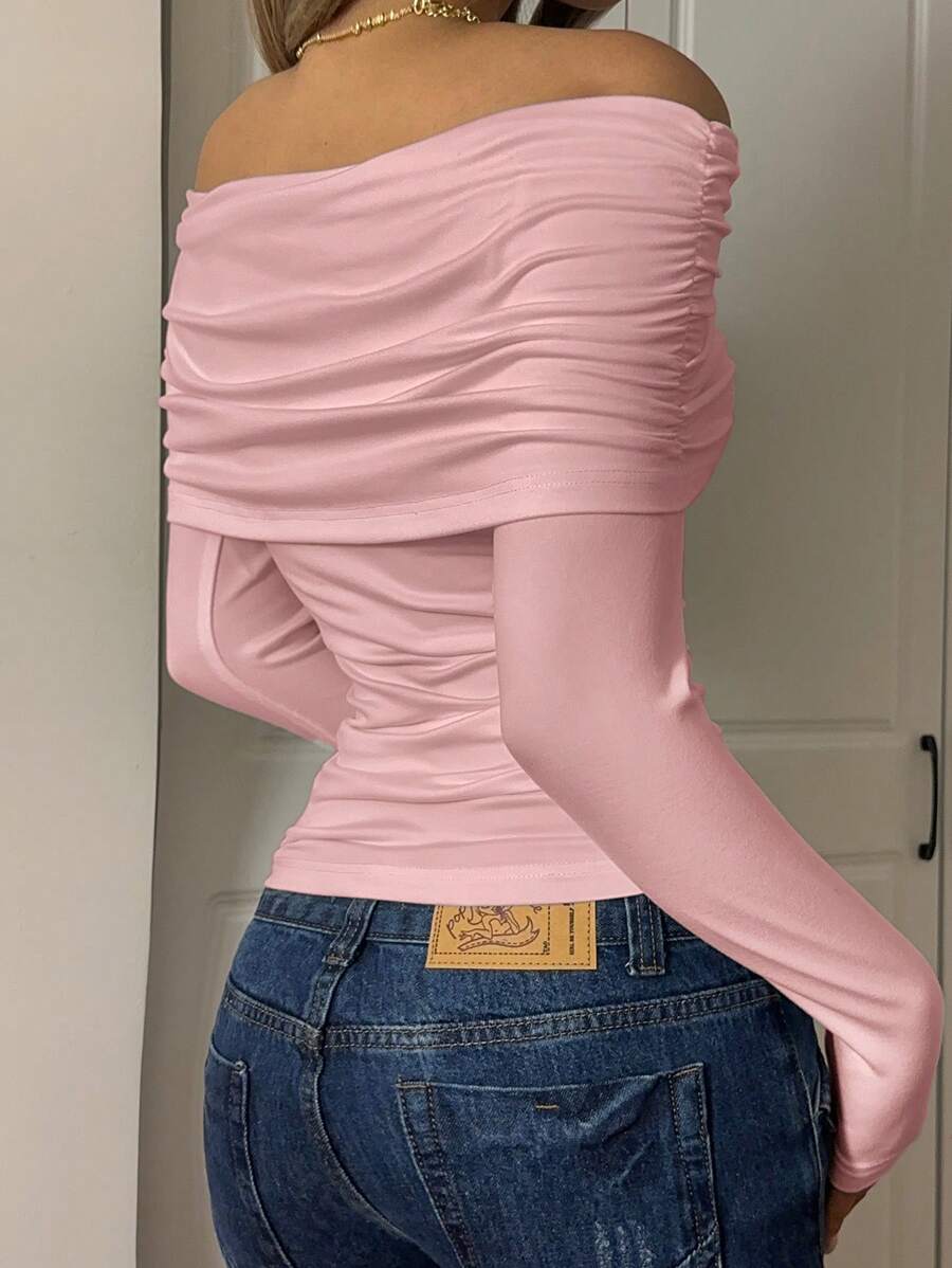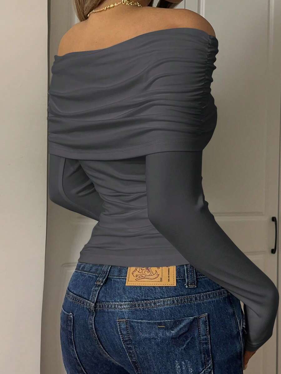 MIU EZwear Brown Casual Knit Off Shoulder Ruched Fitted T-Shirt,Rave Top